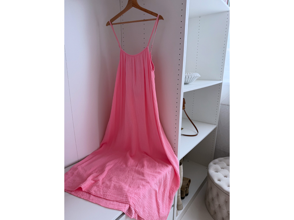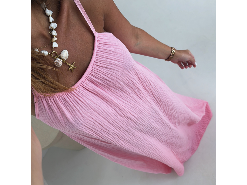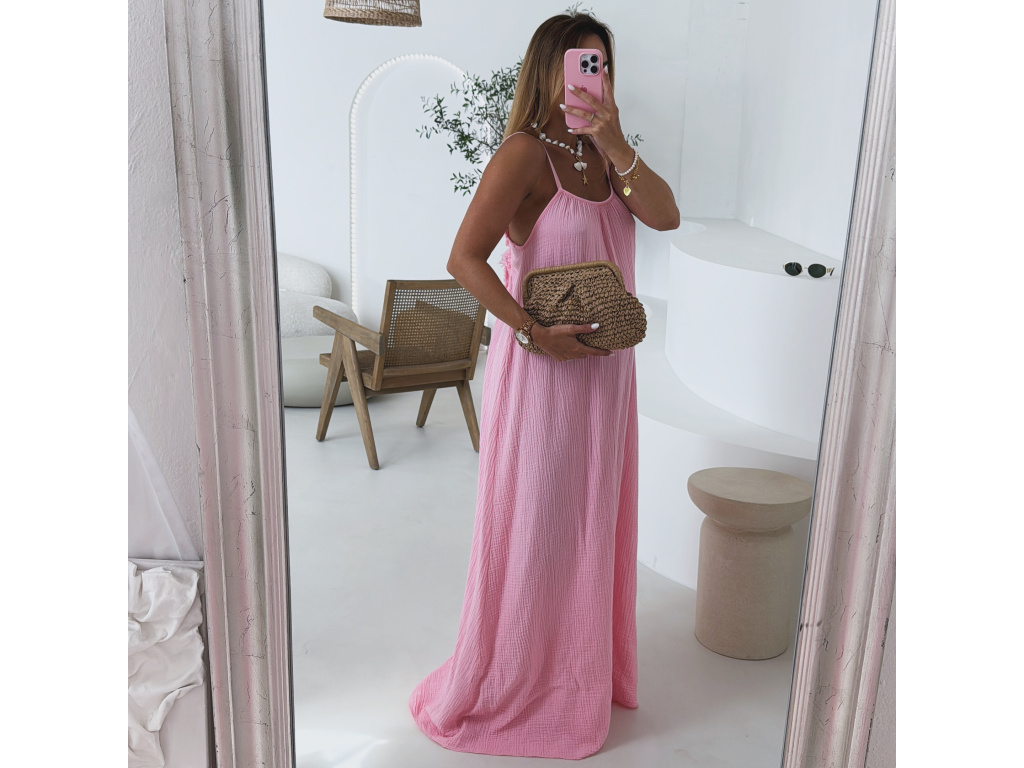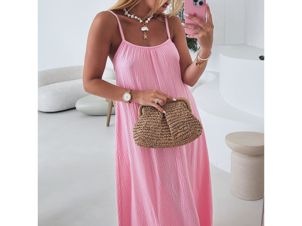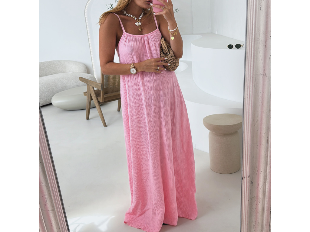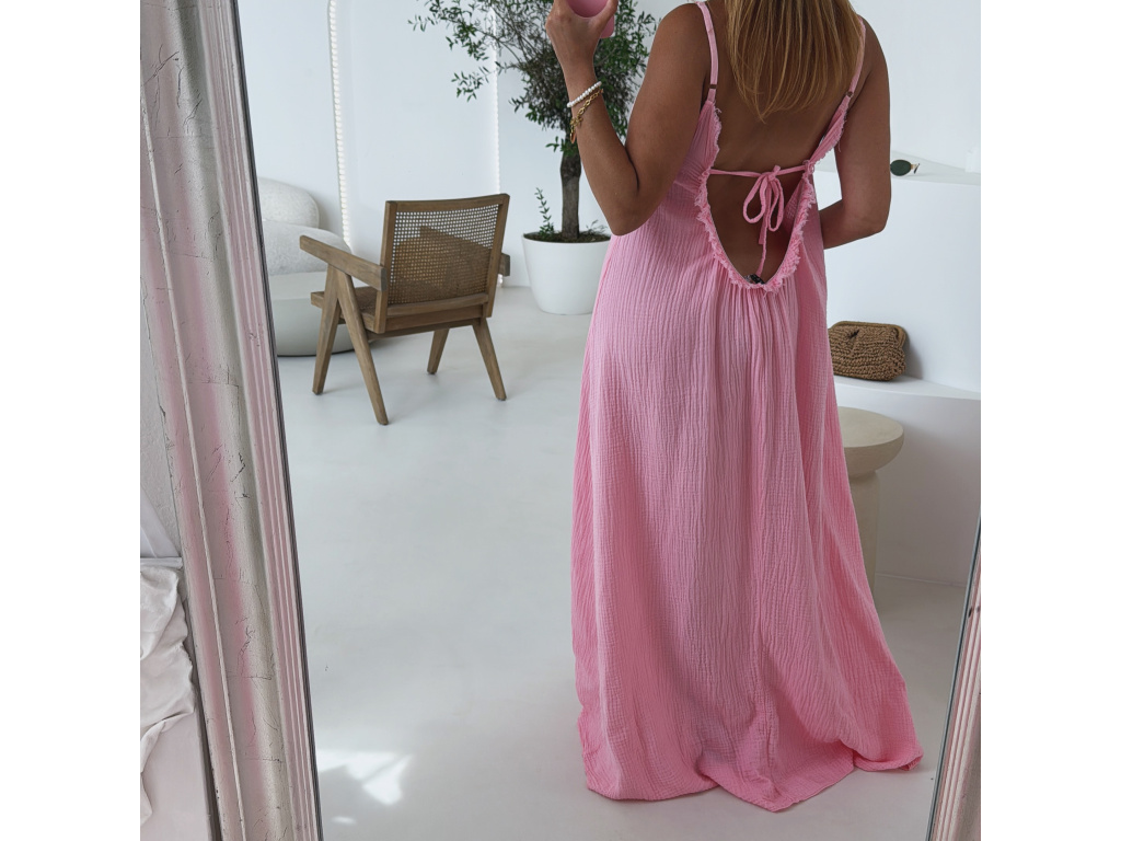 Vzdušné maxi šaty z mušelínu v jemné růžové barvě. Mají hluboký výstřih na zádech s romantickým zavazováním a posuvná ramínka, která umožňují přizpůsobit délku. Volný střih a měkký materiál zajistí pohodlí i v horkých letních dnech – ideální na dovolenou, pláž nebo letní procházky. Velikost je univerzální, sedí na XS - až L.