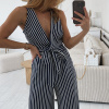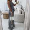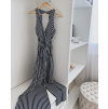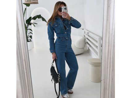 Elegantní, dlouhý overal s proužky z elastického materiálu s výstřihem na zádech v modro-bílé barvě. Overal je v prsou vyztužený a zapíná se na zadní straně na uzávěr. Velikost je S, M a L, sedí o číslo méně (S na XS, M na S a L na M). Nohavice jsou širokého střihu. Velikost S je focena na velikosti XS a výšce 165 cm.