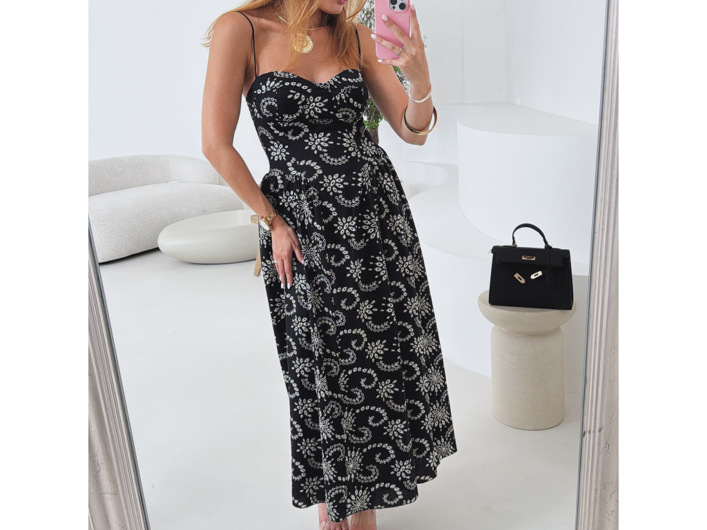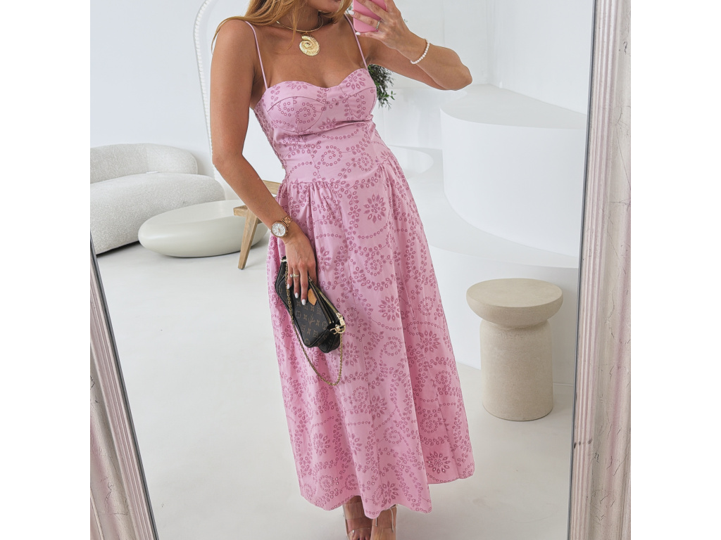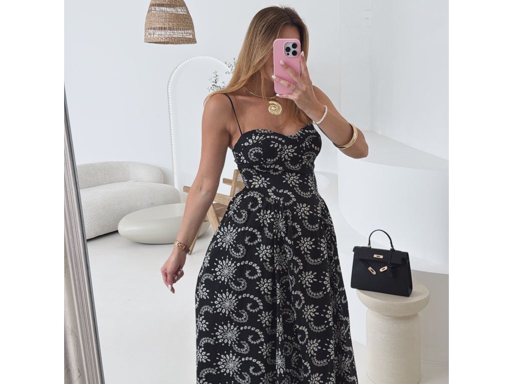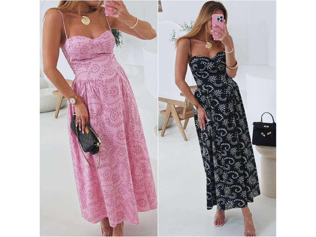 Romantické midi šaty na špagetová, pružná ramínka s jemnou výšivkou a ženským střihem, který lichotí postavě. Vystužený živůtek vytváří krásný dekolt, zatímco žabičkování na zádech zajišťuje pohodlné přizpůsobení postavě. Lehký materiál a áčkový střih sukně z nich dělají ideální kousek na letní večery, oslavy i běžné nošení s elegancí. Šaty mají podšívku. Velikost je univerzální, sedí na XS až M.