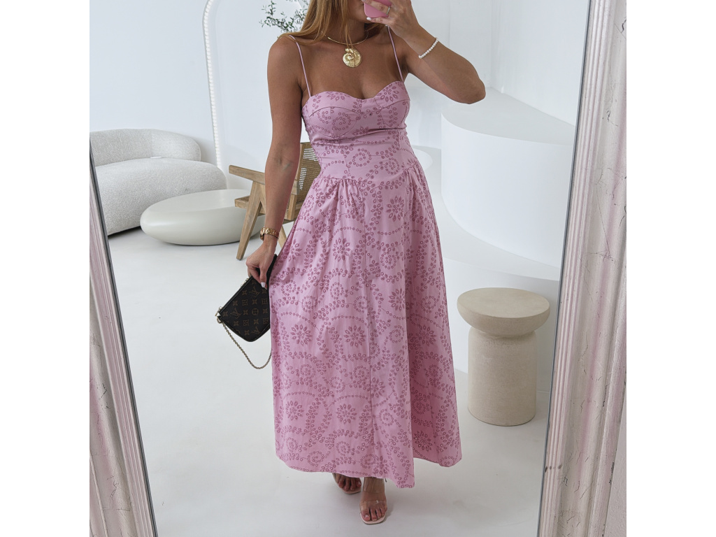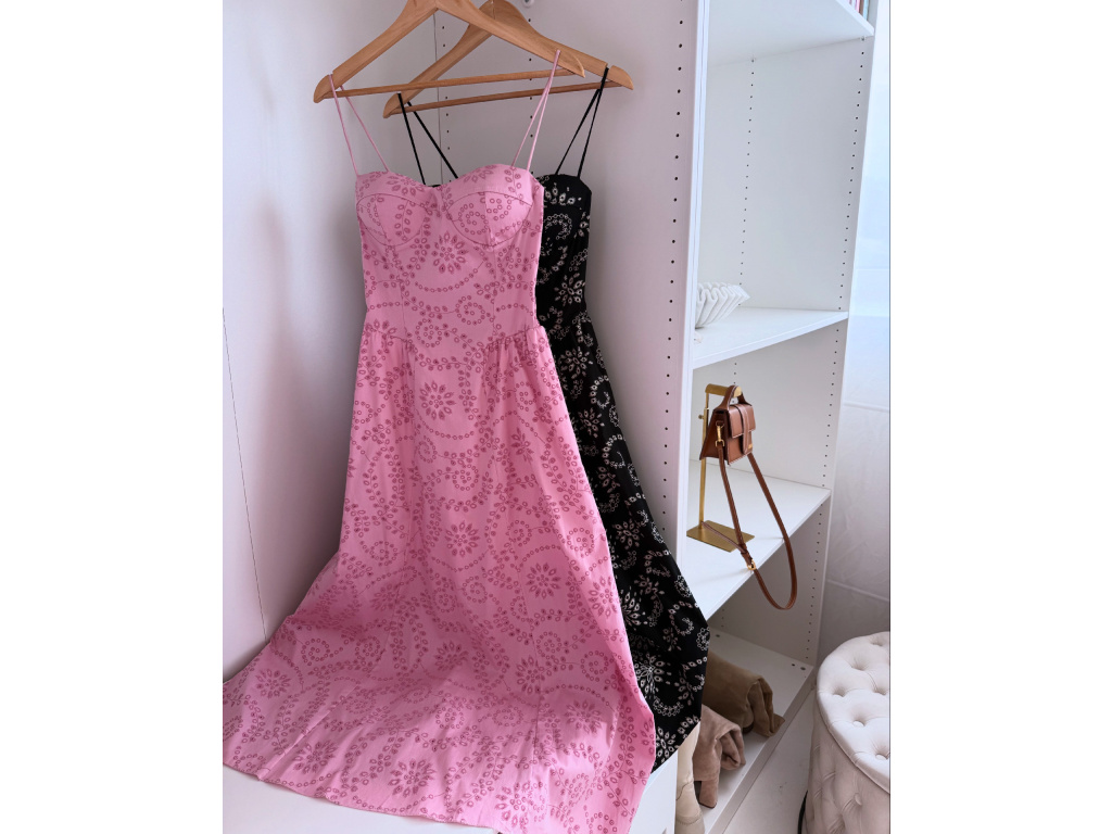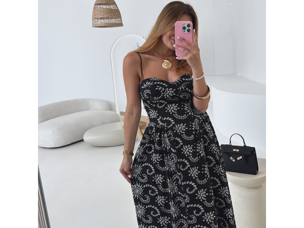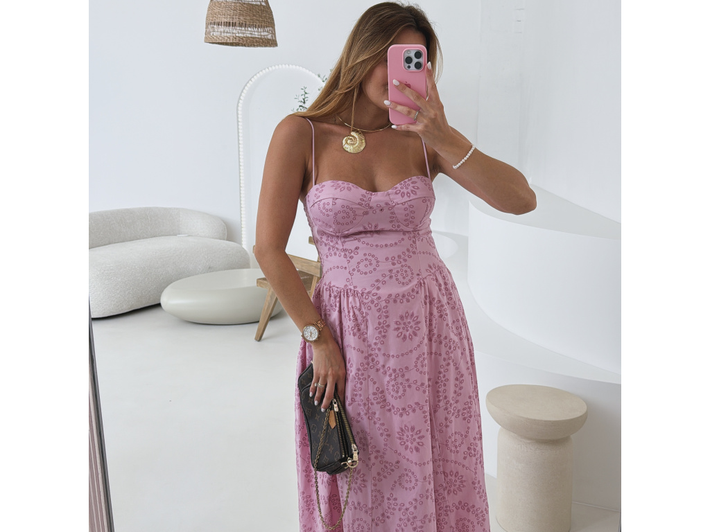 Romantické midi šaty na špagetová, pružná ramínka s jemnou výšivkou a ženským střihem, který lichotí postavě. Vystužený živůtek vytváří krásný dekolt, zatímco žabičkování na zádech zajišťuje pohodlné přizpůsobení postavě. Lehký materiál a áčkový střih sukně z nich dělají ideální kousek na letní večery, oslavy i běžné nošení s elegancí. Šaty mají podšívku. Velikost je univerzální, sedí na XS až M.