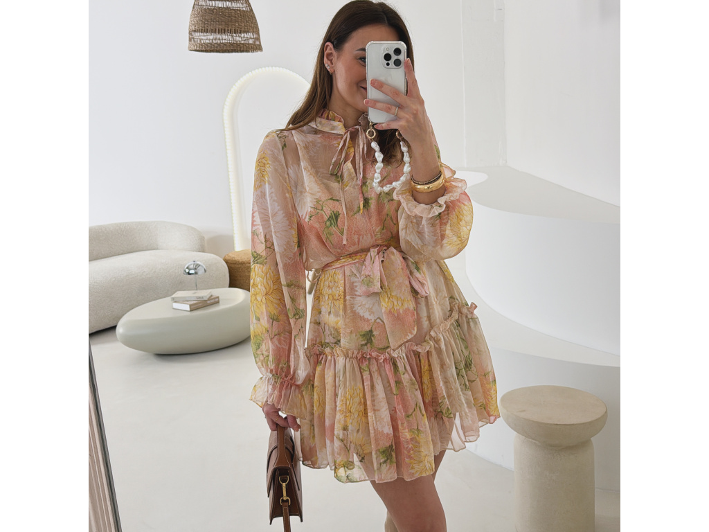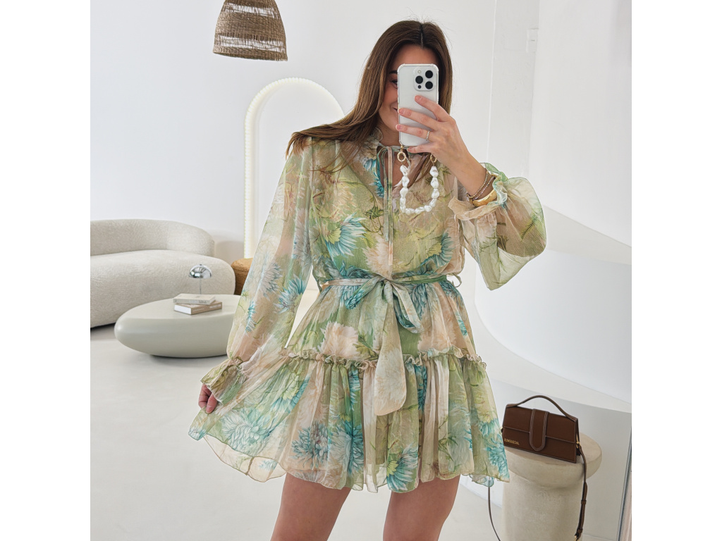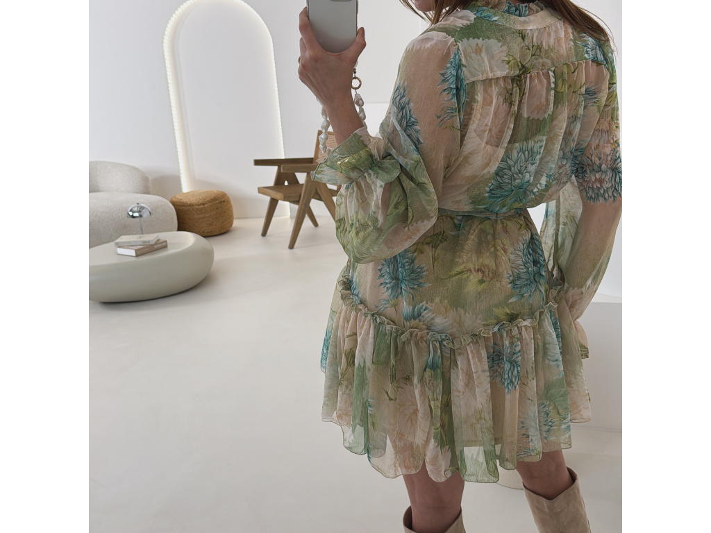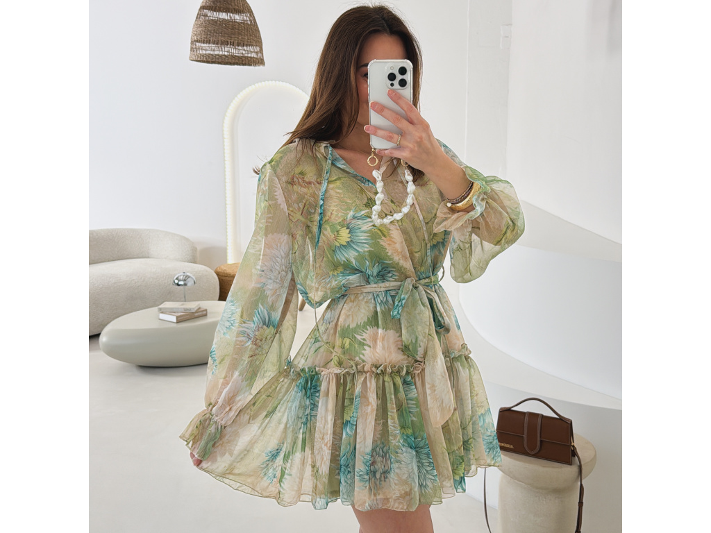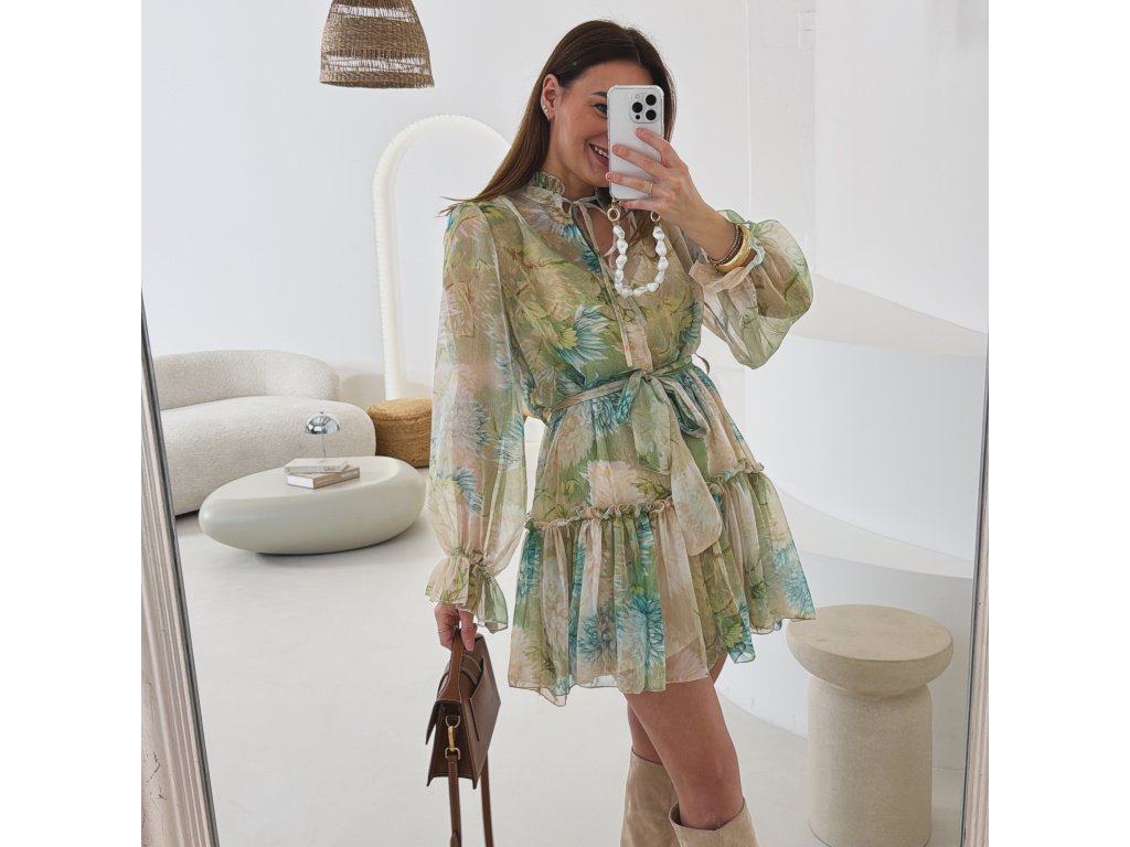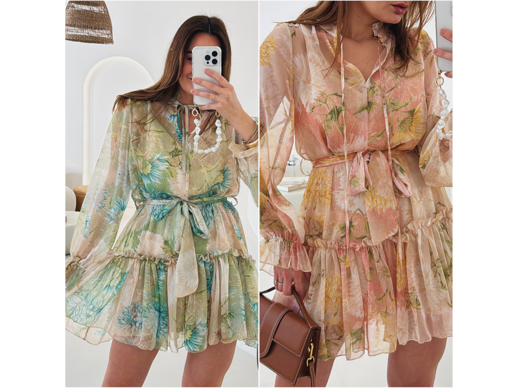 Romantické šaty z jemného, lehce průsvitného materiálu s květinovým potiskem. Součástí je pásek pro zvýraznění pasu a samostatná podšívka v tělové barvě, která zajistí pohodlí i dostatečné krytí. Lehký, vzdušný střih působí velmi žensky a elegantně. Dostupné v zelené a růžové variantě.