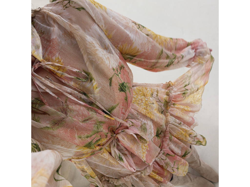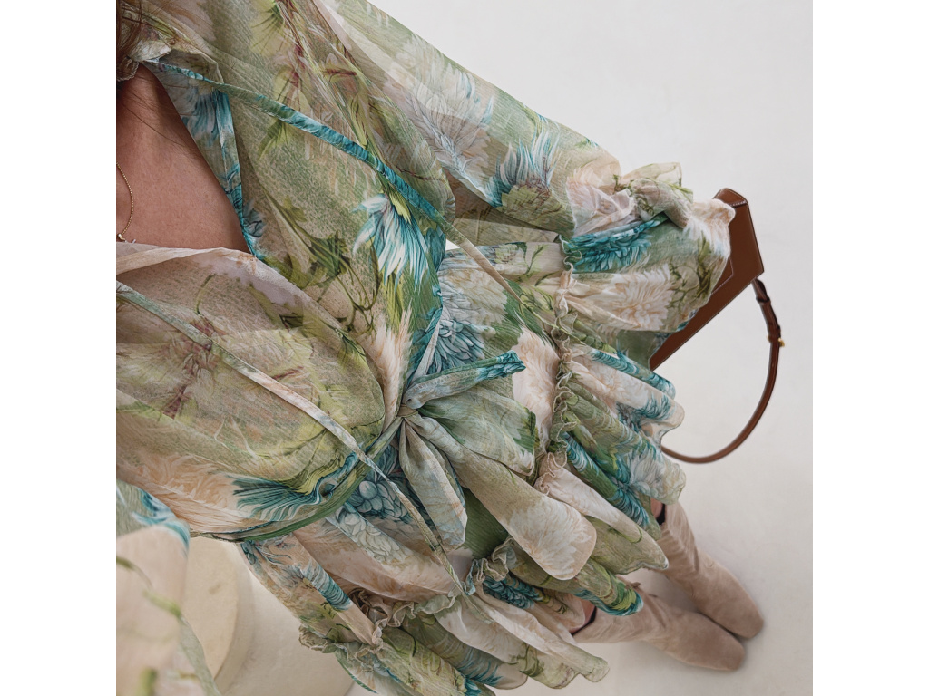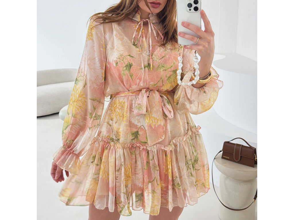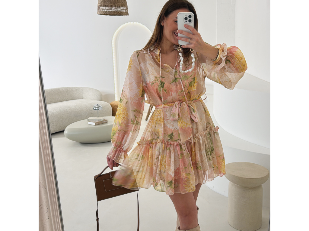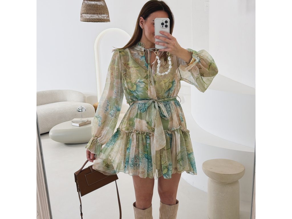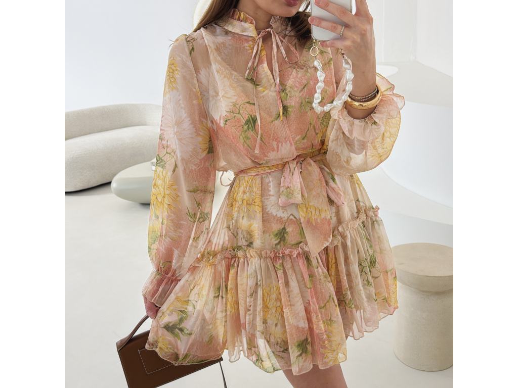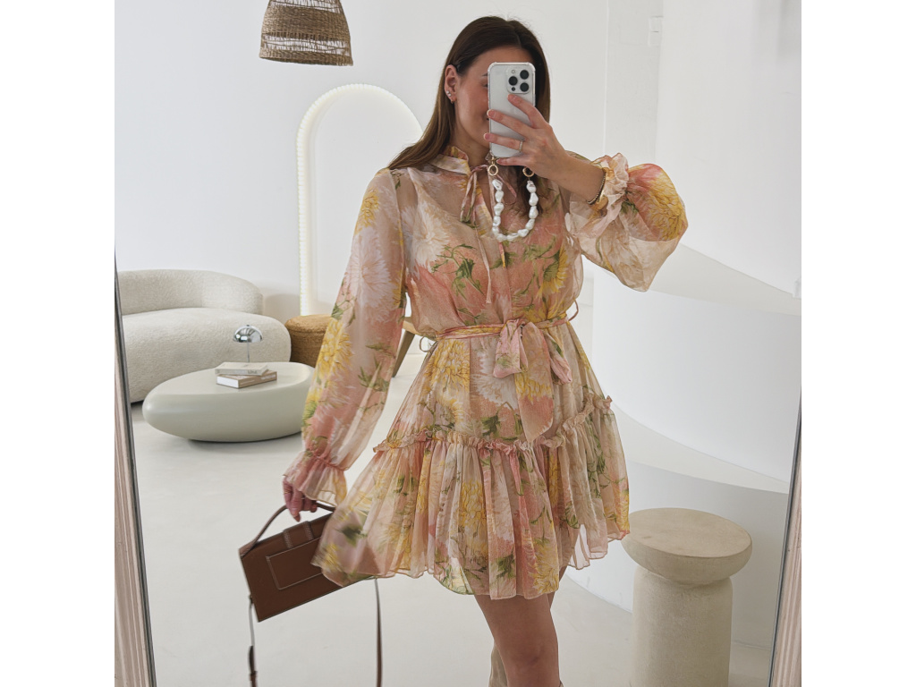 Romantické šaty z jemného, lehce průsvitného materiálu s květinovým potiskem. Součástí je pásek pro zvýraznění pasu a samostatná podšívka v tělové barvě, která zajistí pohodlí i dostatečné krytí. Lehký, vzdušný střih působí velmi žensky a elegantně. Dostupné v zelené a růžové variantě.