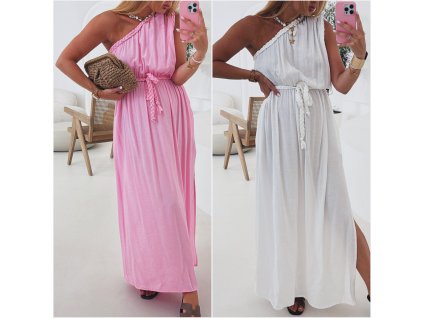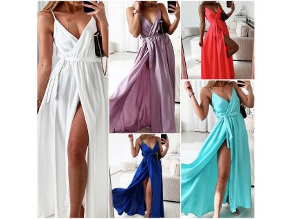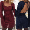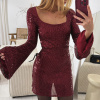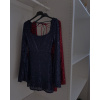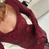 Šatový overal s hlubokým výstřihem na zádech v červené a tmavě modré barvě s flitry. Šaty mají v celé délce podšívku ve střihu overalu. Rukávy jsou dlouhé a mírně se ke konci rozšiřují. Po bocích má overal jemné rozparky. Velikost je univerzální, sedí od XS-M. Foceno je na velikosti XS a výšce 165 cm.