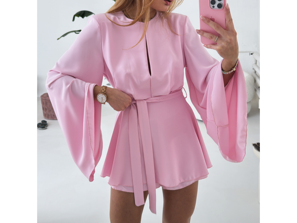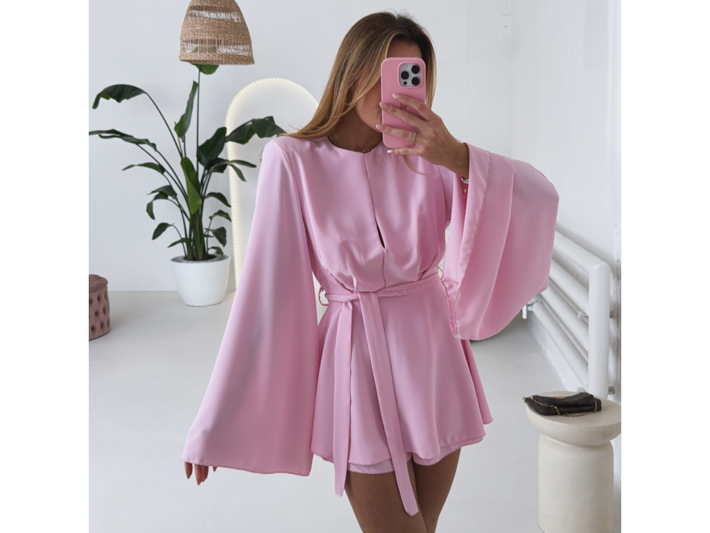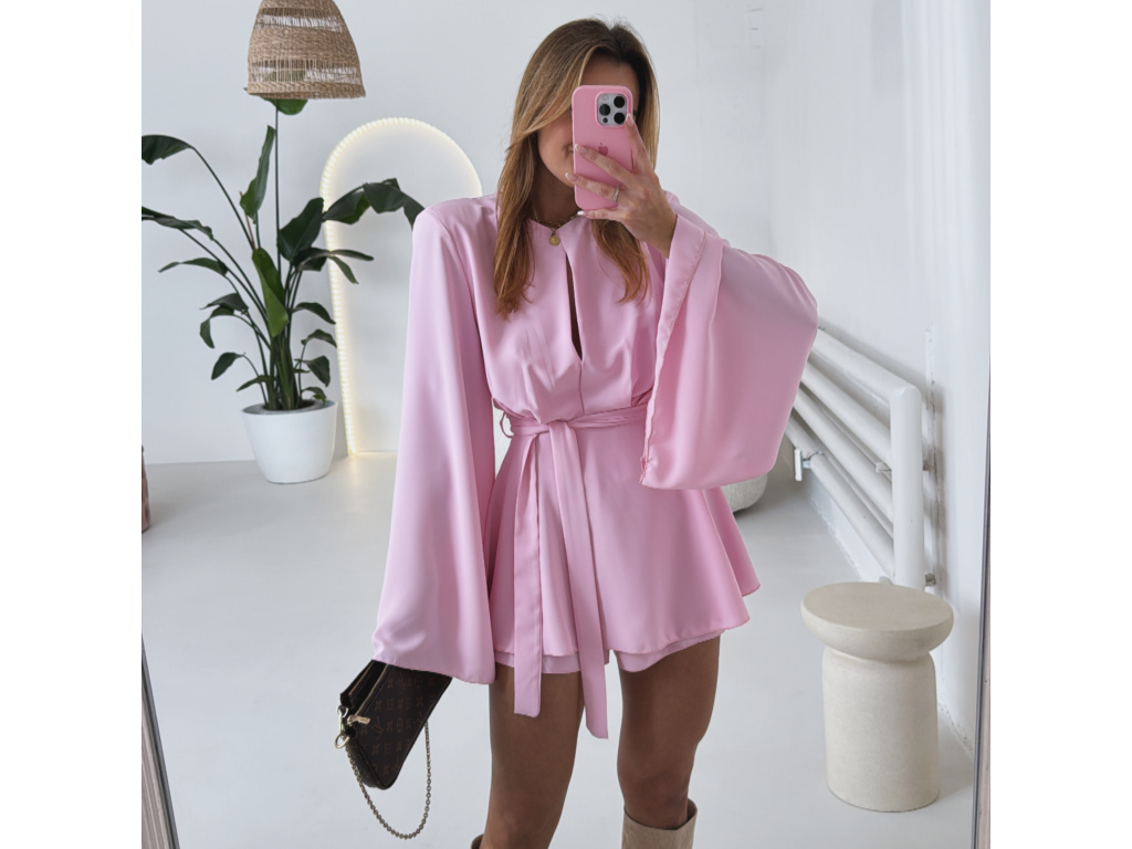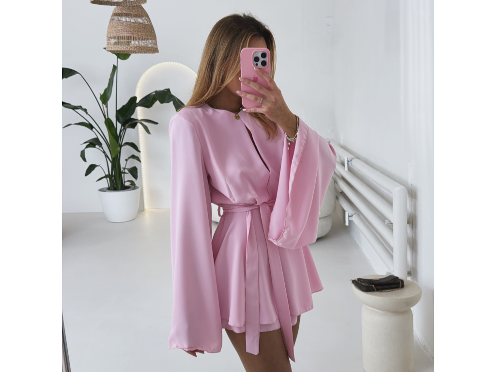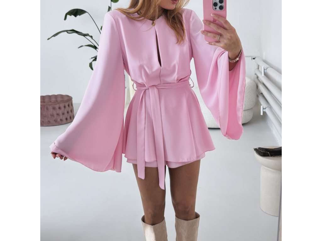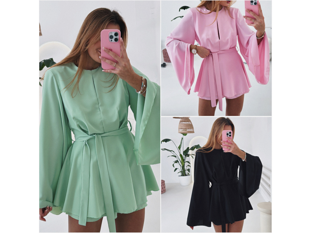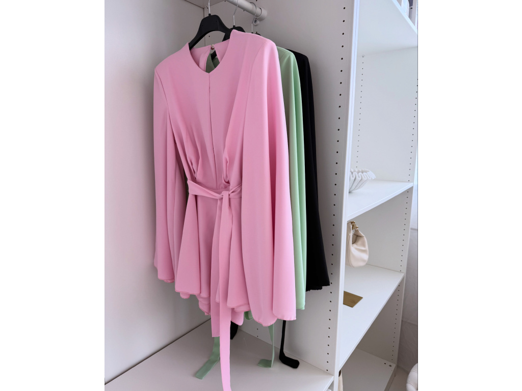 Sexy a zároveň elegantní šatový overal s páskem v růžové, tyrkysové a černé barvě. Overal má zajímavý výstřih na zádech se zapínáním u krku, vyztužená ramena a zvonové, dlouhé rukávy. V pase overal hezky pruží a lze ho stáhnout páskem. Nadčasový kousek, který kombinuje eleganci a moderní šmrnc. Velikost je univerzální, sedí na XS až menší M. Foceno je na velikosti XS a výšce 165 cm.