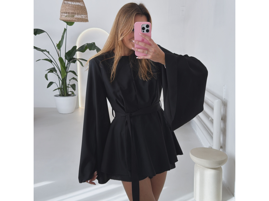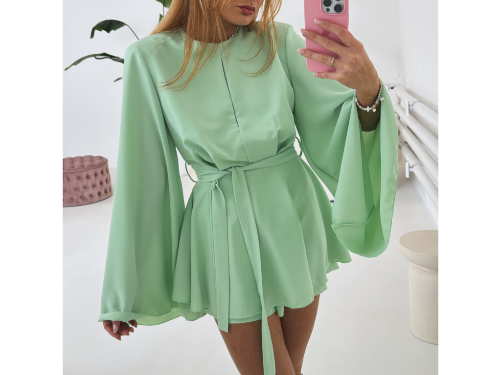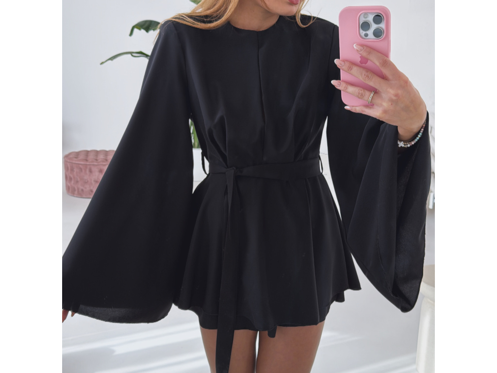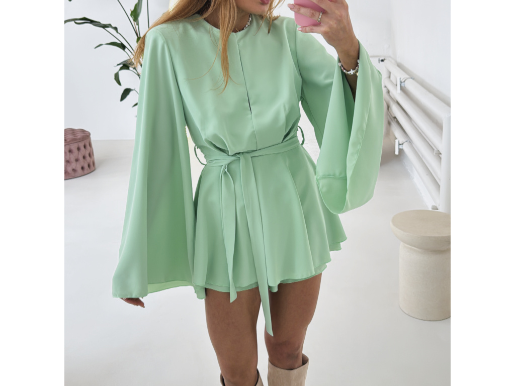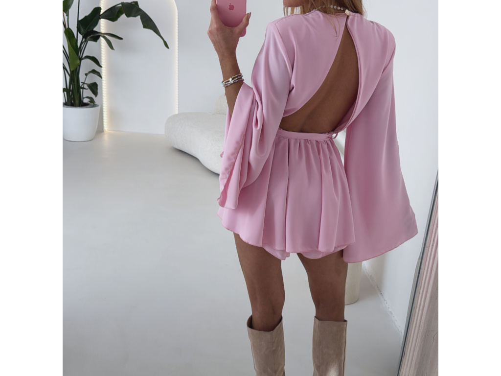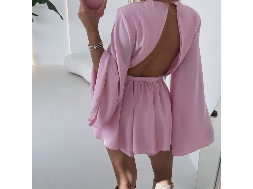 Sexy a zároveň elegantní šatový overal s páskem v růžové, tyrkysové a černé barvě. Overal má zajímavý výstřih na zádech se zapínáním u krku, vyztužená ramena a zvonové, dlouhé rukávy. V pase overal hezky pruží a lze ho stáhnout páskem. Nadčasový kousek, který kombinuje eleganci a moderní šmrnc. Velikost je univerzální, sedí na XS až menší M. Foceno je na velikosti XS a výšce 165 cm.