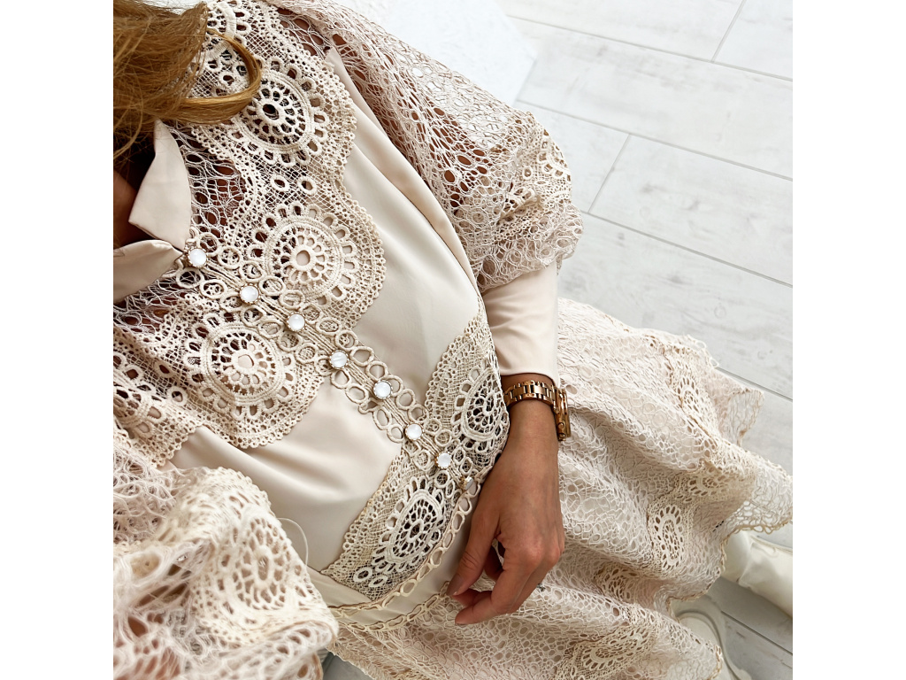 Krásné, romantické šaty v bílé a béžové barvě s krajkou. Šaty v oblasti pasu ze zadní strany pruží. Zapínají se na dva knoflíčky u krku ze zadní strany a mají mírný stojáček. Šaty jsou vypodšívkované v celé délce mimo rukávy. Velikost je univerzální, sedí na XS - M i menší L. Na velikosti XS jsou šaty v pasu větší. Foceno je na XSku a výšce 165 cm.