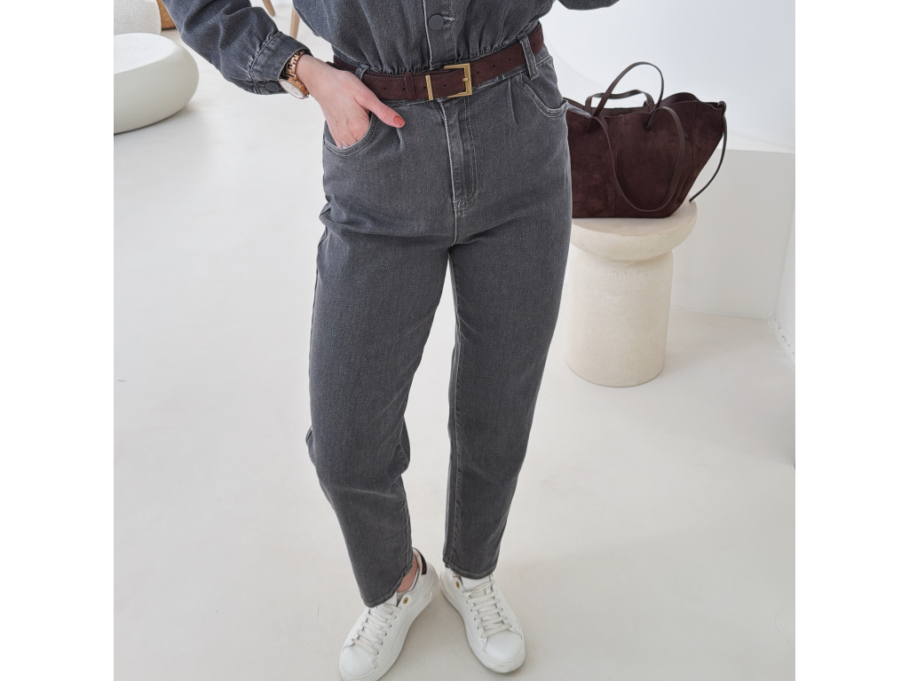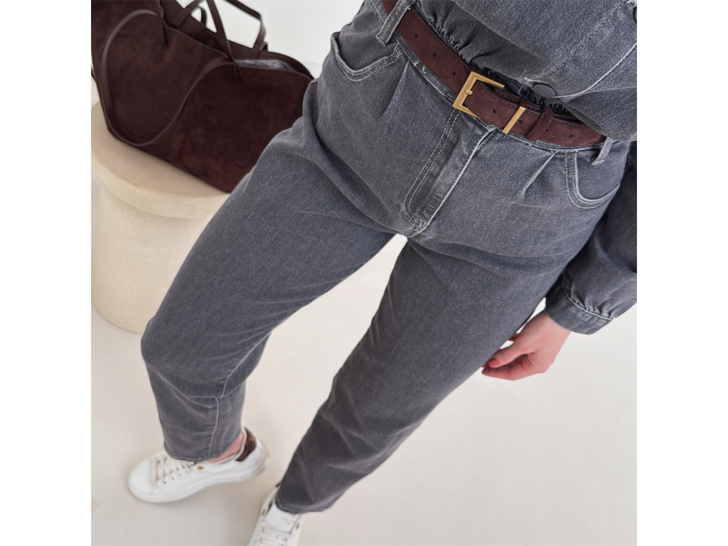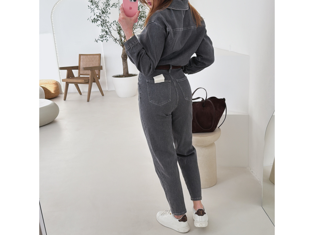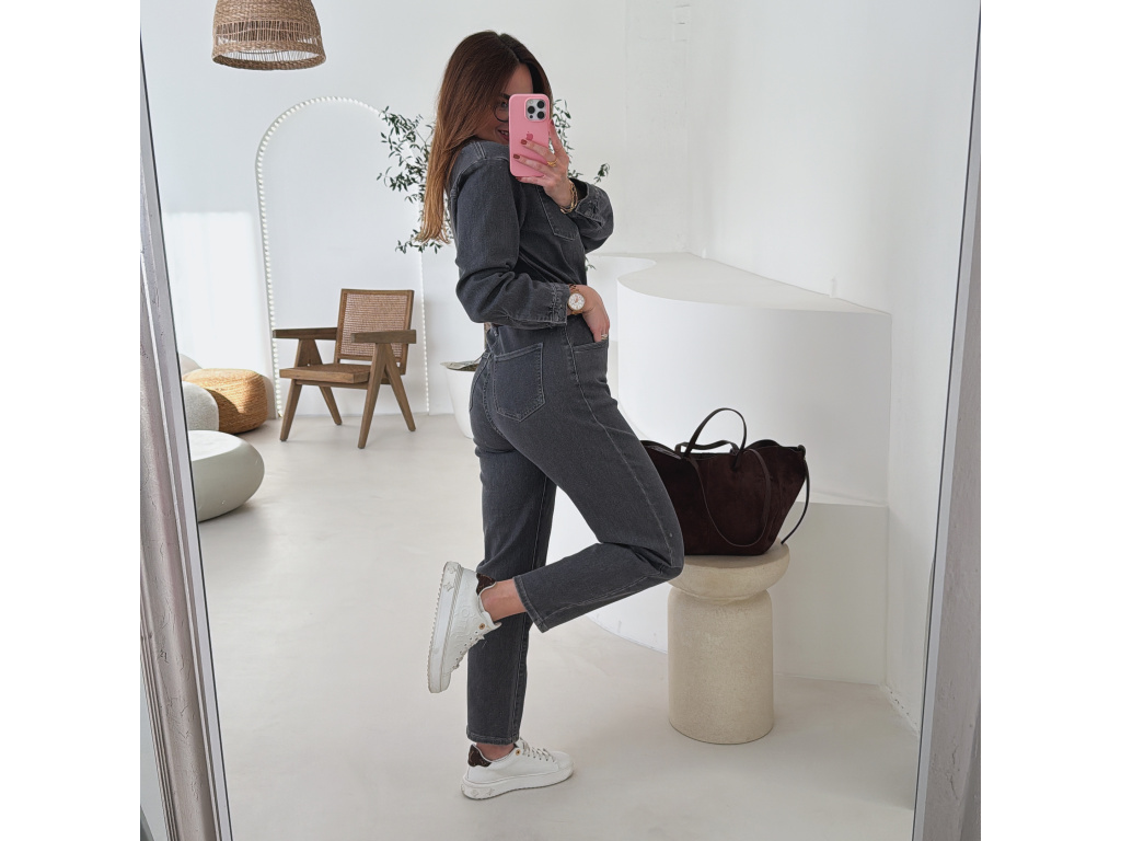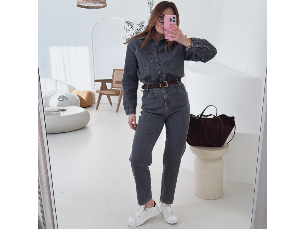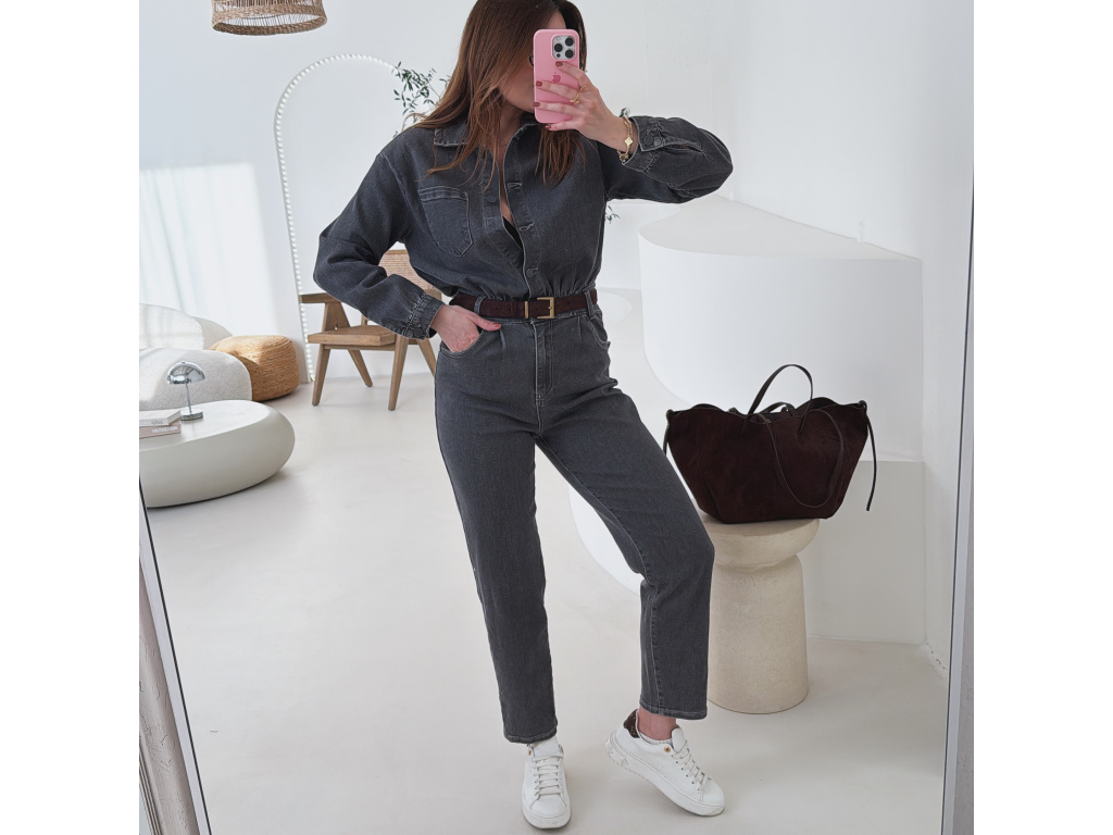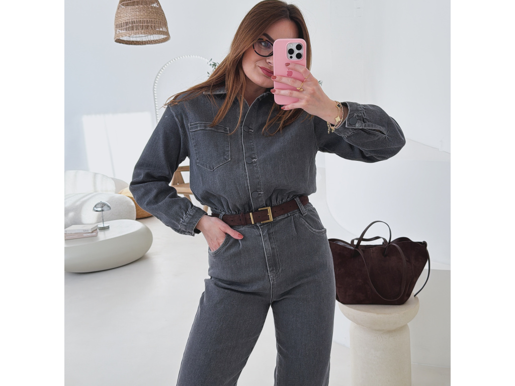 Stylový dlouhý overal v tmavě šedé barvě, který si zamilujete pro jeho pohodlí i vzhled. Je ušitý z příjemného, jemného a elastického materiálu, díky kterému krásně sedí na postavě a přizpůsobí se. Má dlouhý rukáv, praktické kapsy a poutka na pásek, takže si můžete zvýraznit pas podle sebe. Overal je velmi hezky zpracovaný a hodí se jak na běžné nošení, tak i na elegantnější outfit. Dostupný ve velikostech S, M a L. Pásek na fotce není součástí prodeje.