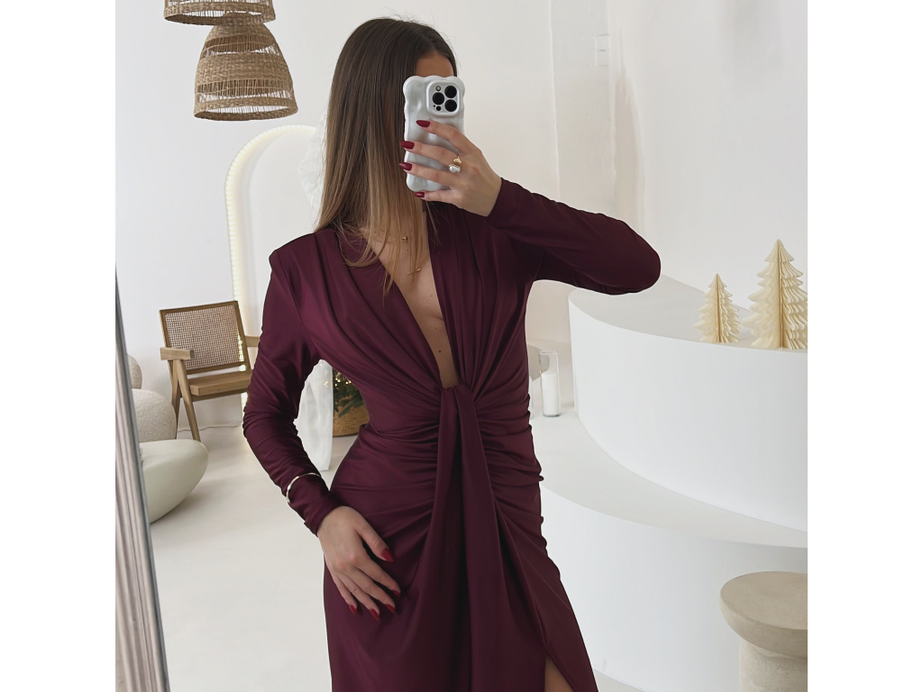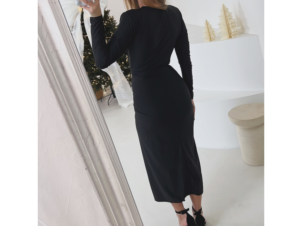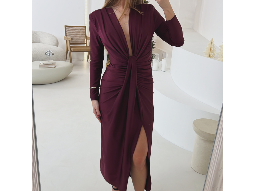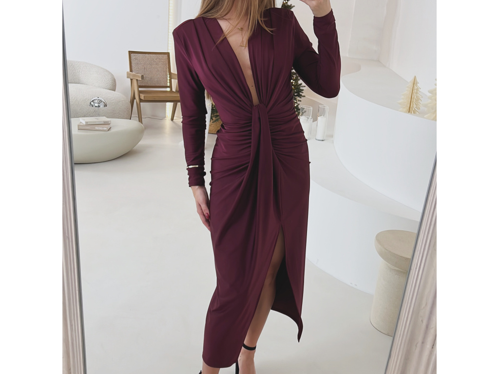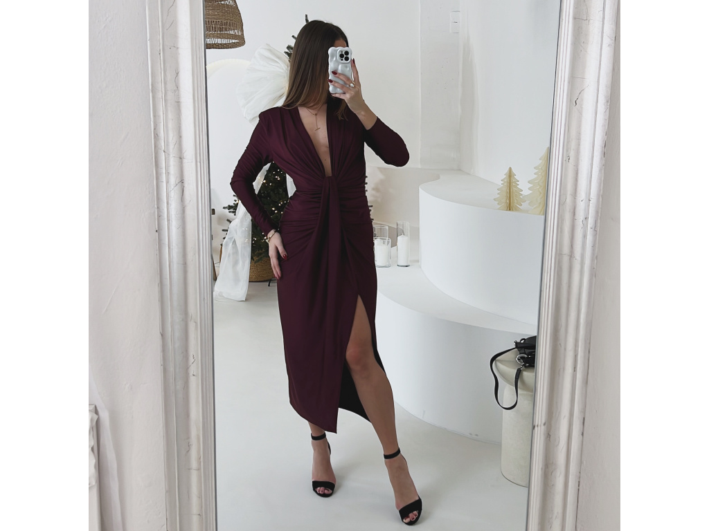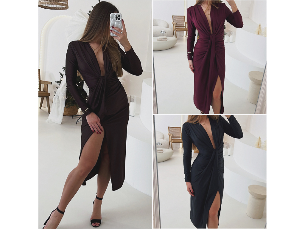 Tyto sexy elastické šaty okouzlí svým nádherným, výrazným střihem, který dokonale zvýrazní ženskou siluetu. Mají vystužená ramena pro elegantní linii a jsou ušité z lehce lesklého, splývavého materiálu, který se krásně natáhne. Přední část zdobí efektní řasení a hluboký výstřih a rozparek dodává šatům šmrnc a svůdnost.