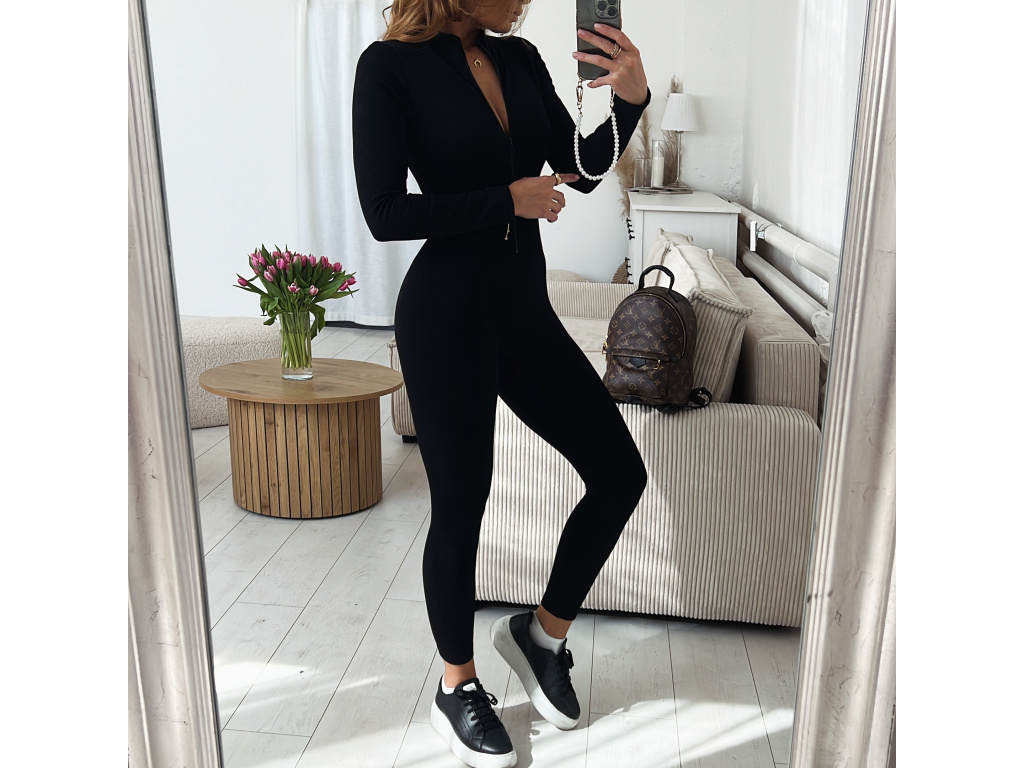 Stylový a pohodlný overal z pružného žebrovaného materiálu, který krásně obepne a vytvaruje postavu. Přední zip umožňuje snadné oblékání i úpravu výstřihu podle nálady. Dlouhé rukávy a přiléhavý střih vytvářejí moderní, sportovně-elegantní look. Ideální na každodenní nošení, volný čas i stylové cestování. Velikost je univerzální, sedí na XS, S a M.