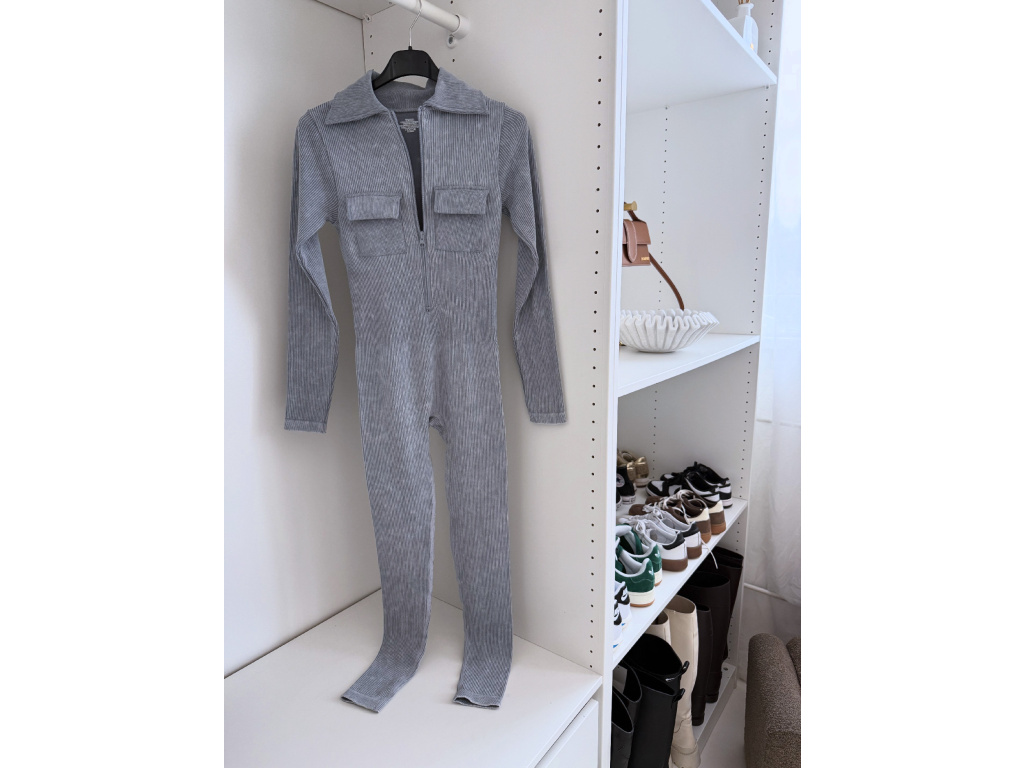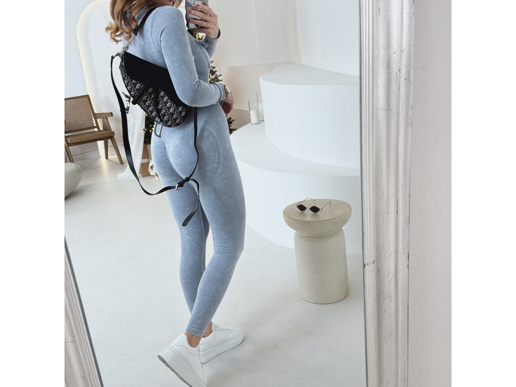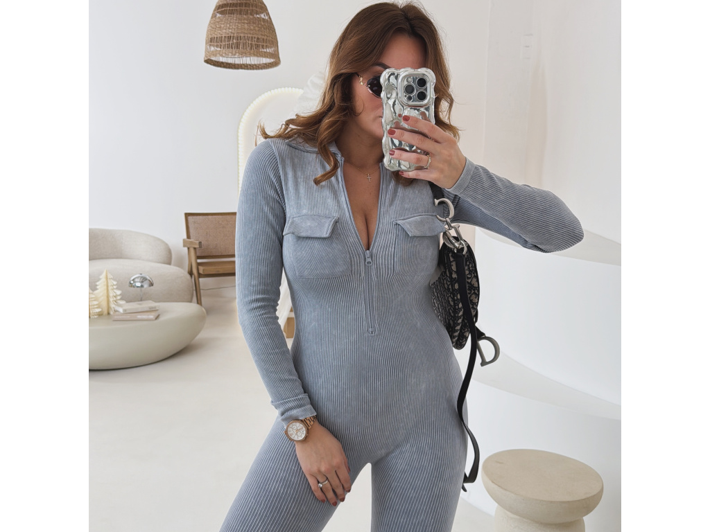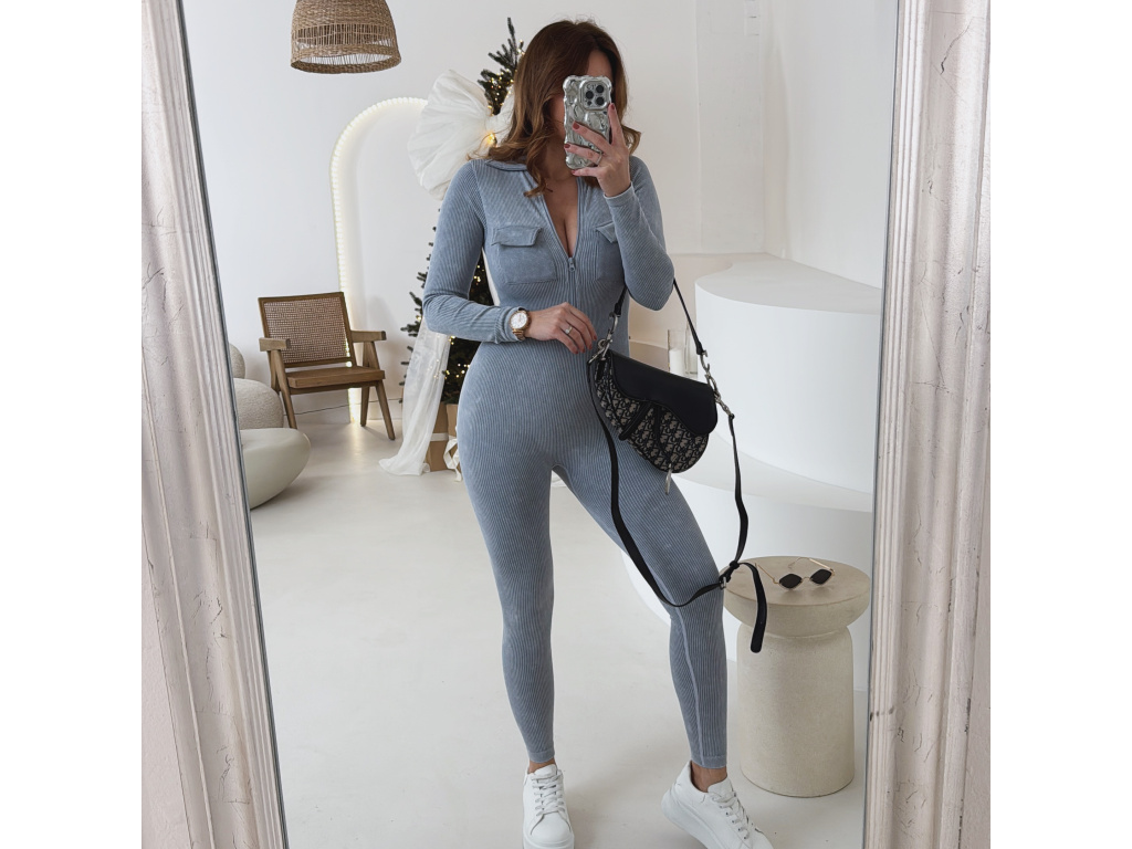 Stylový světle šedý overal s jemným efektem šisování, který dokonale zvýrazní postavu. Je vyroben z příjemného žebrovaného elastického materiálu, který se krásně přizpůsobí a v pase opticky zeštíhluje. Zadní část má push-up efekt pro krásně tvarovaný vzhled. Přední stranu zdobí praktické kapsičky a hlubší zipové zapínání, které umožňuje regulovat výstřih. Overal je v univerzální velikosti a díky pružnosti pohodlně sedí různým typům postavy — ideální kousek pro sportovní i stylové outfity.