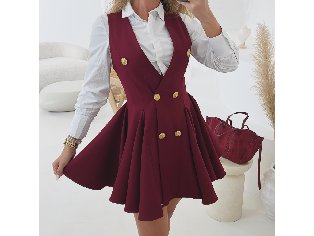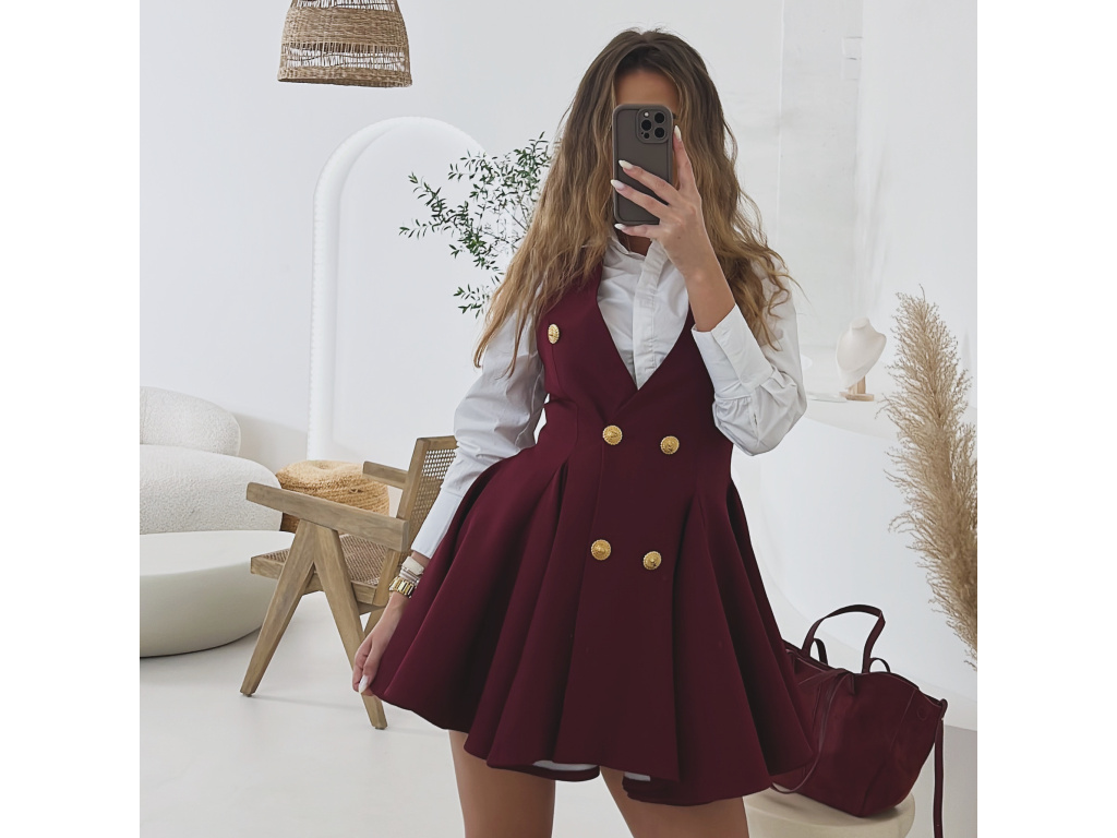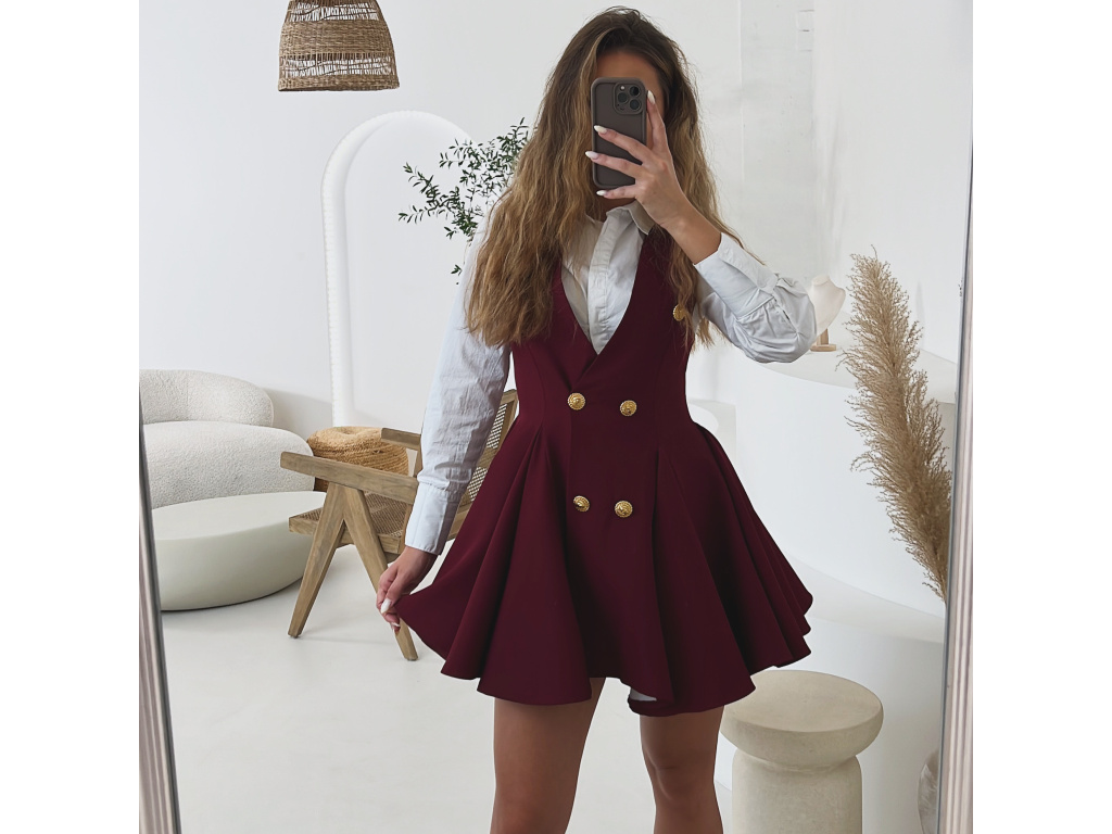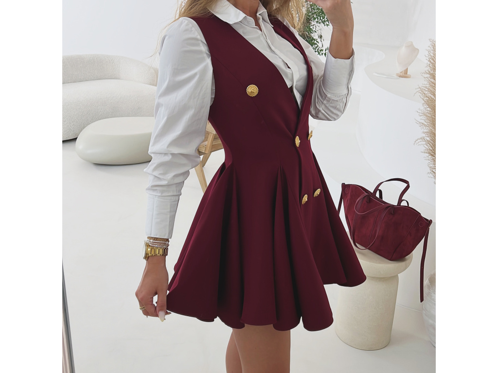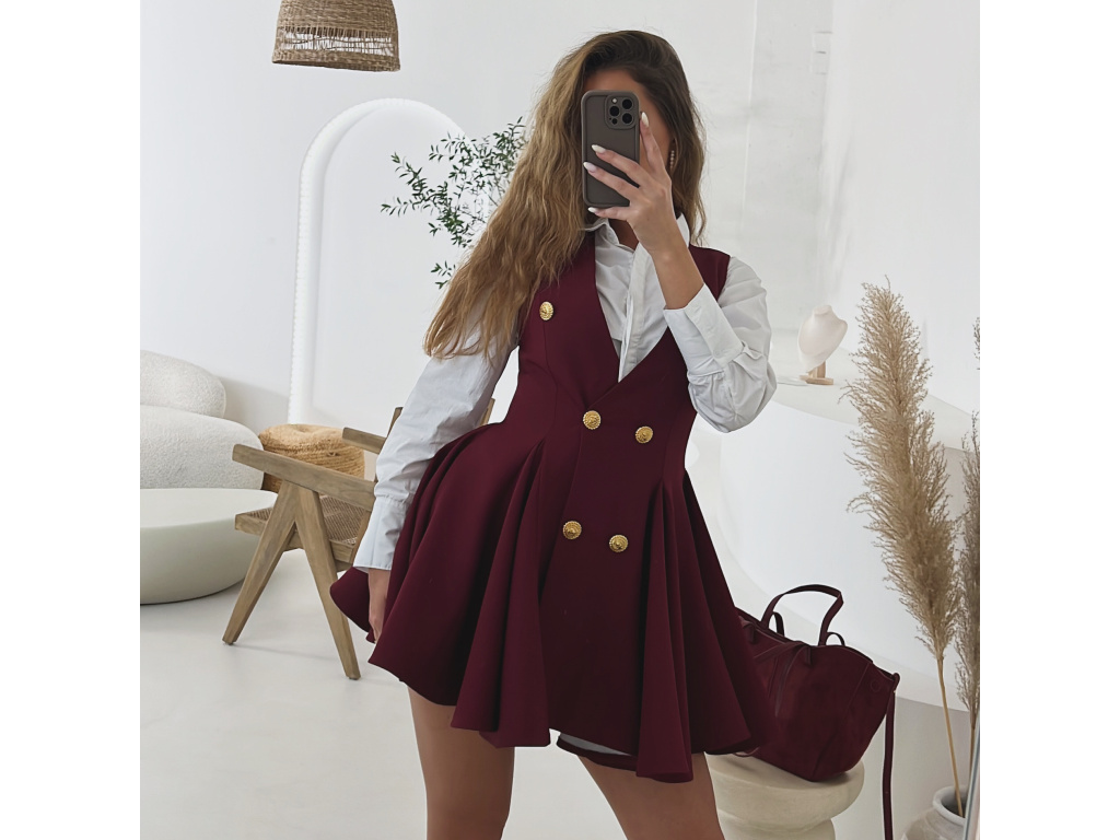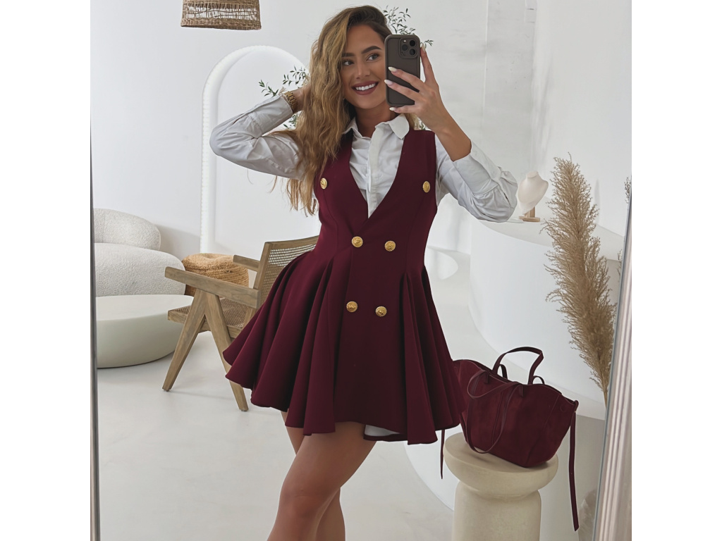 Tyto elegantní vínové šaty s áčkovou sukní jsou dokonalou kombinací nadčasového střihu a moderního stylu. Dvouřadé zapínání na výrazné zlaté knoflíky dodává modelu nádech luxusu a originality. Šaty jsou ušité z hutného, těžkého a vysoce kvalitního materiálu, který krásně drží tvar. Díky jemné podšívce jsou pohodlné na nošení po celý den.