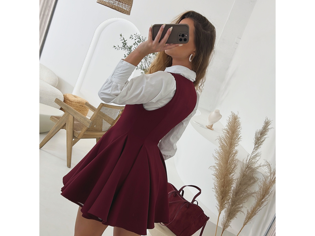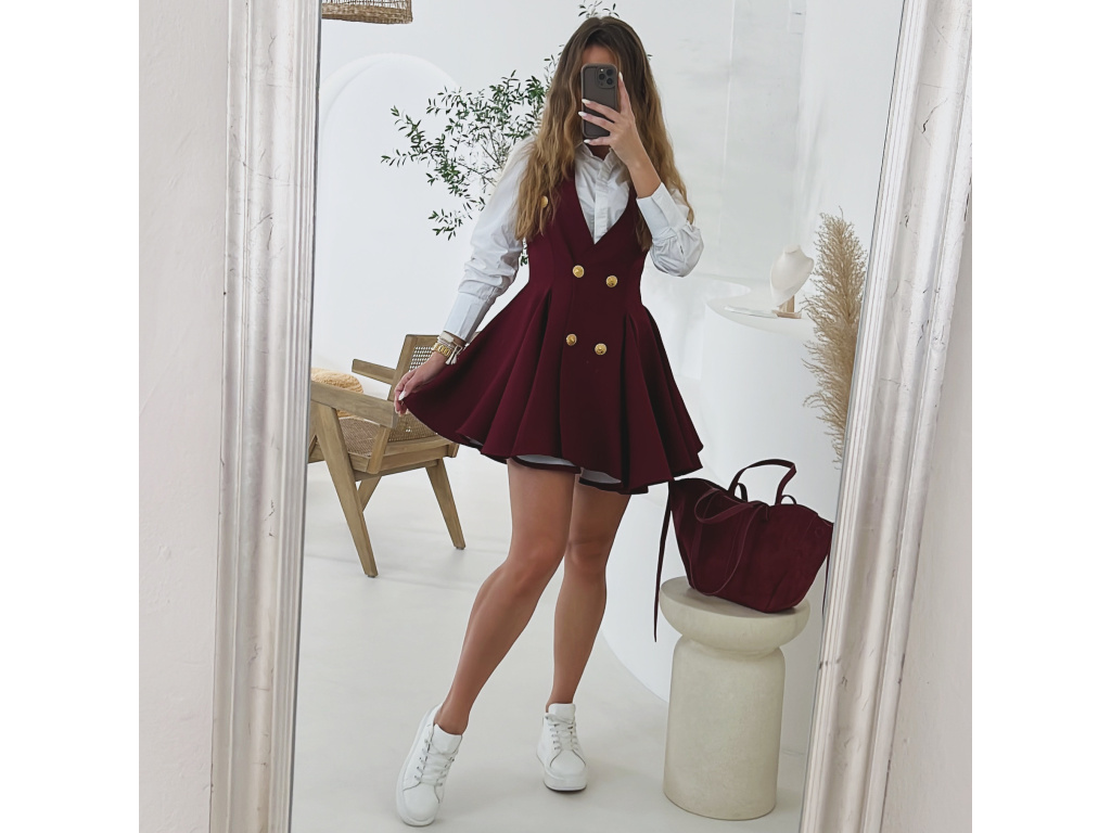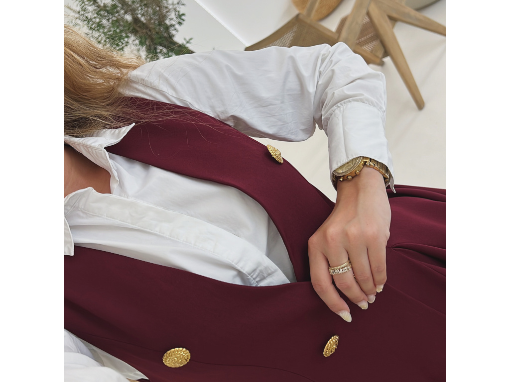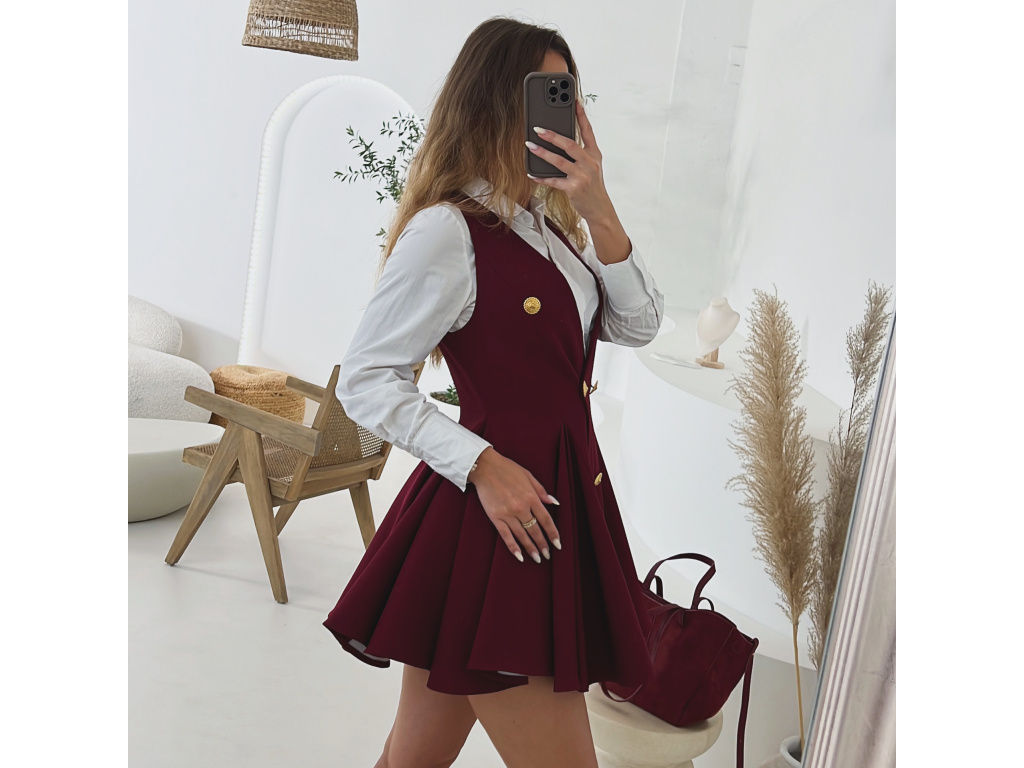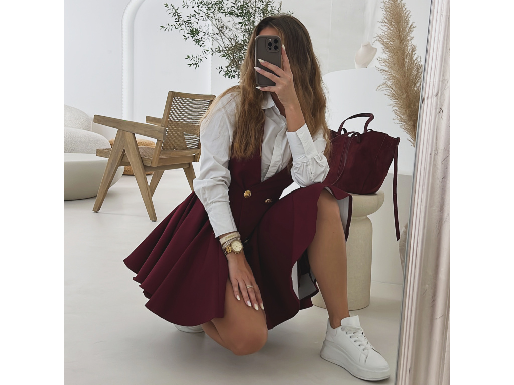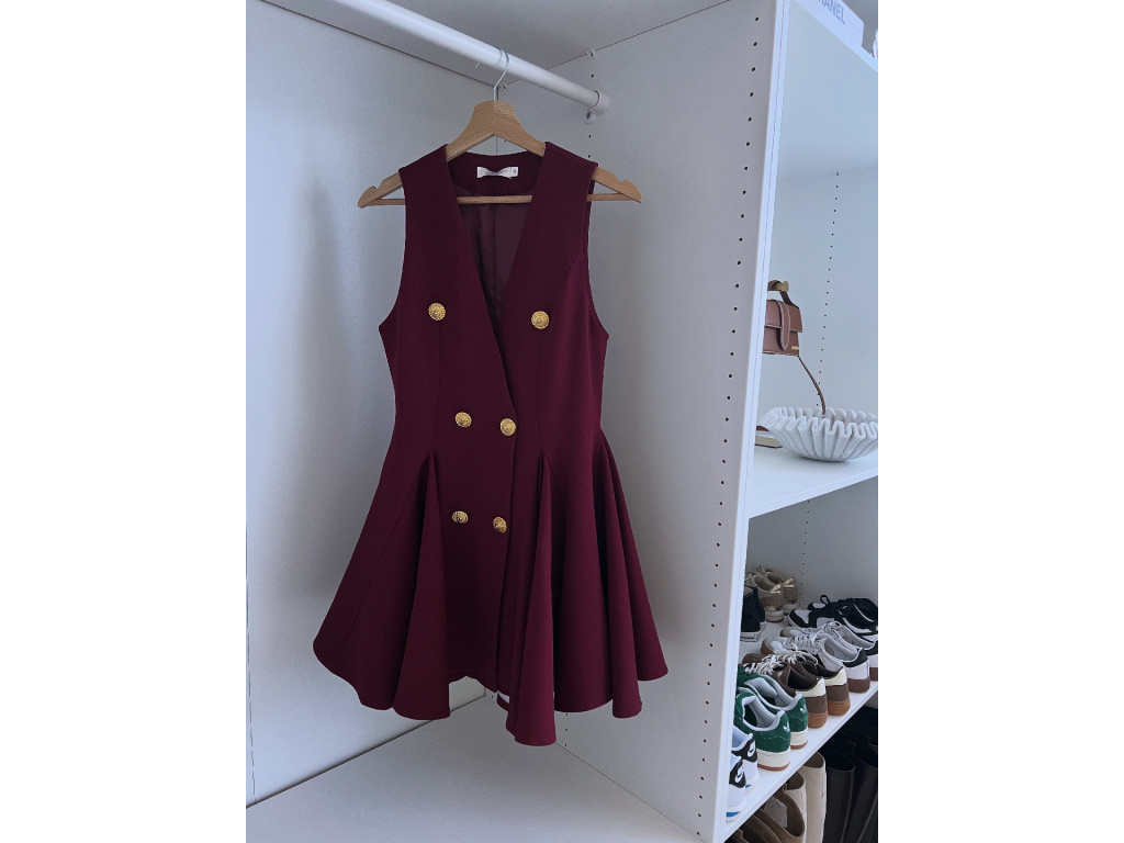 Tyto elegantní vínové šaty s áčkovou sukní jsou dokonalou kombinací nadčasového střihu a moderního stylu. Dvouřadé zapínání na výrazné zlaté knoflíky dodává modelu nádech luxusu a originality. Šaty jsou ušité z hutného, těžkého a vysoce kvalitního materiálu, který krásně drží tvar. Díky jemné podšívce jsou pohodlné na nošení po celý den.