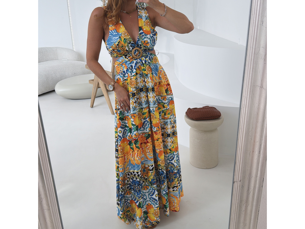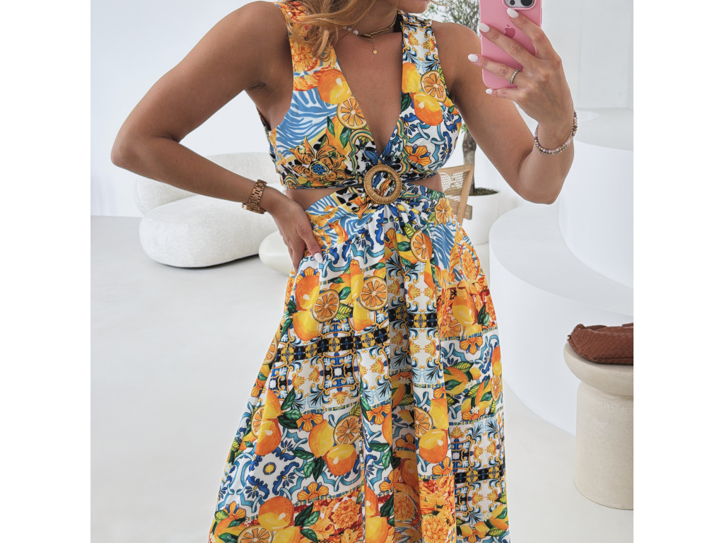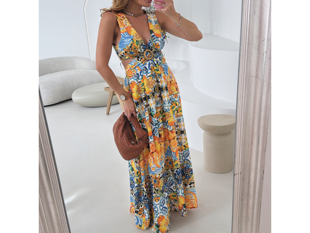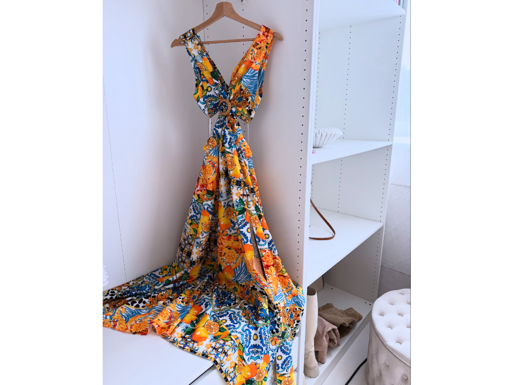 Výrazné maxi šaty s barevným tropickým vzorem, hlubokým výstřihem a efektními průstřihy v pase i na zádech. Vpředu rozparek pro volný pohyb a ženský look. Oblast prsou i pasu je pružná, takže šaty perfektně sedí a zároveň jsou pohodlné. Ideální volba na letní párty, dovolenou či pro slunečné dny ve městě. Univerzální velikost padne na XS–M.