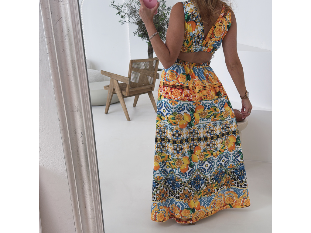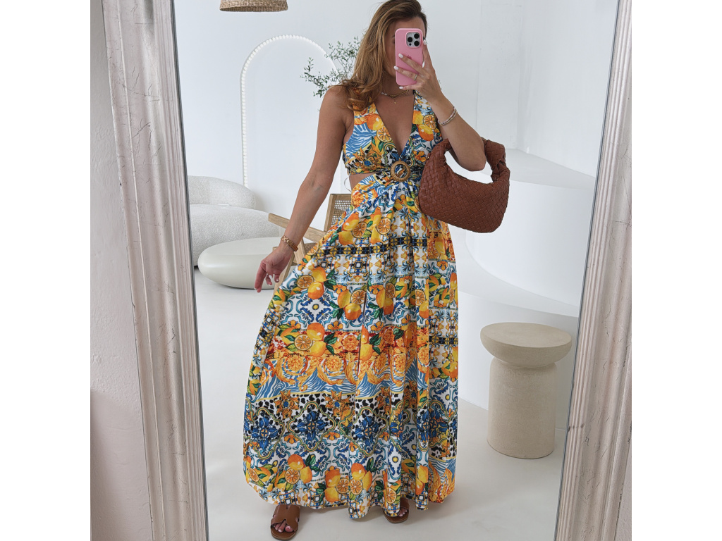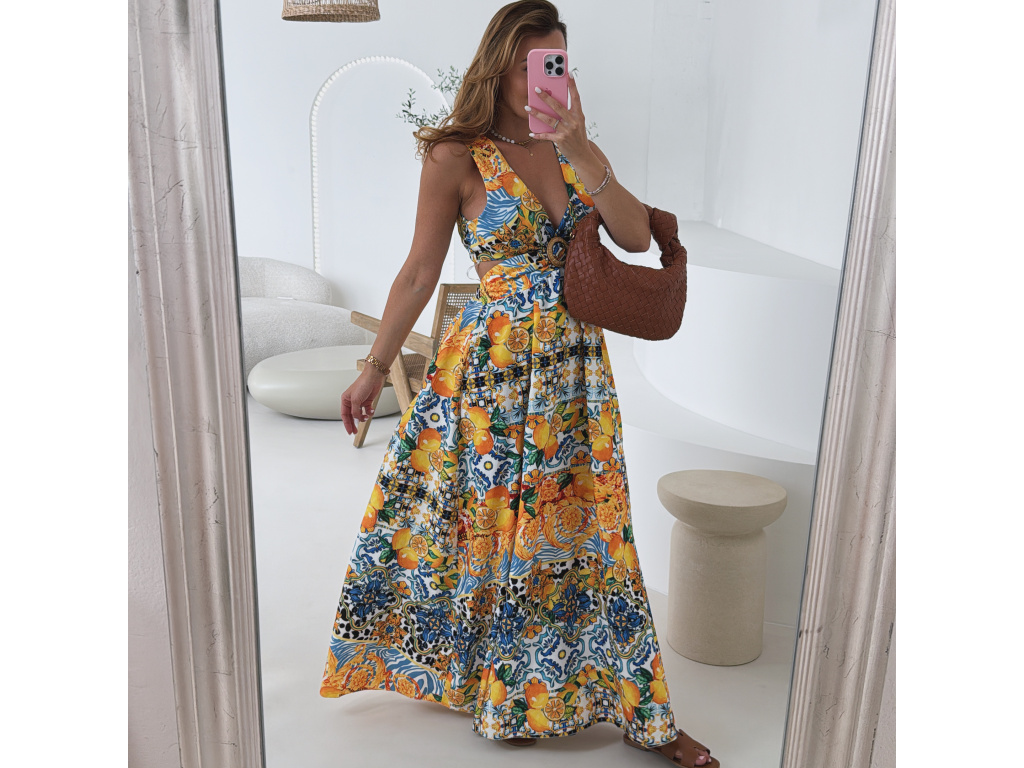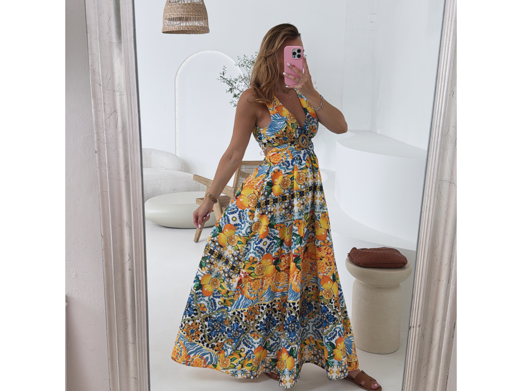 Výrazné maxi šaty s barevným tropickým vzorem, hlubokým výstřihem a efektními průstřihy v pase i na zádech. Vpředu rozparek pro volný pohyb a ženský look. Oblast prsou i pasu je pružná, takže šaty perfektně sedí a zároveň jsou pohodlné. Ideální volba na letní párty, dovolenou či pro slunečné dny ve městě. Univerzální velikost padne na XS–M.