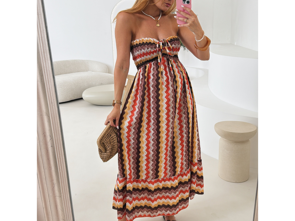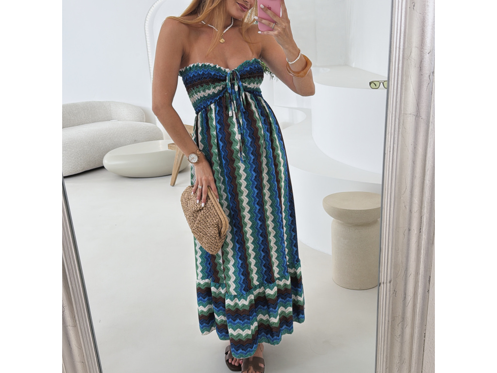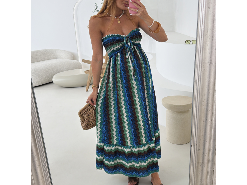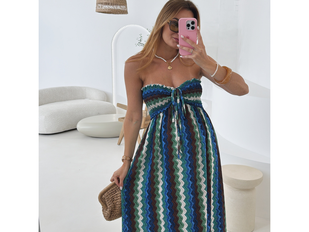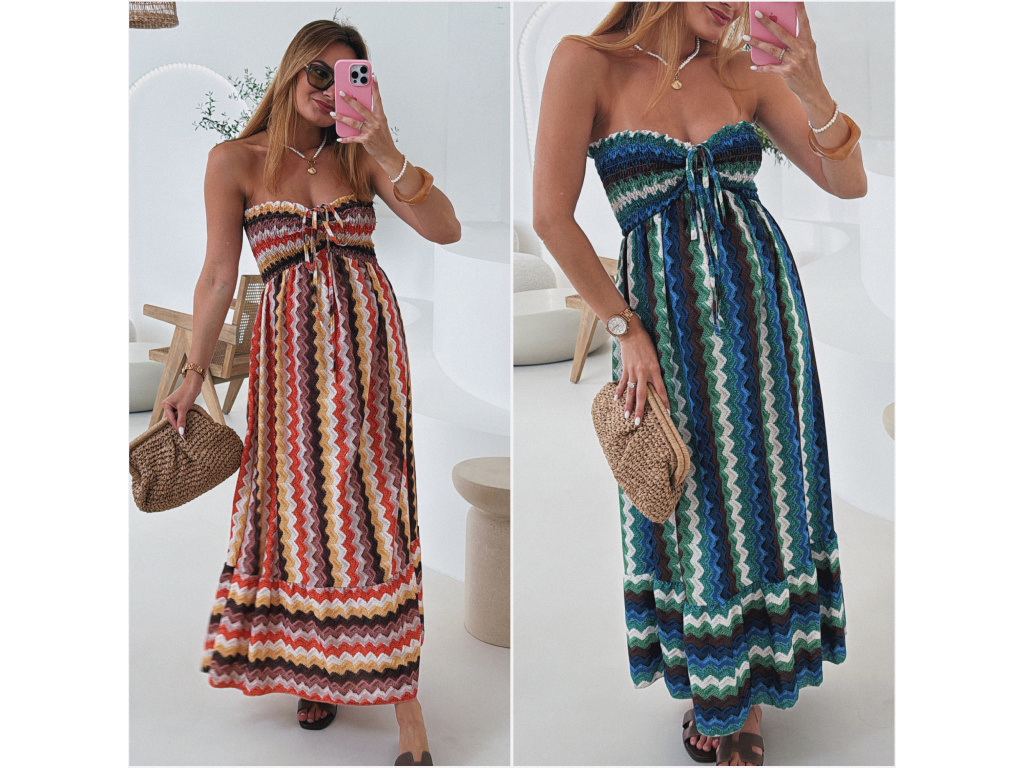 Lehké maxi šaty s barevným cikcak vzorem a výrazným žabičkováním v oblasti hrudníku a pasu krásně zvýrazní siluetu a zároveň poskytnou pohodlí po celý den. Díky elastickému střihu perfektně padnou, drží na místě i bez ramínek a působí maximálně ženským dojmem. Ideální volba pro letní dny, dovolenou nebo městské procházky. Velikost je univerzální, sedí na XS až M.