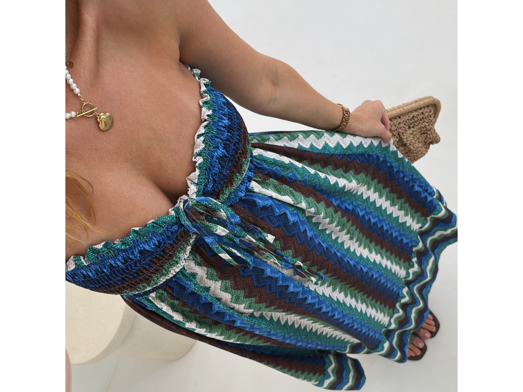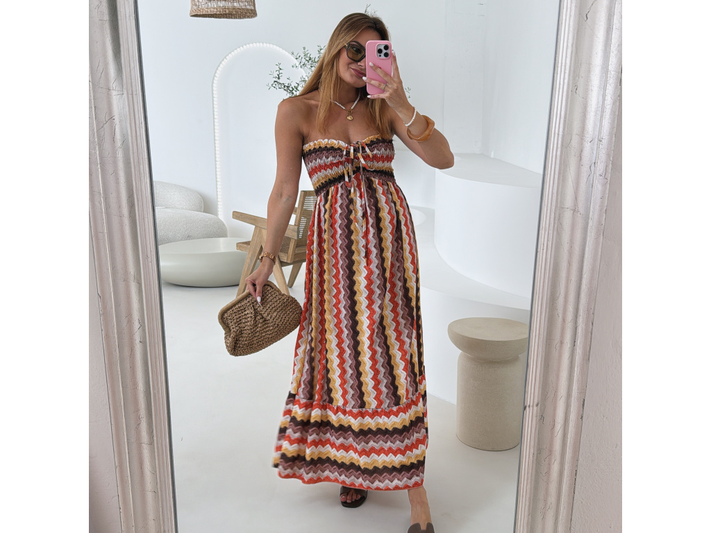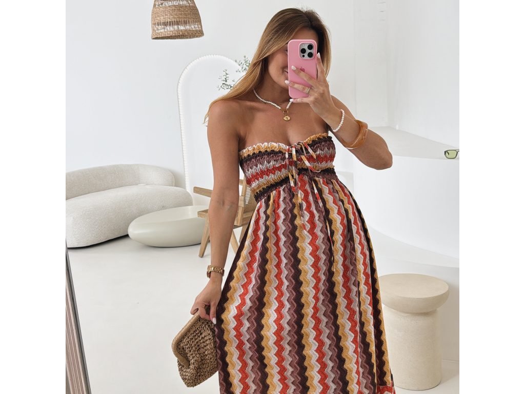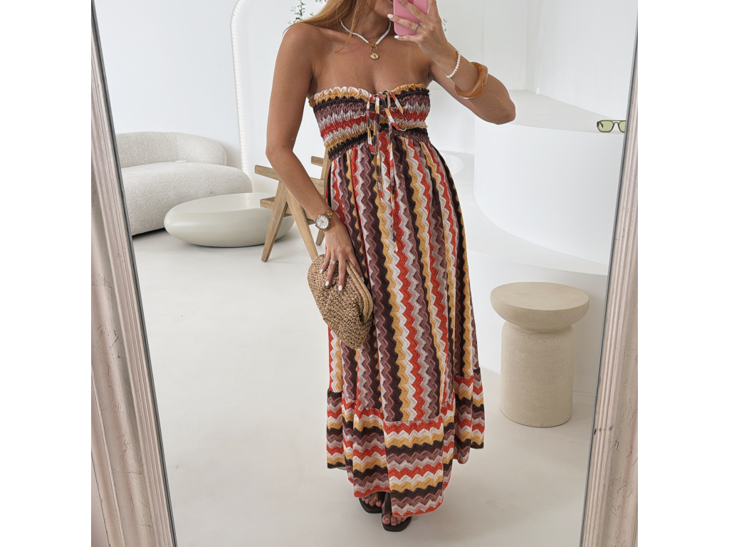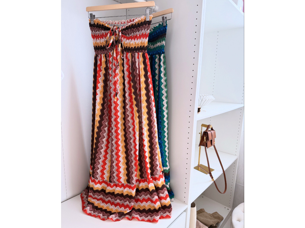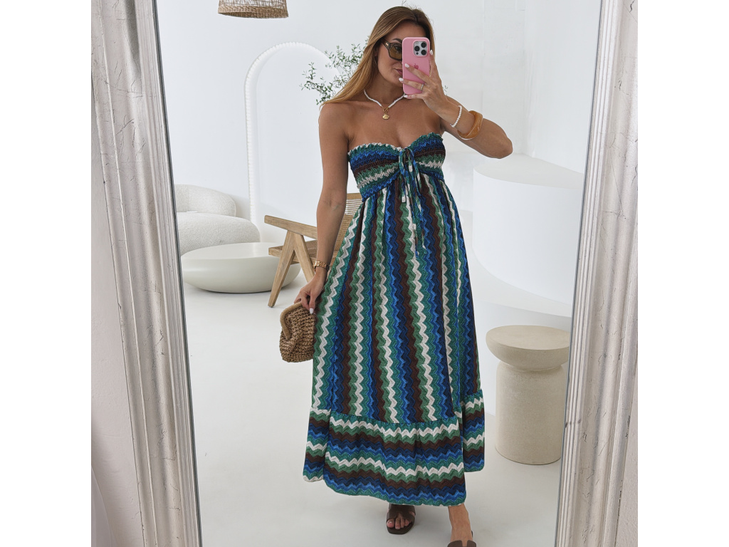Lehké maxi šaty s barevným cikcak vzorem a výrazným žabičkováním v oblasti hrudníku a pasu krásně zvýrazní siluetu a zároveň poskytnou pohodlí po celý den. Díky elastickému střihu perfektně padnou, drží na místě i bez ramínek a působí maximálně ženským dojmem. Ideální volba pro letní dny, dovolenou nebo městské procházky. Velikost je univerzální, sedí na XS až M.