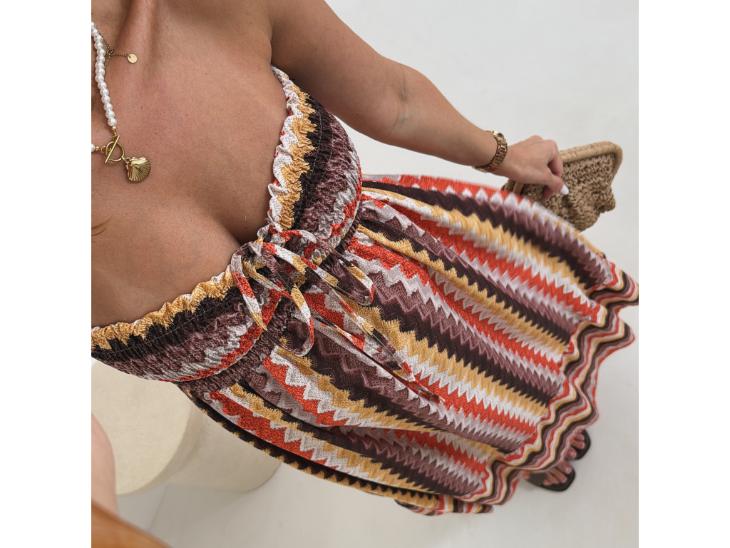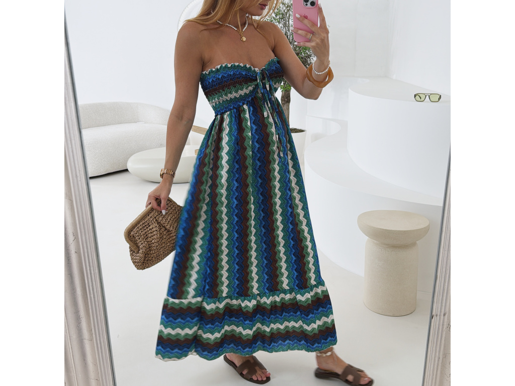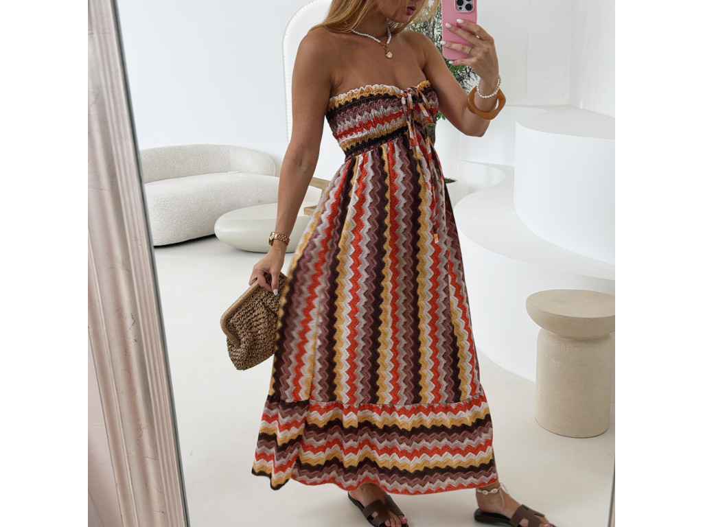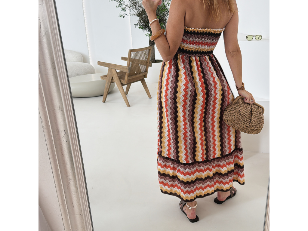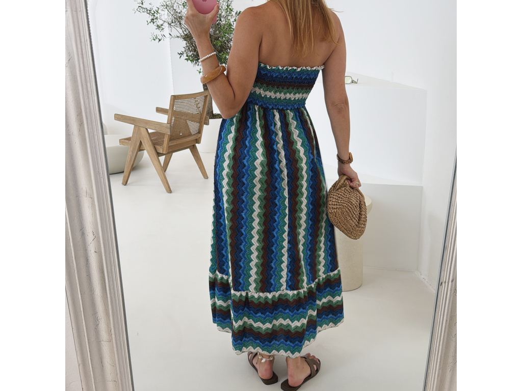 Lehké maxi šaty s barevným cikcak vzorem a výrazným žabičkováním v oblasti hrudníku a pasu krásně zvýrazní siluetu a zároveň poskytnou pohodlí po celý den. Díky elastickému střihu perfektně padnou, drží na místě i bez ramínek a působí maximálně ženským dojmem. Ideální volba pro letní dny, dovolenou nebo městské procházky. Velikost je univerzální, sedí na XS až M.