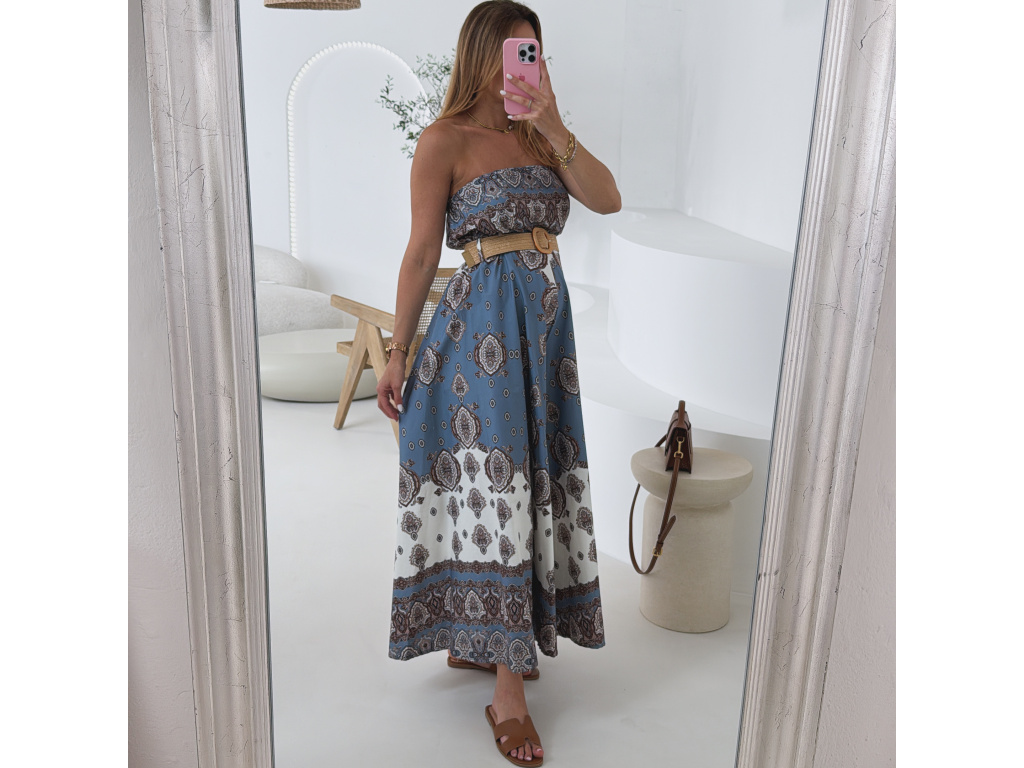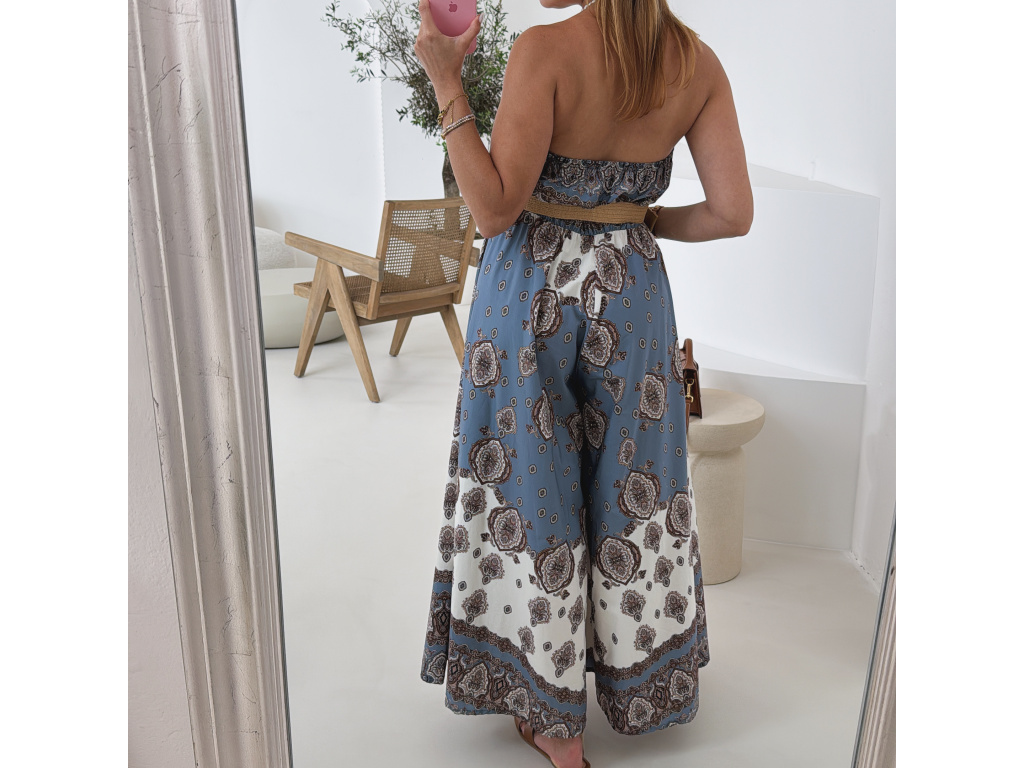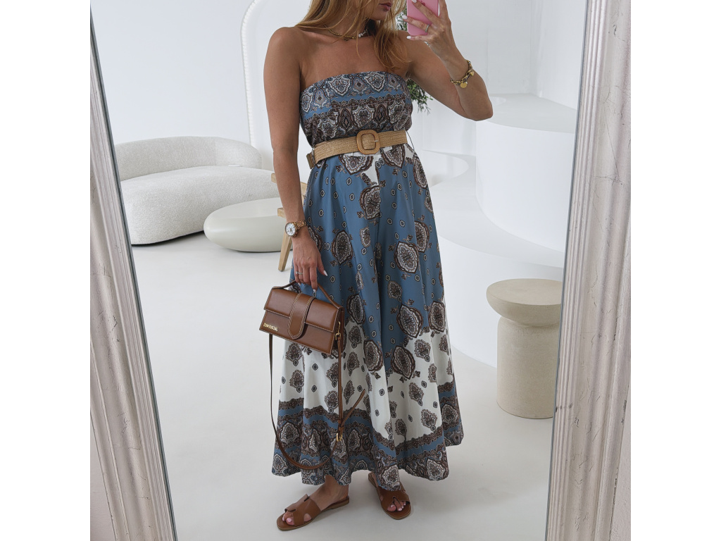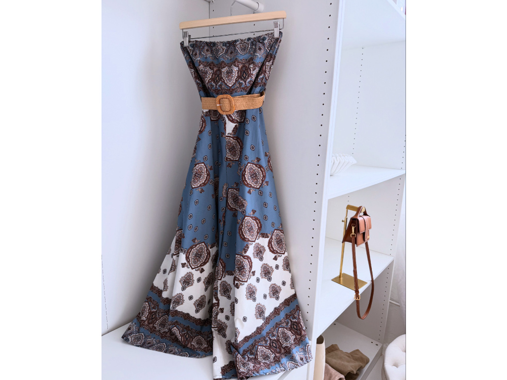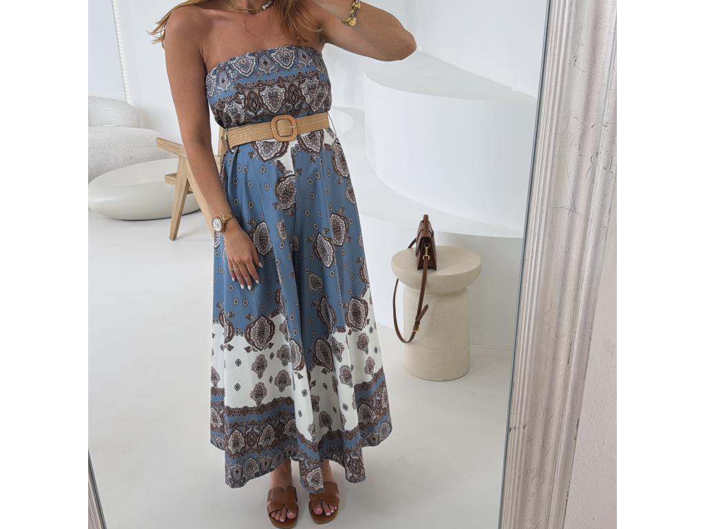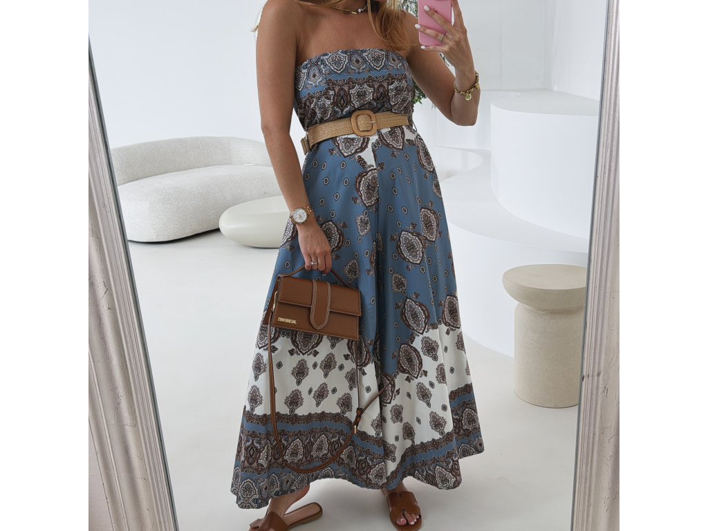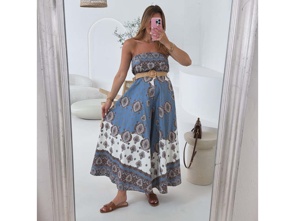 Stylový overal bez ramínek s modro-bílým vzorovaným potiskem, doplněný trendy páskem pro zvýraznění pasu. Oblast prsou a pasu je pružná pro pohodlné nošení a perfektní přizpůsobení postavě. Lehký a vzdušný materiál dělá z tohoto kousku ideální volbu na letní dny i dovolenkové outfity. Sedí na velikost XS, S a M.
