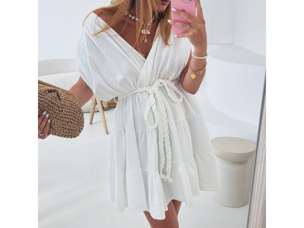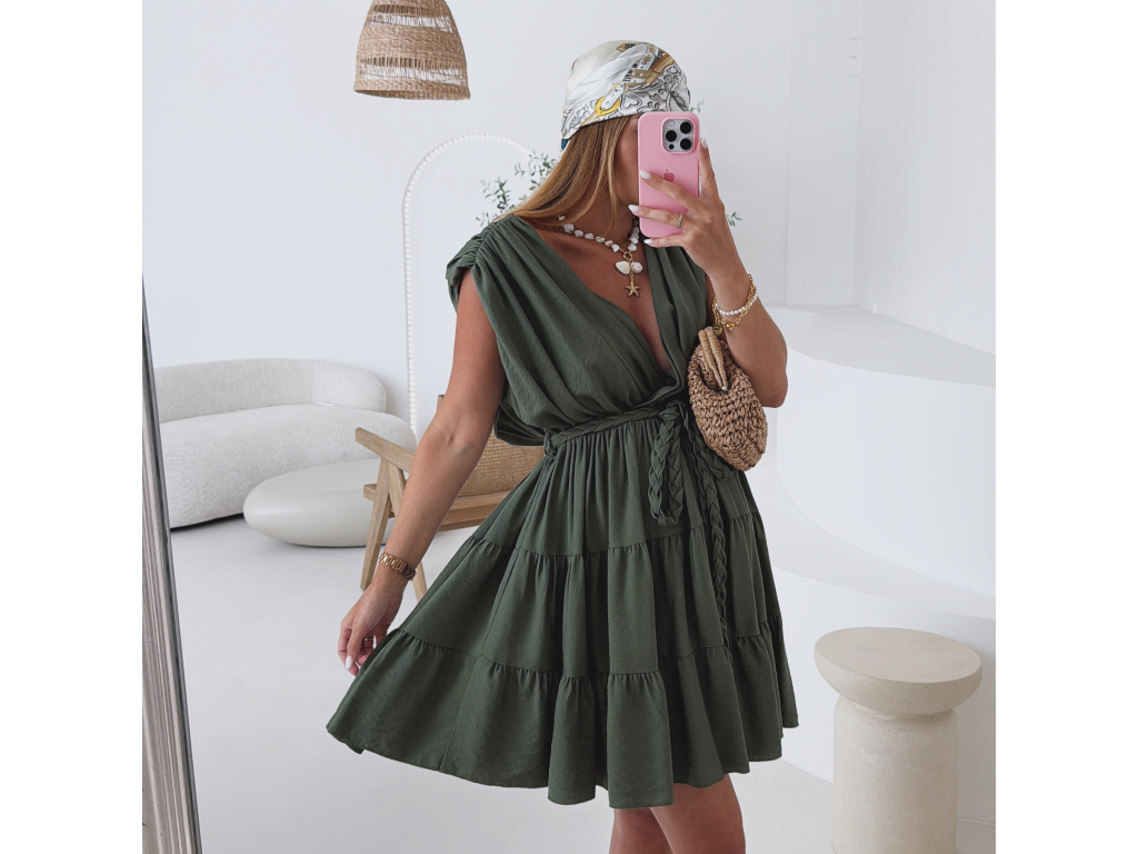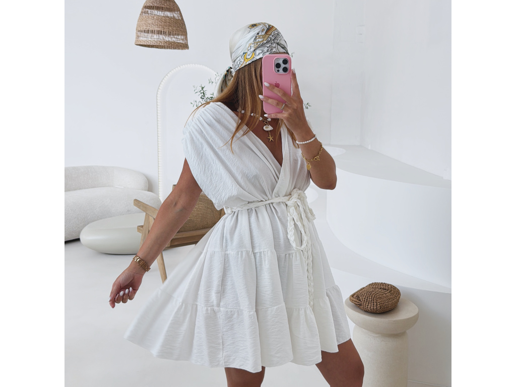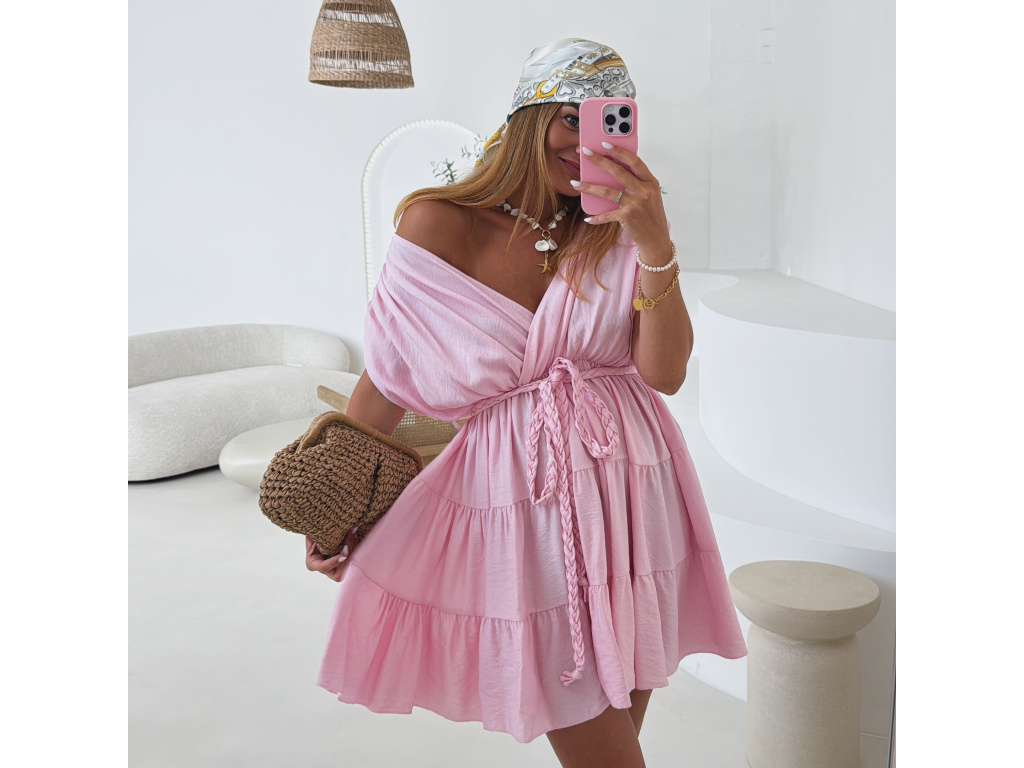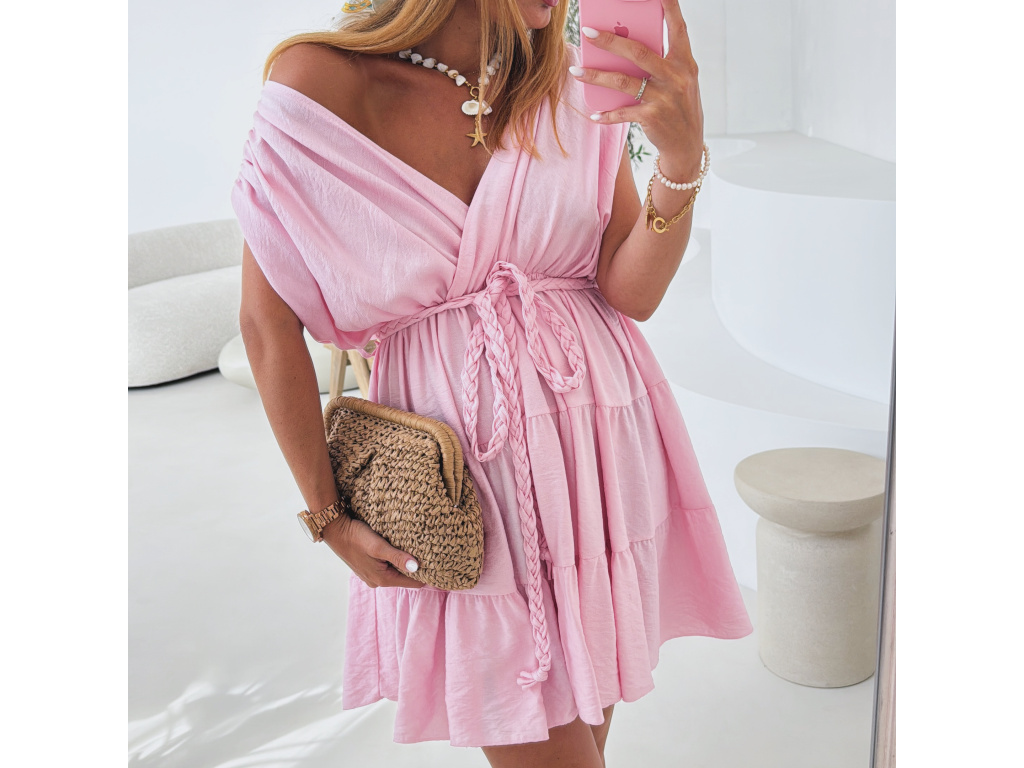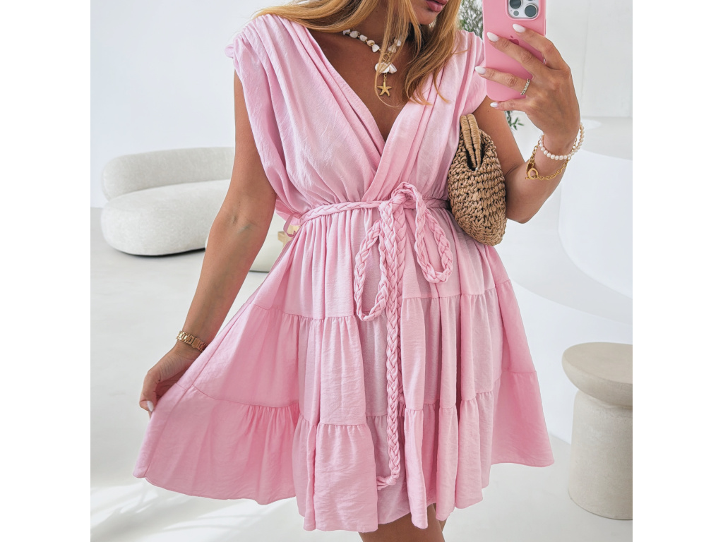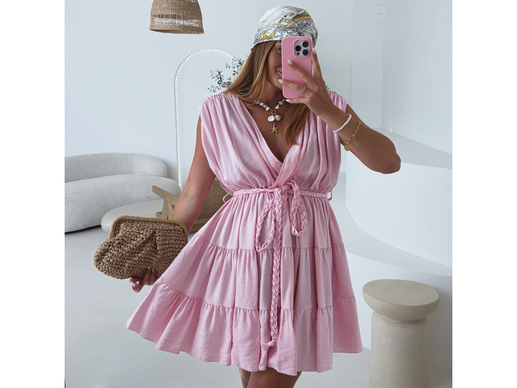 Lehké krátké šaty s volánovými vrstvami dostupné v bílé, růžové a khaki barvě. Mají zavinovací výstřih do V a pletený pásek, který zvýrazní pas. Díky volnému střihu jsou pohodlné a vzdušné – ideální na letní dny, dovolenou nebo procházky po městě. Velikost je univerzální, sedí na XS až L.