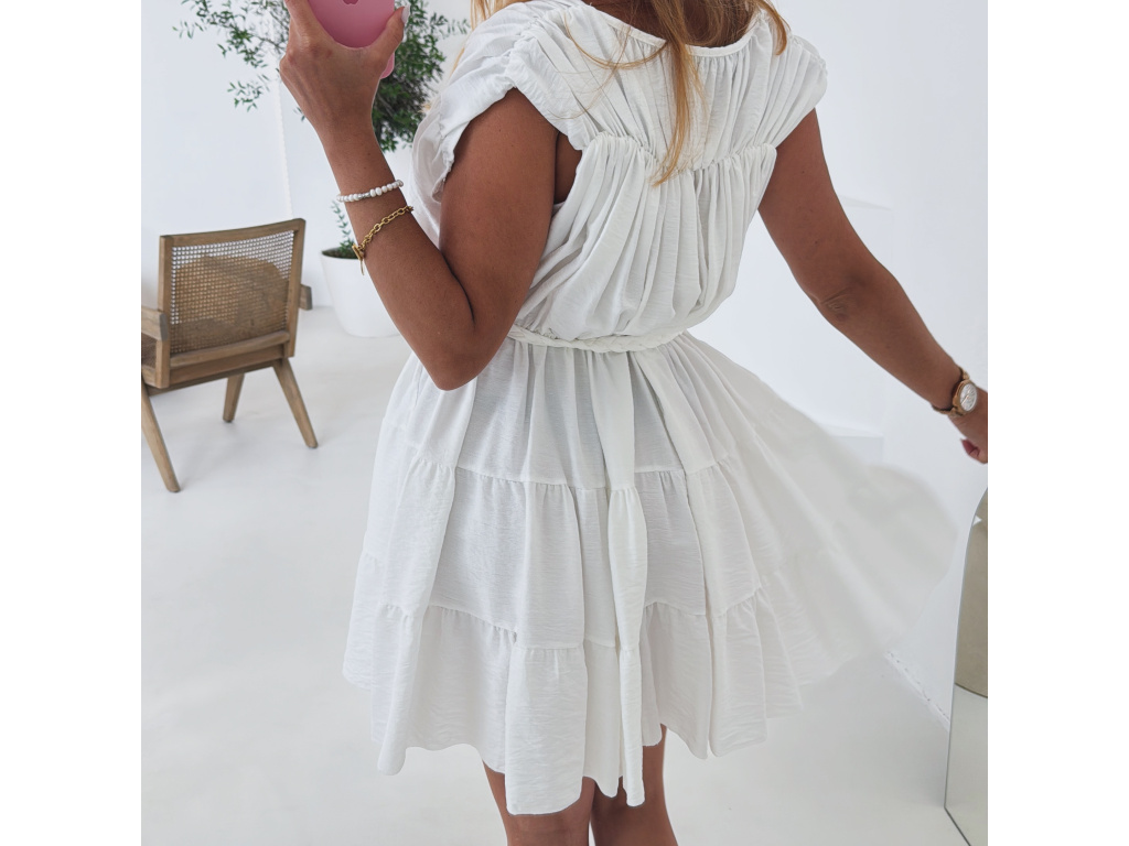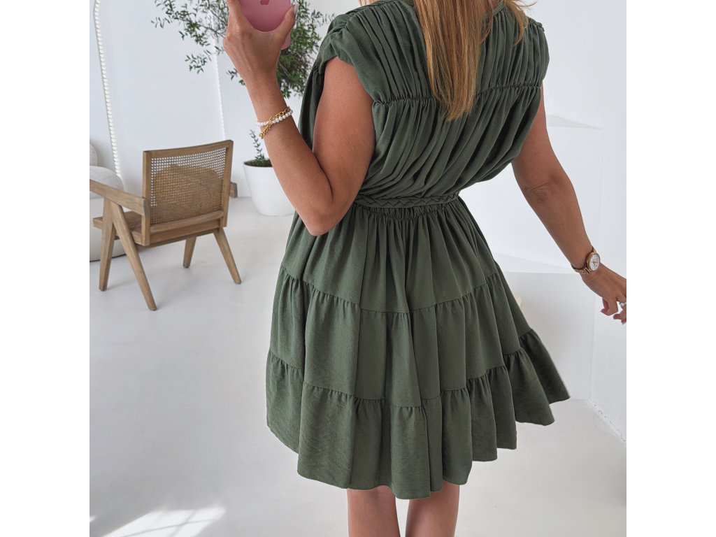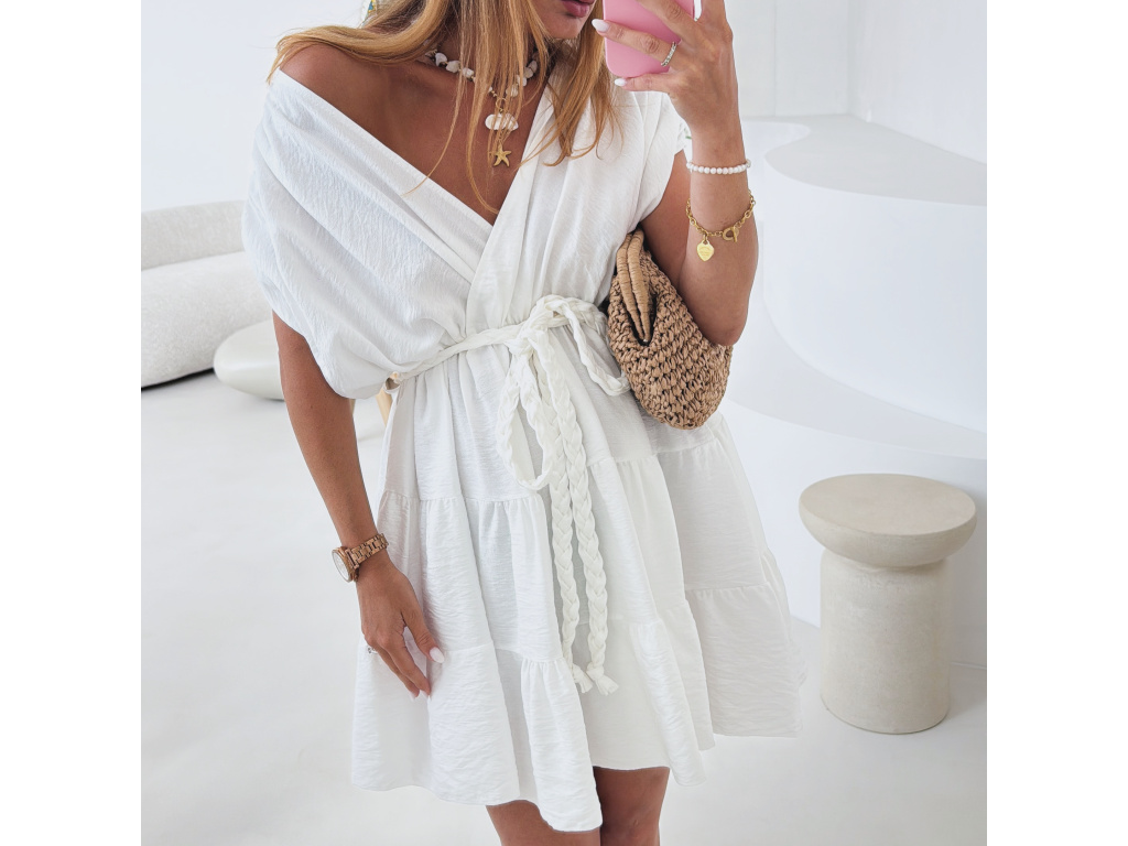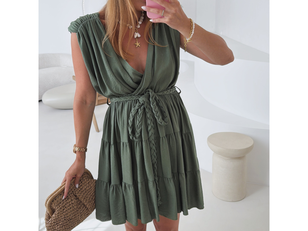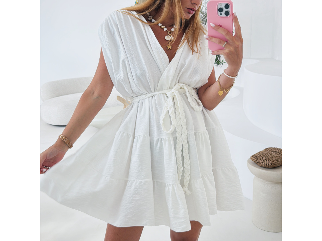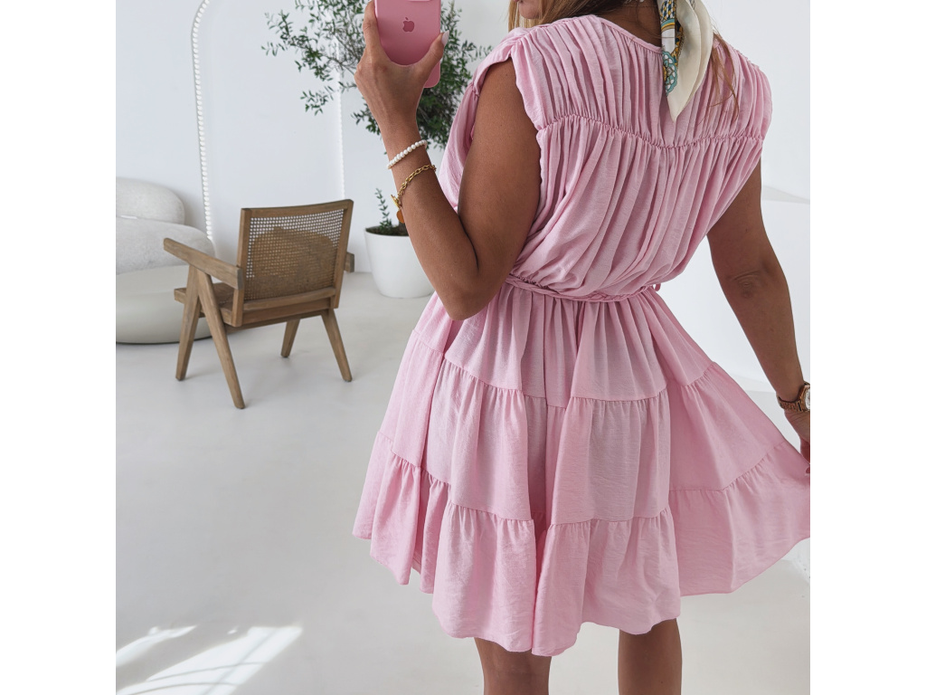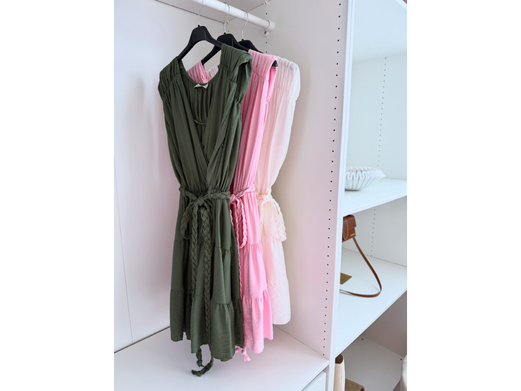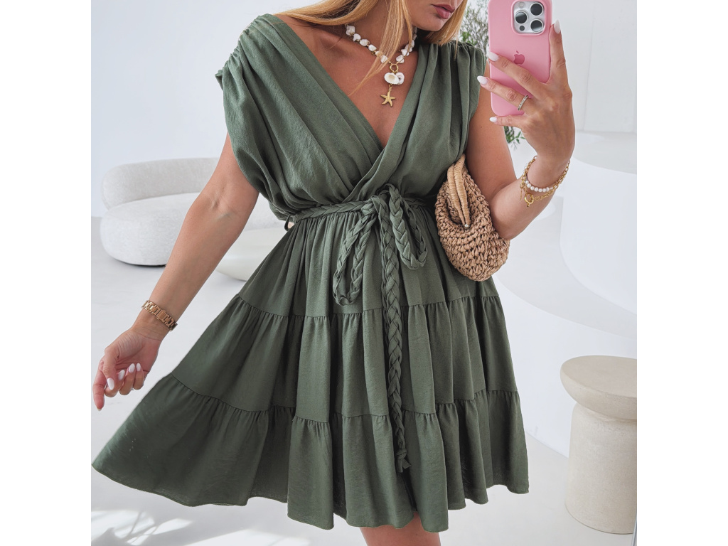 Lehké krátké šaty s volánovými vrstvami dostupné v bílé, růžové a khaki barvě. Mají zavinovací výstřih do V a pletený pásek, který zvýrazní pas. Díky volnému střihu jsou pohodlné a vzdušné – ideální na letní dny, dovolenou nebo procházky po městě. Velikost je univerzální, sedí na XS až L.