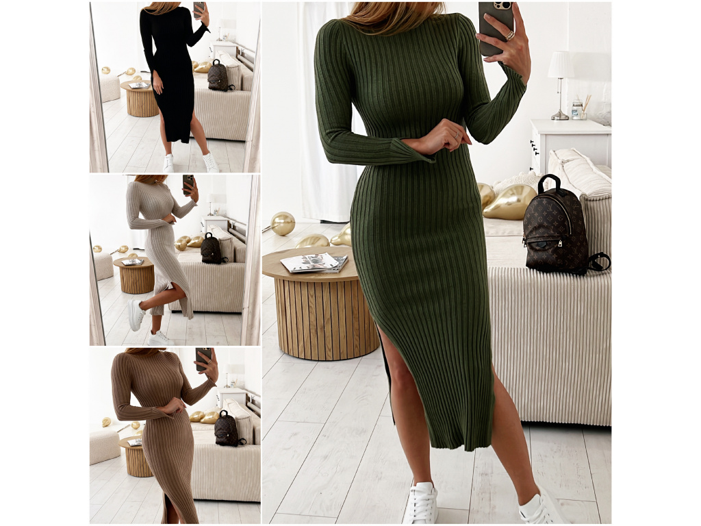 Extra příjemné a pružné, úpletové šaty se stojáčkem a dlouhým rukávem s rozparky. Barva khaki, černá, camel a béžová. Velikost je univerzální, sedí na XS,S, M i menší L. Šaty jsou dostatečně pružné a natáhnou se až o 20 cm. Foceno na XSku a výšce 165 cm.