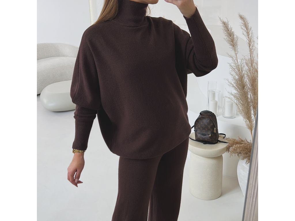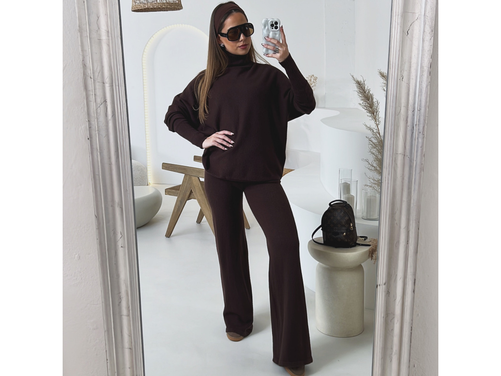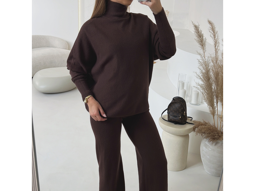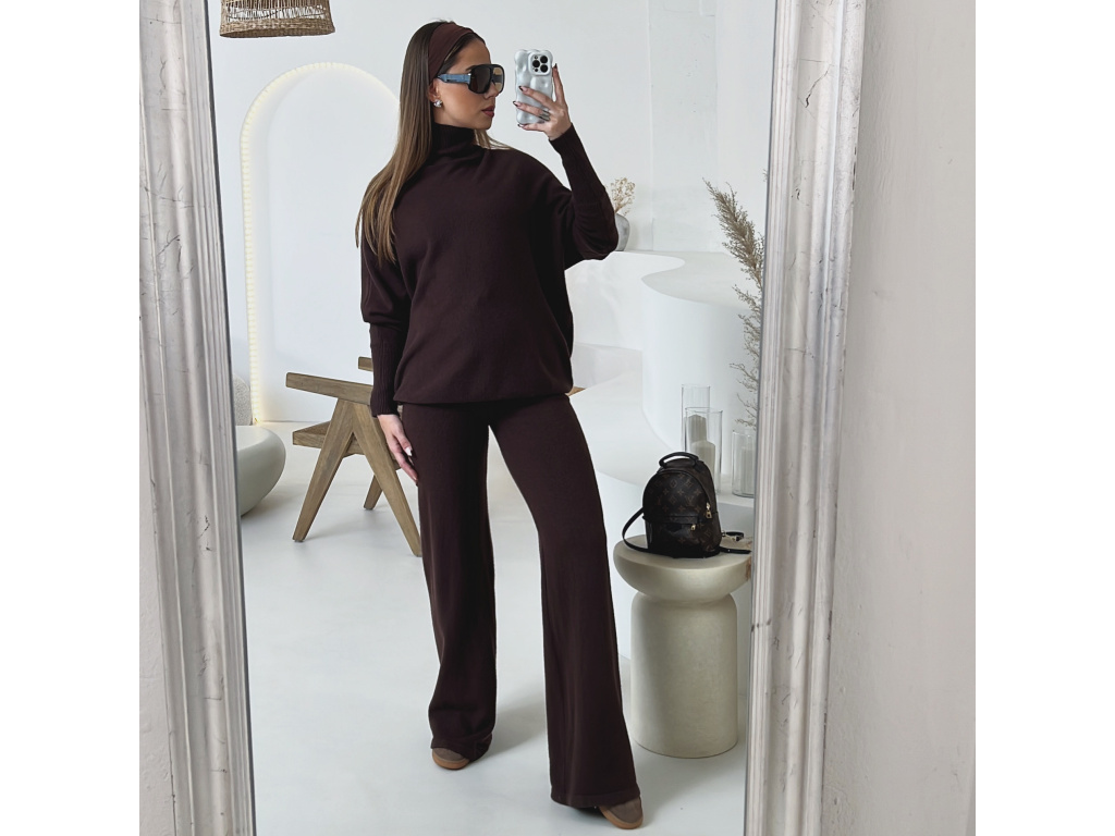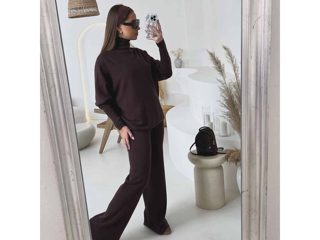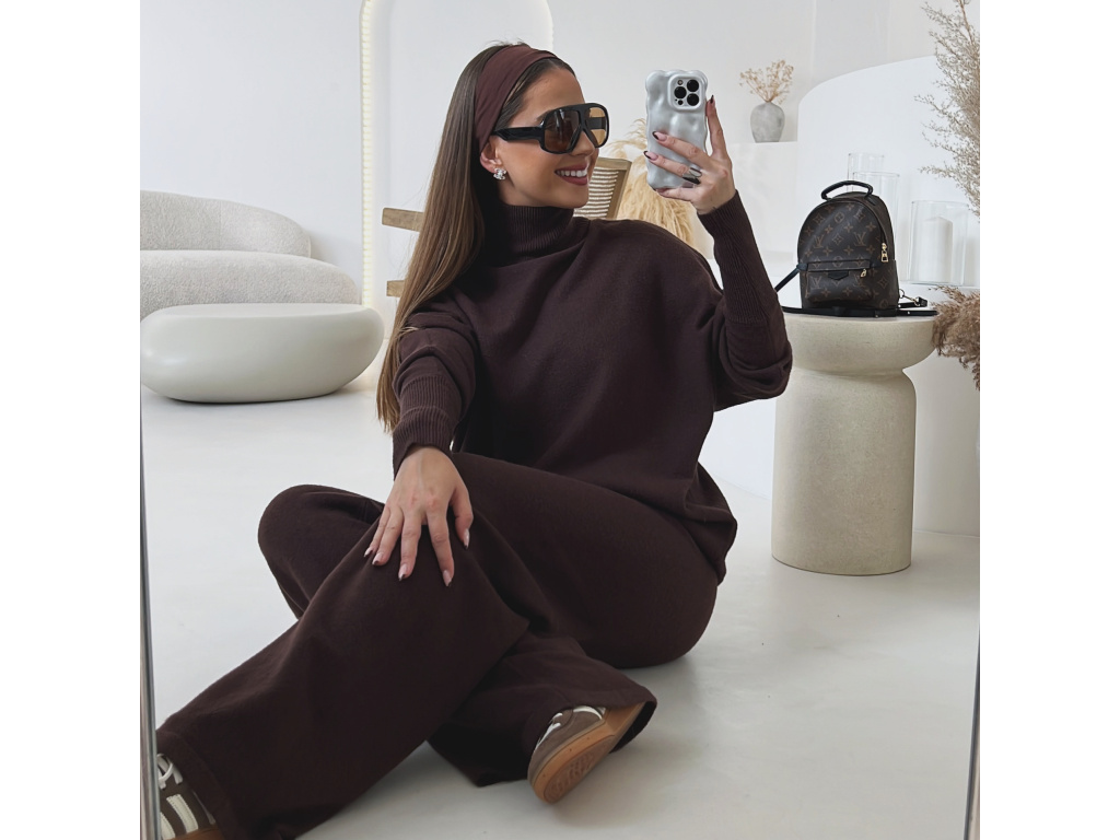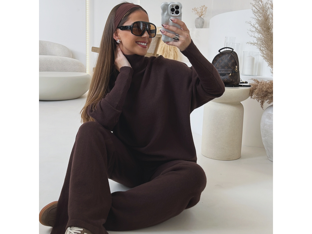 Elegantní čokoládový úpletový set Velvory je ztělesněním pohodlí a stylu. Souprava se skládá z volnějšího svetříku s rolákem a pohodlných kalhot s elastickým pasem na šňůrku. Materiál je měkký, extrémně pružný a příjemný na dotek, ideální pro každodenní nošení i ležérní elegance.