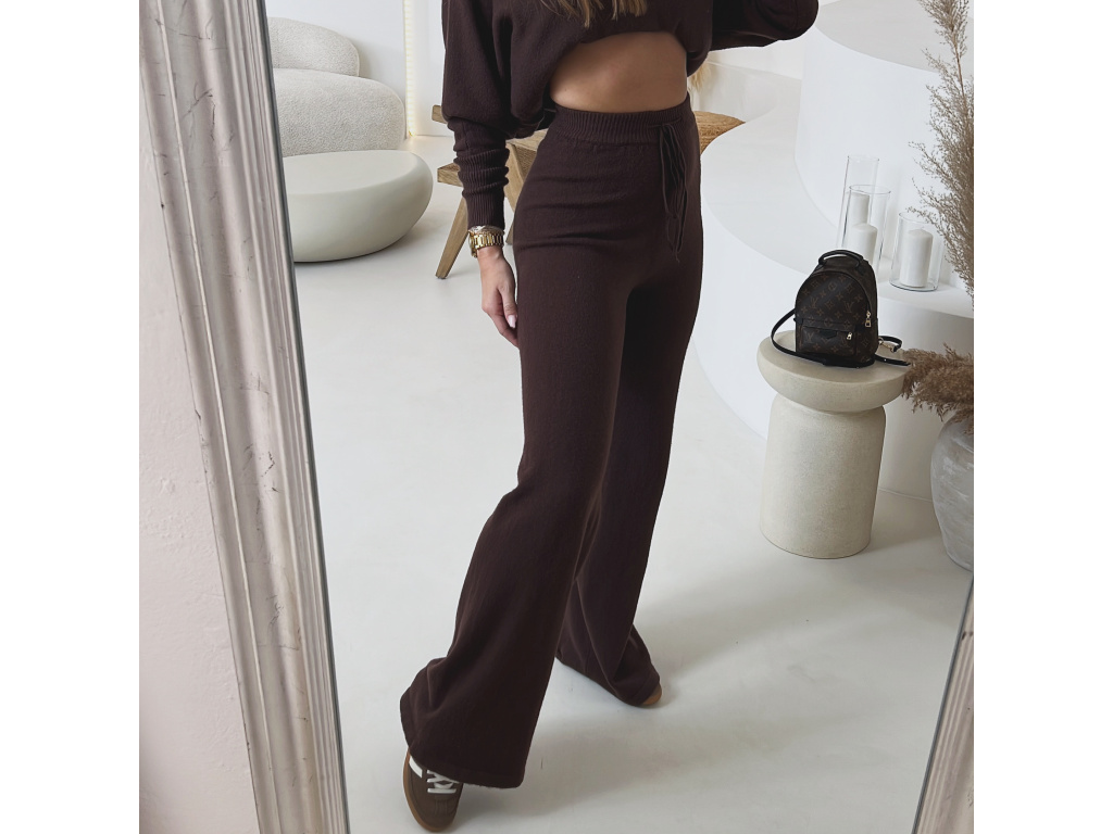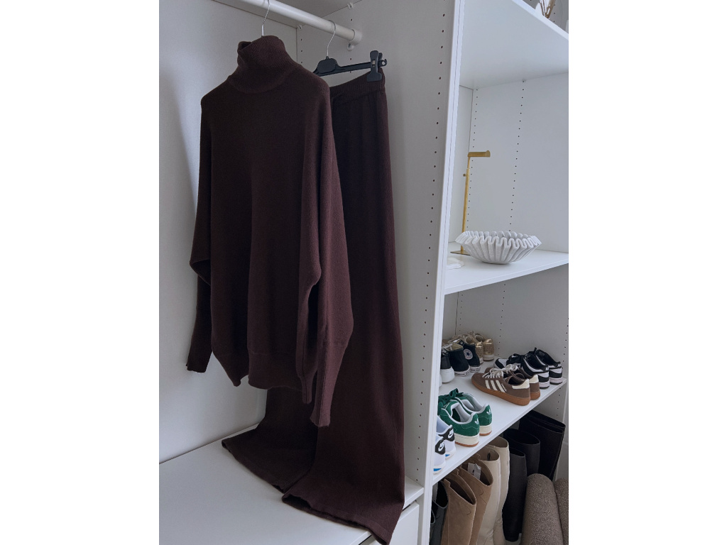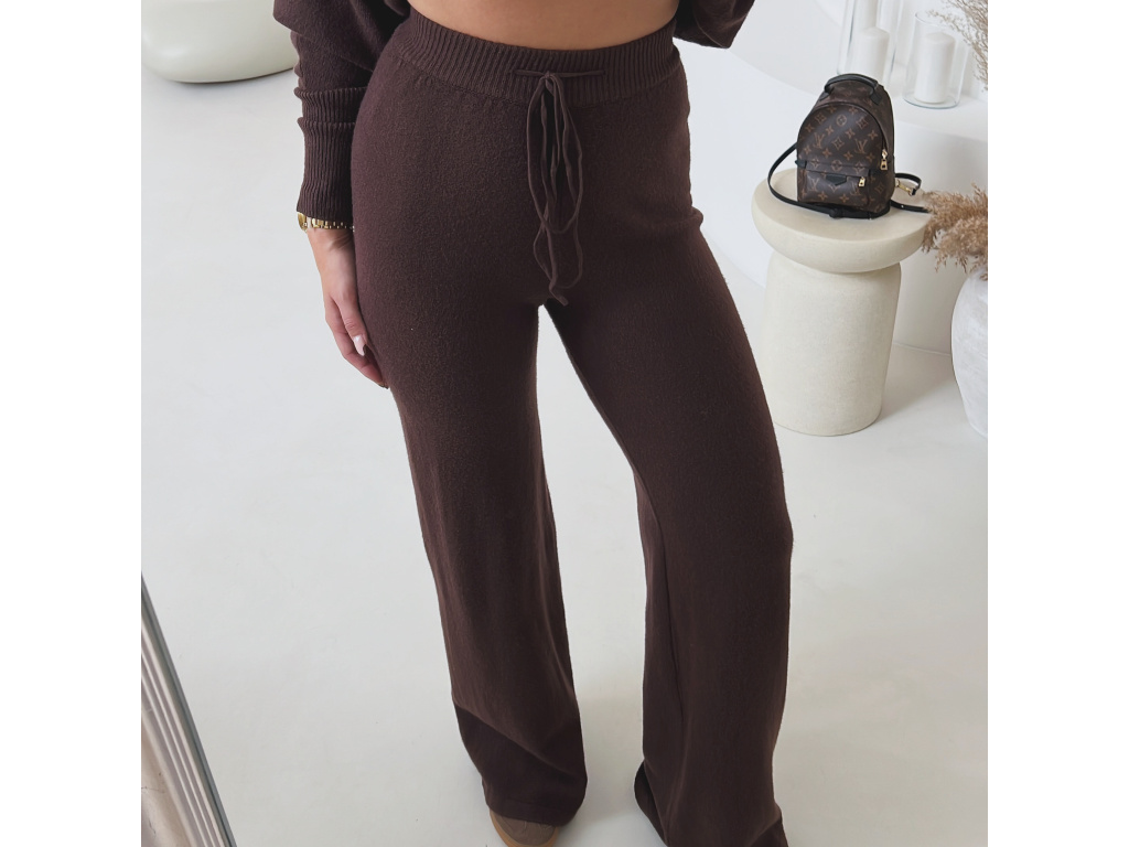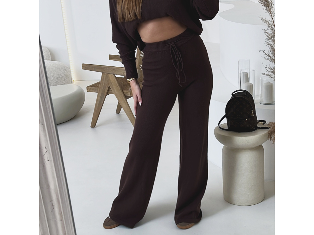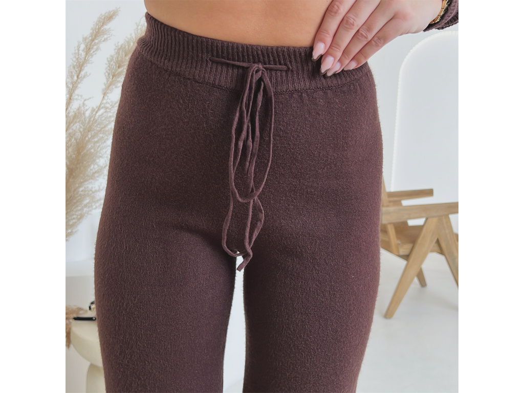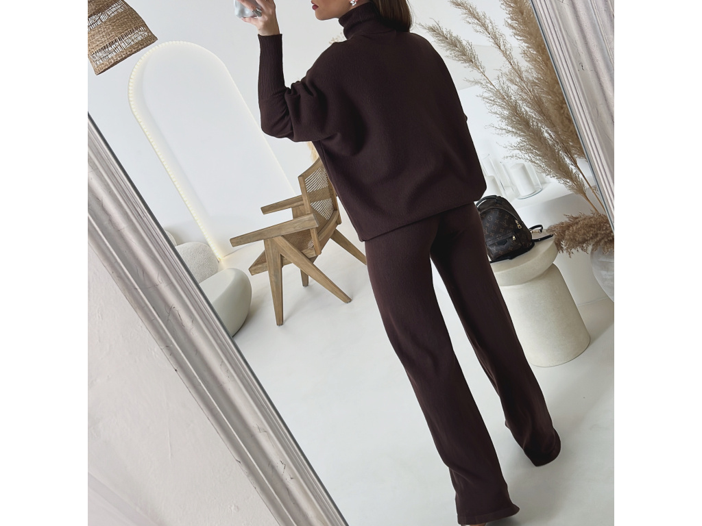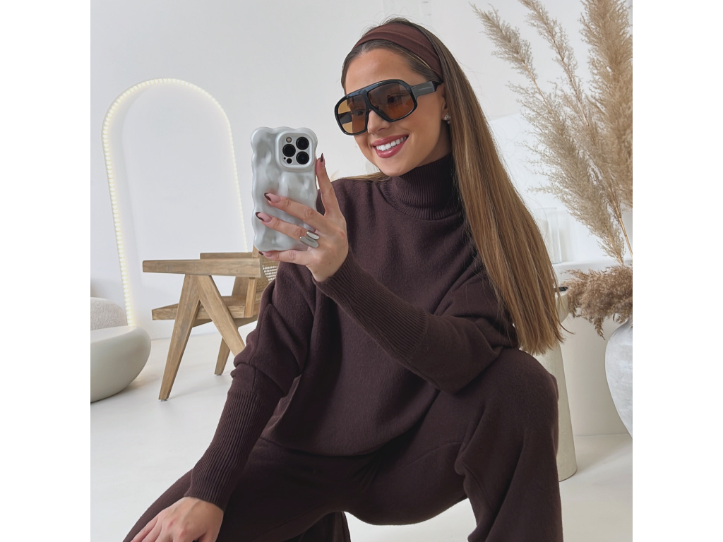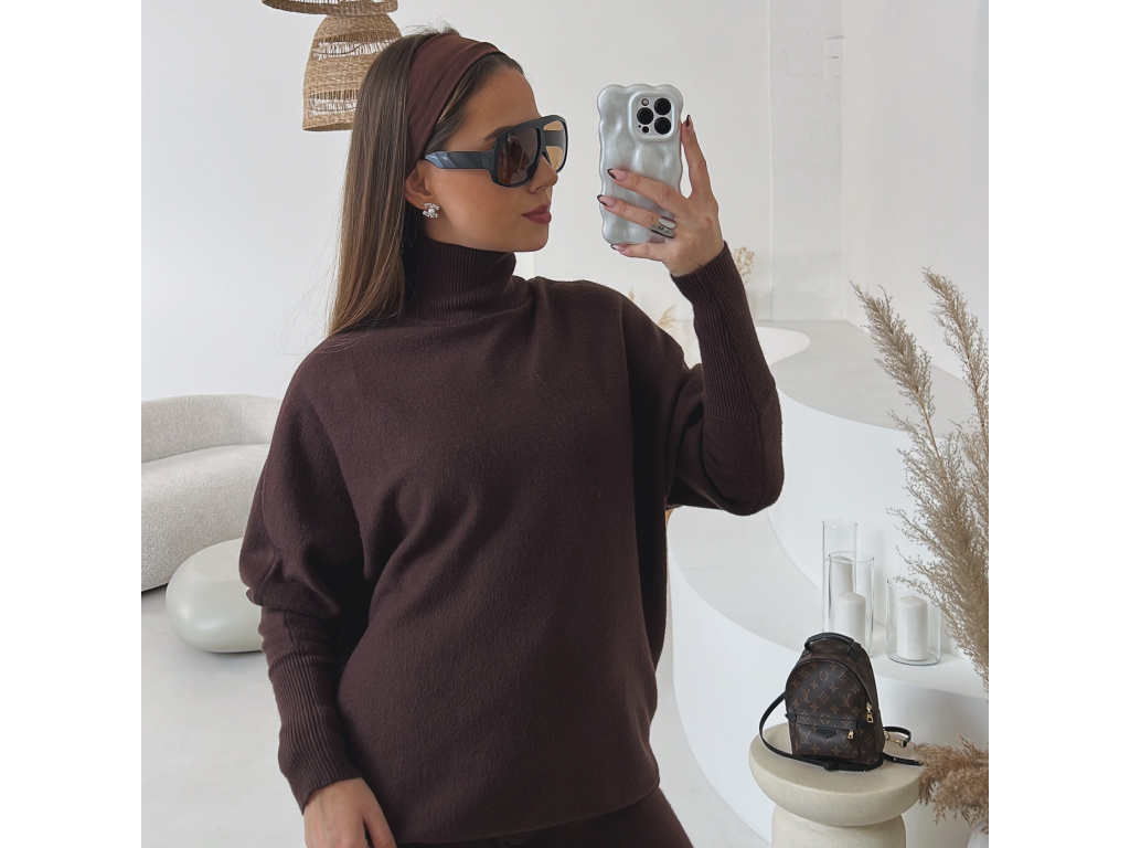 Elegantní čokoládový úpletový set Velvory je ztělesněním pohodlí a stylu. Souprava se skládá z volnějšího svetříku s rolákem a pohodlných kalhot s elastickým pasem na šňůrku. Materiál je měkký, extrémně pružný a příjemný na dotek, ideální pro každodenní nošení i ležérní elegance.