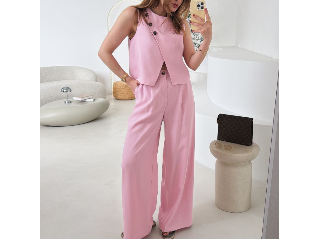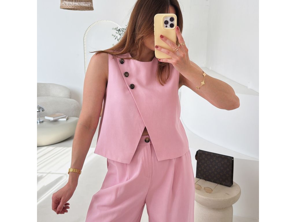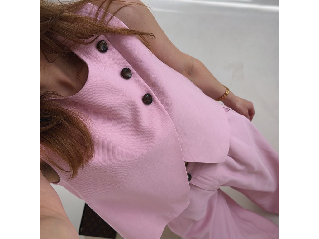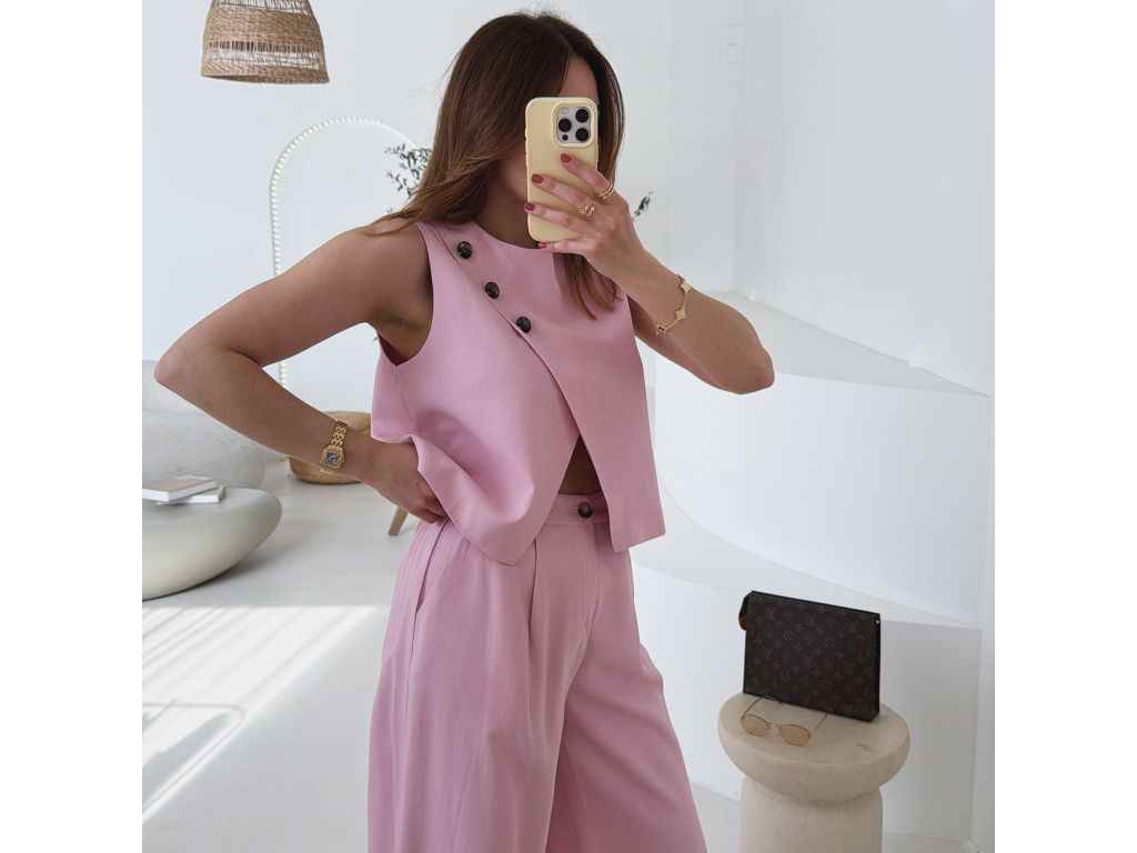 Elegantní kostýmek, který spojuje ženskost a pohodlí v jednom. Skládá se z topu ve stylu vesty a volnějších kalhot, které společně tvoří dokonale sladěný outfit.