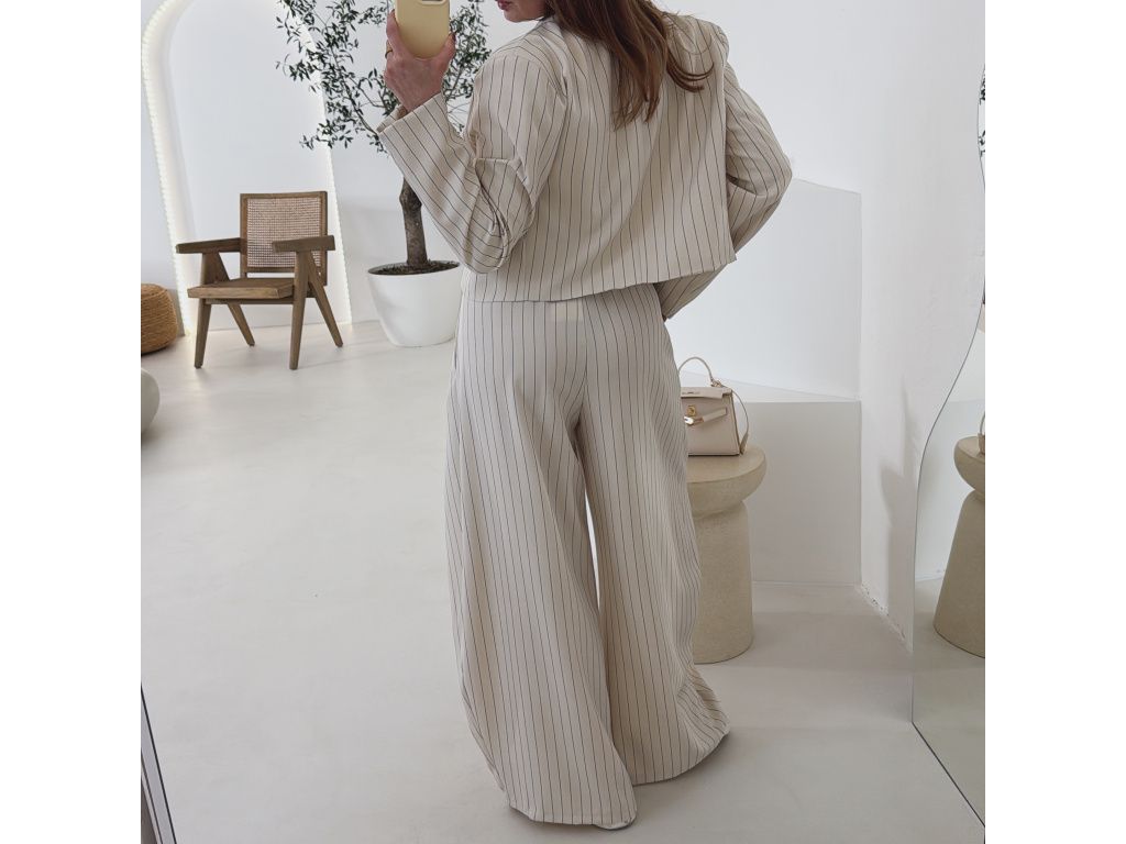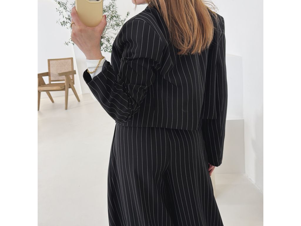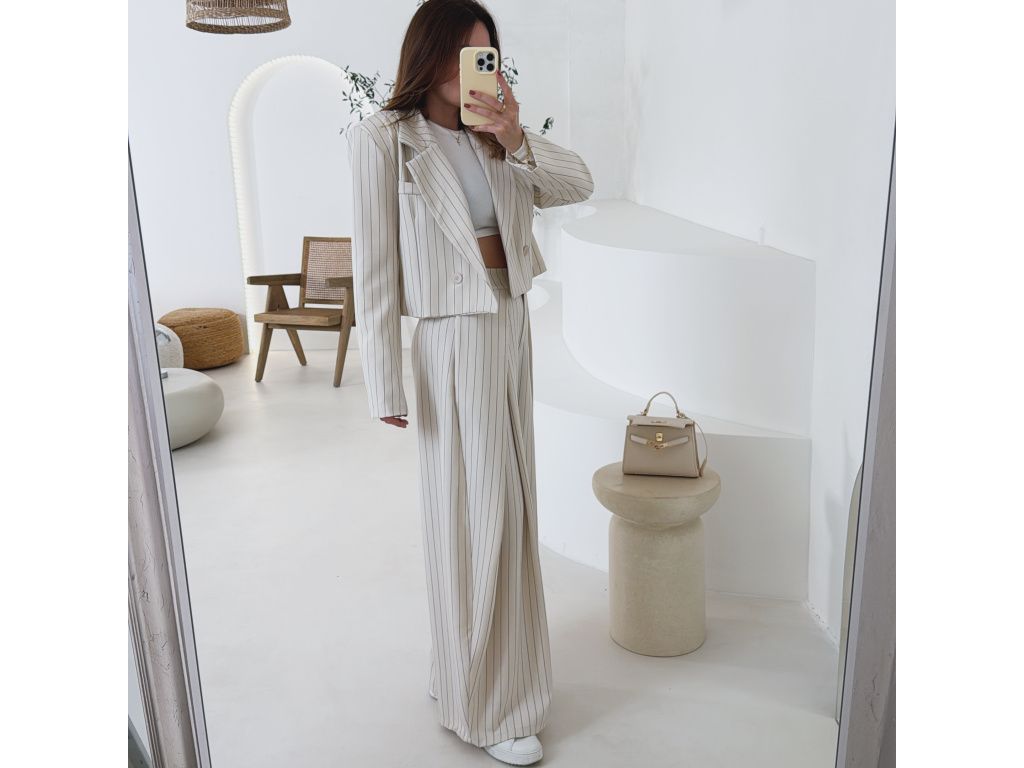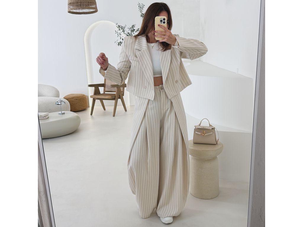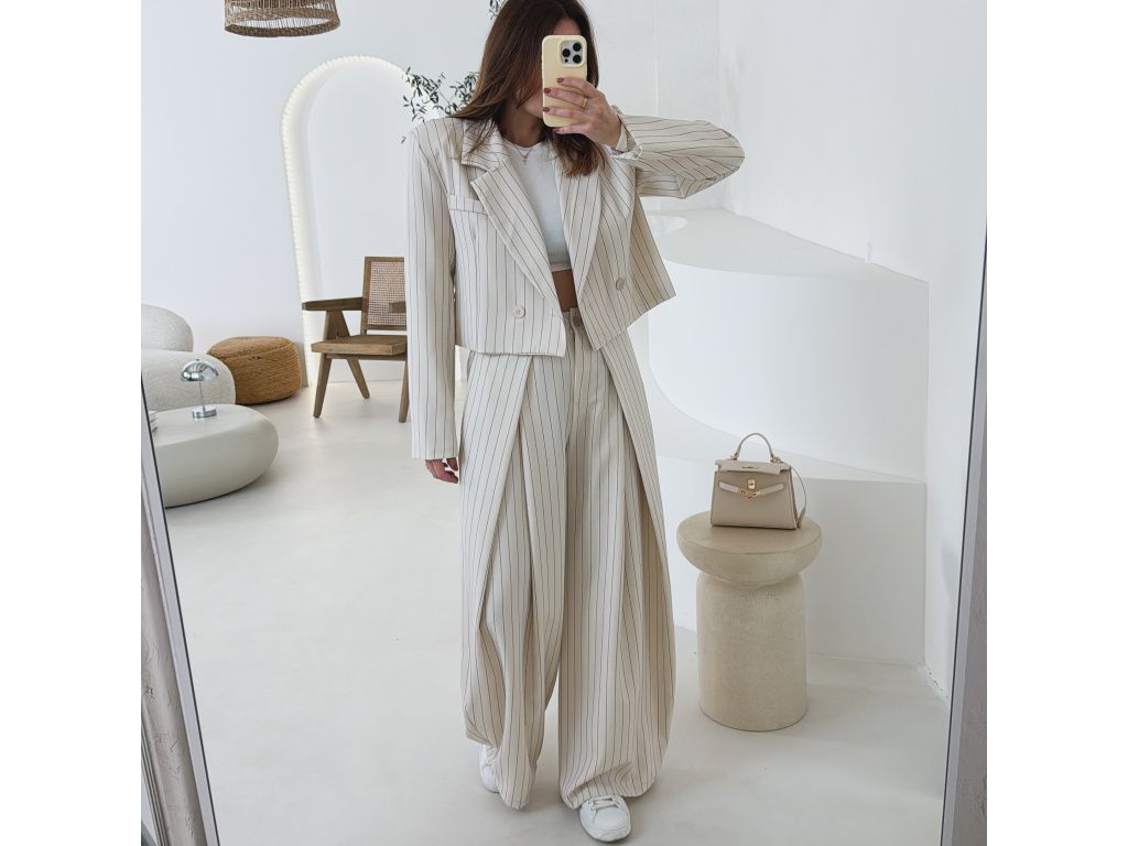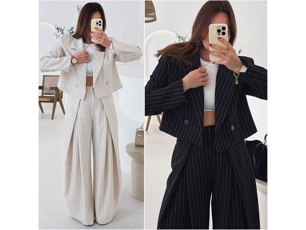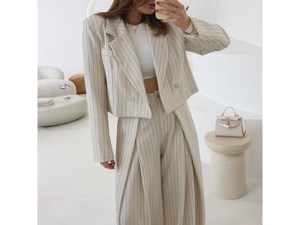 Elegantní kostým tvořený kalhotami a crop sakem v jemném proužku. Kalhoty mají v pase elastickou gumu, díky které se krásně přizpůsobí postavě, sako má mírně vystužená ramena a zkrácený střih. Kostým je dostupný v krémově béžové a černé barvě, velikost je univerzální a sedí na XS až M.