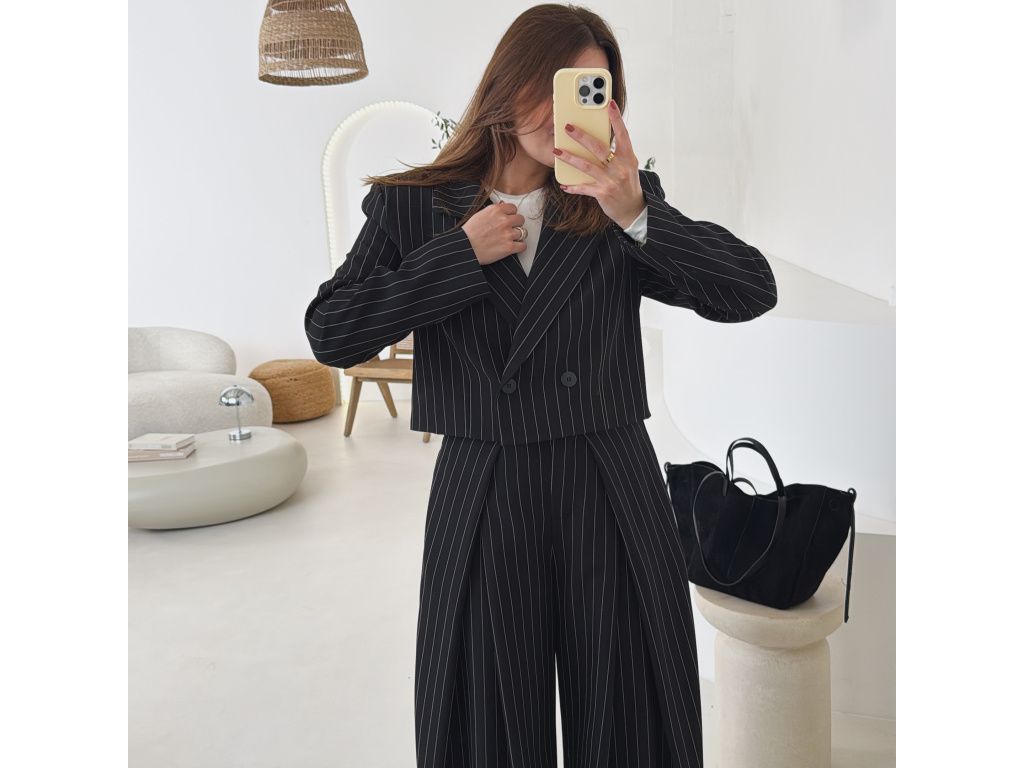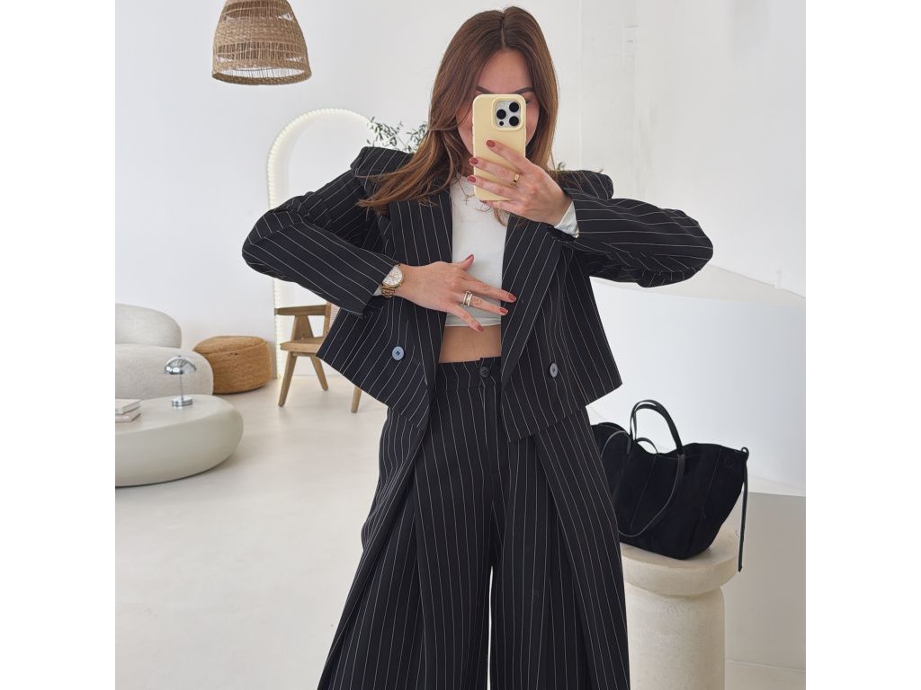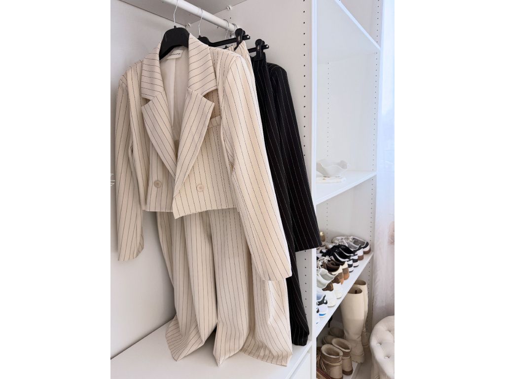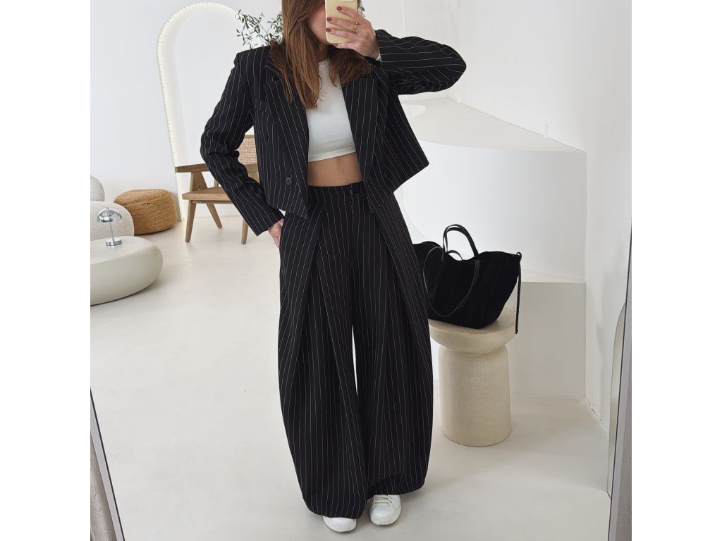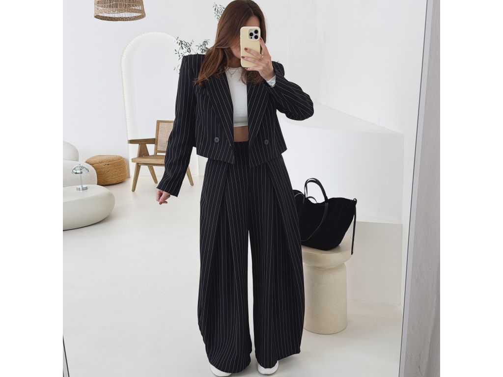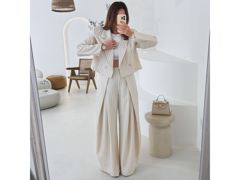 Elegantní kostým tvořený kalhotami a crop sakem v jemném proužku. Kalhoty mají v pase elastickou gumu, díky které se krásně přizpůsobí postavě, sako má mírně vystužená ramena a zkrácený střih. Kostým je dostupný v krémově béžové a černé barvě, velikost je univerzální a sedí na XS až M.