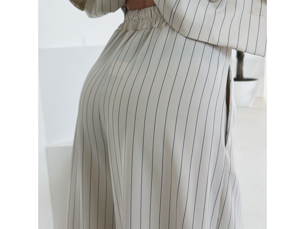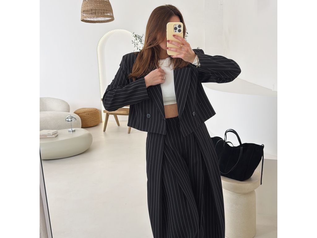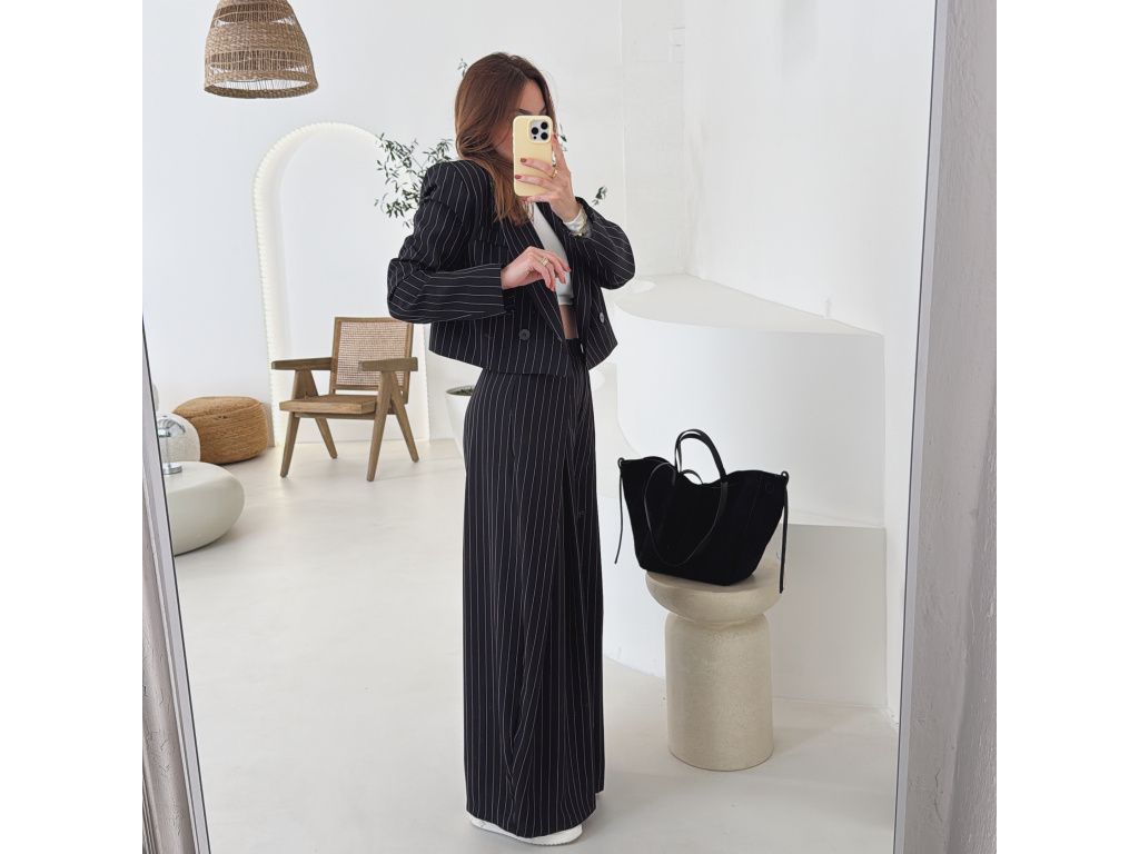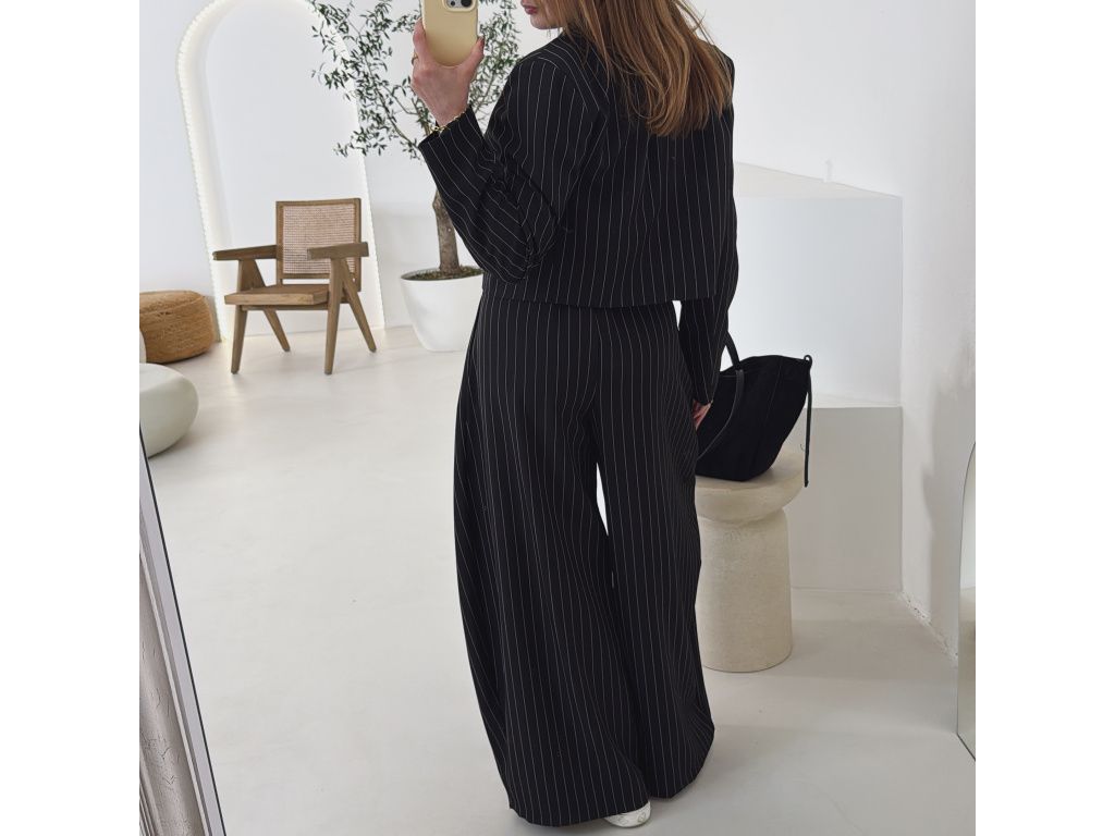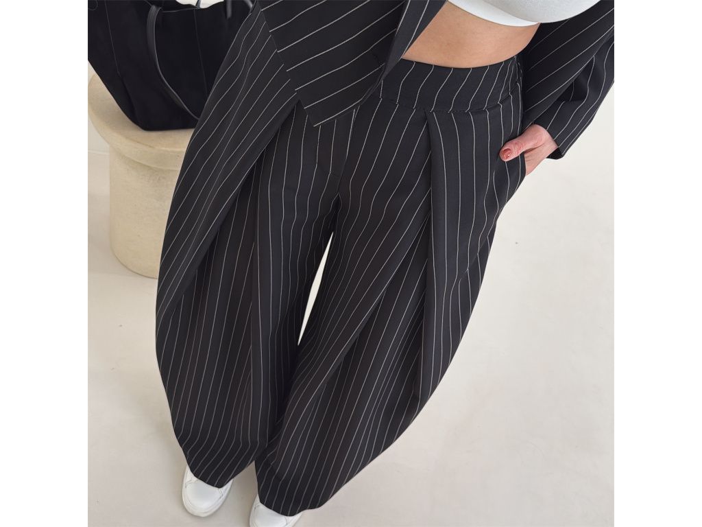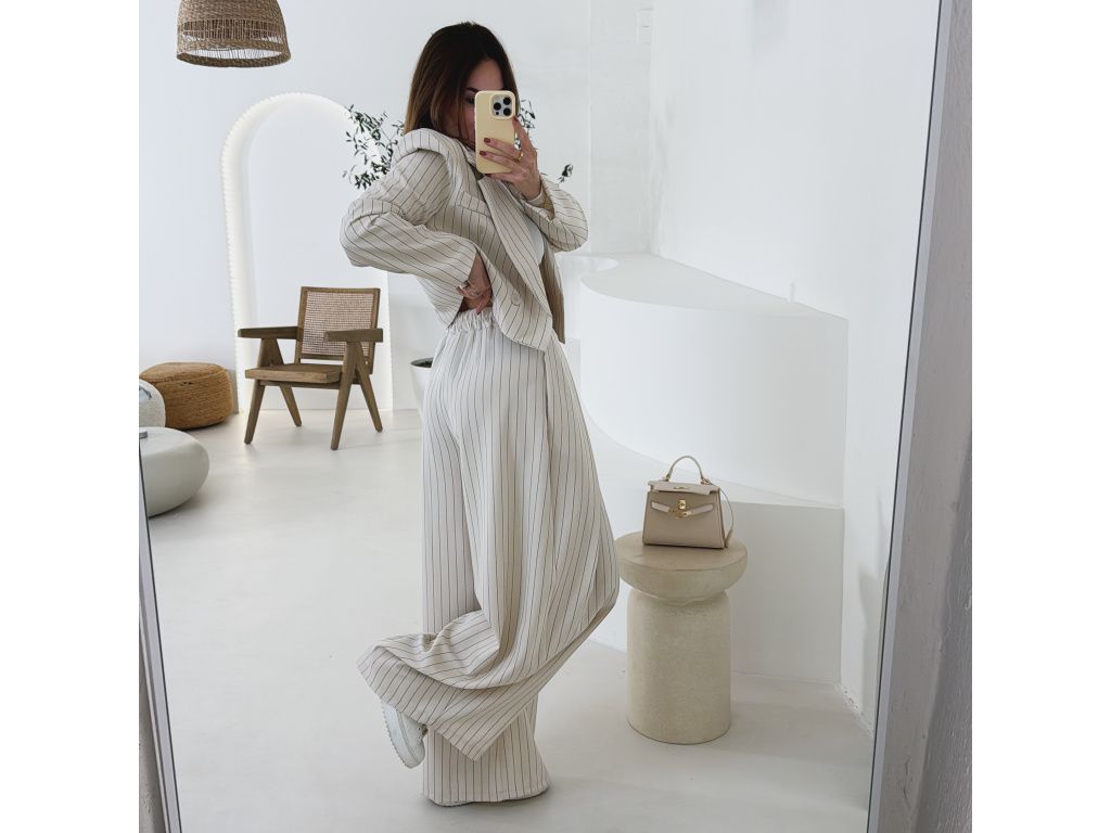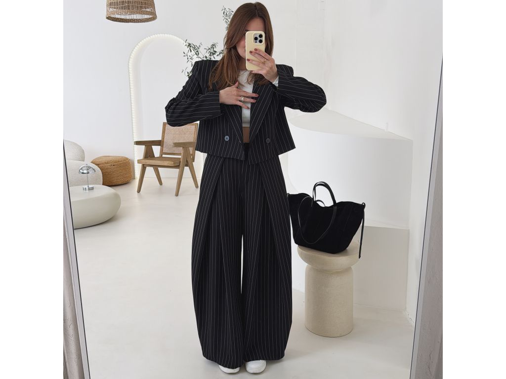 Elegantní kostým tvořený kalhotami a crop sakem v jemném proužku. Kalhoty mají v pase elastickou gumu, díky které se krásně přizpůsobí postavě, sako má mírně vystužená ramena a zkrácený střih. Kostým je dostupný v krémově béžové a černé barvě, velikost je univerzální a sedí na XS až M.