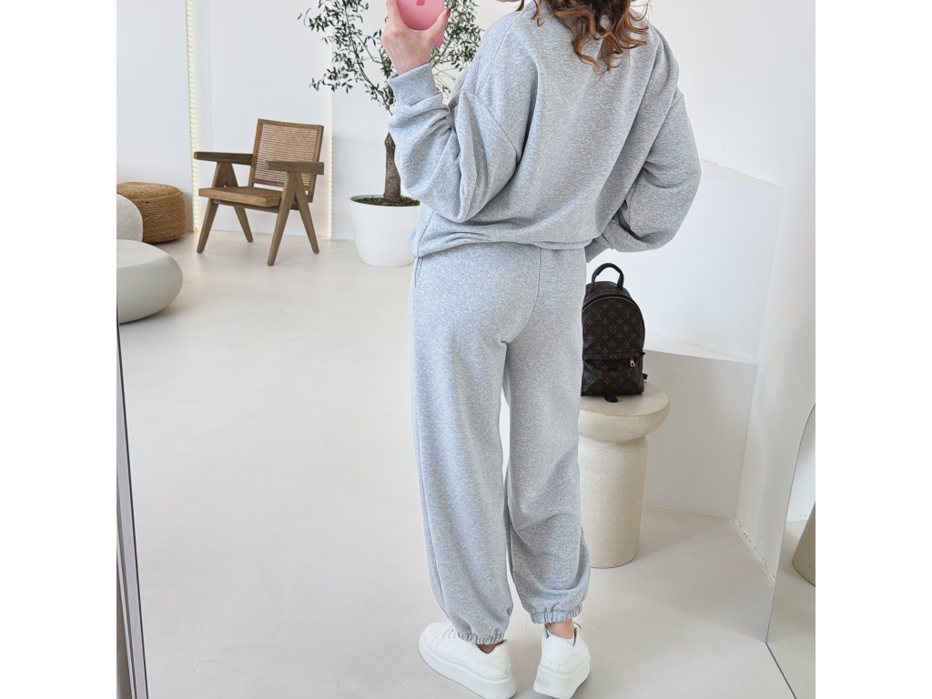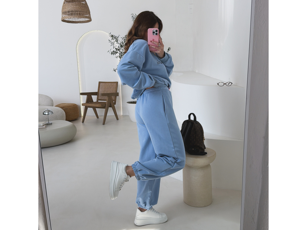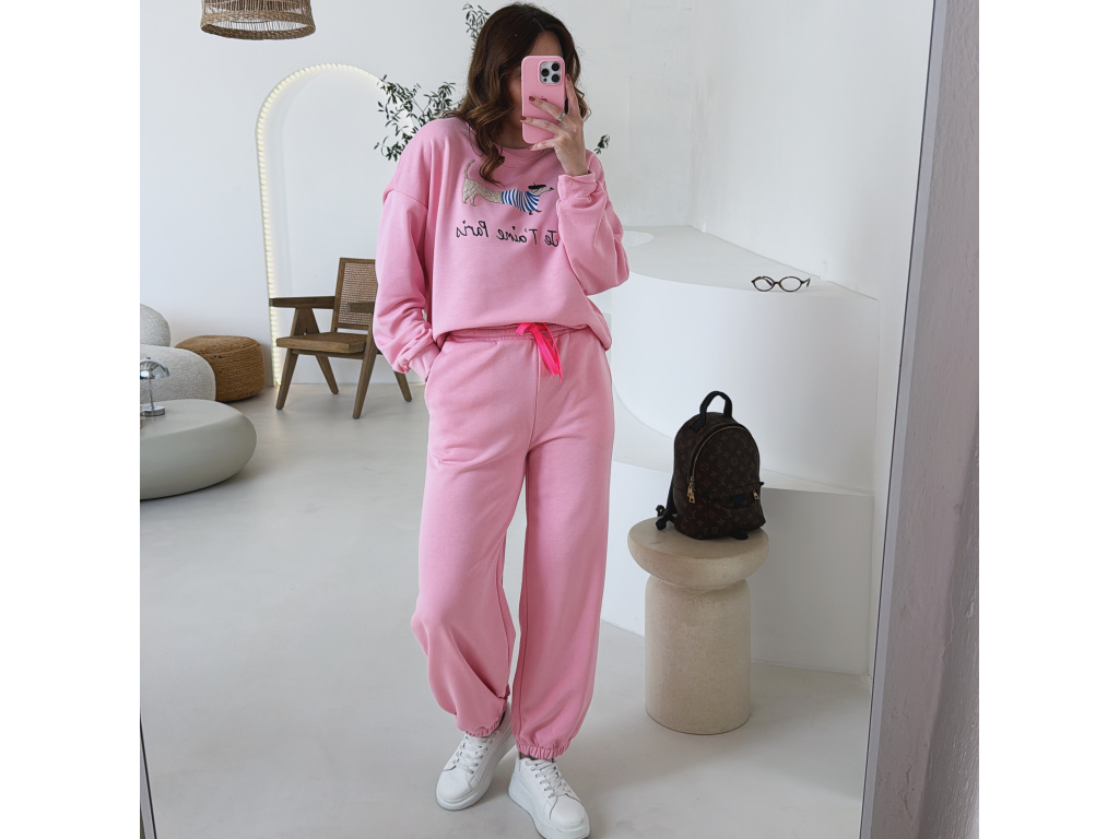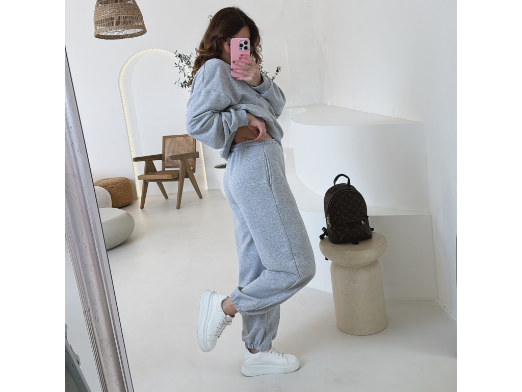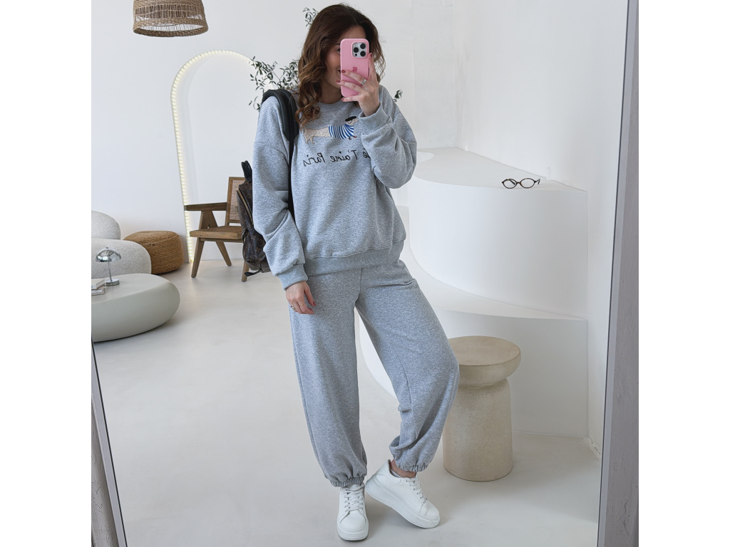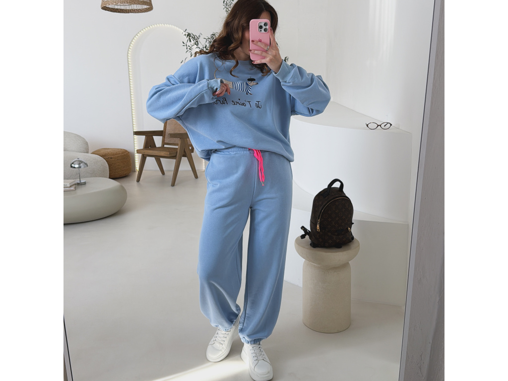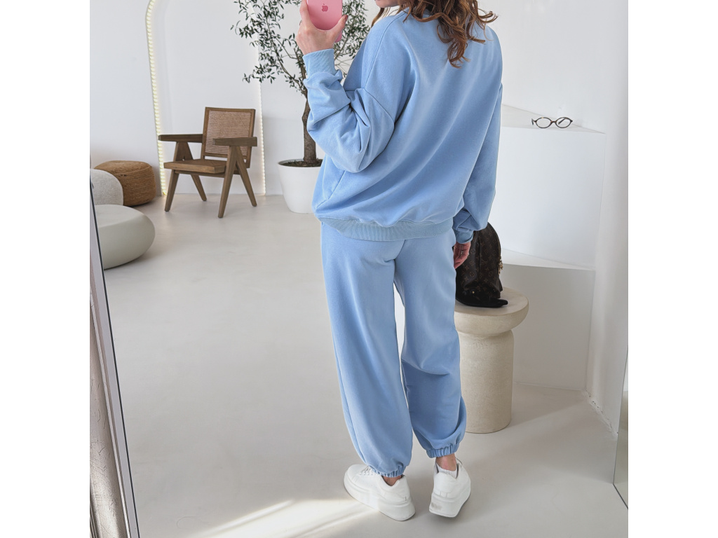 Pohodlná tepláková souprava, která je ideální na každodenní nošení i volný čas. Souprava se skládá z mikiny s potiskem a tepláků. Mikina má volnější střih a je vyrobena z velmi příjemného, hutnějšího materiálu s podílem 65 % bavlny, takže je měkká, pohodlná a krásně drží tvar. Tepláky mají v pase gumu se šňůrkou na stažení, po stranách kapsy a nohavice jsou zakončené do gumy. Souprava je v univerzální velikosti, která sedí od XS po menší L.