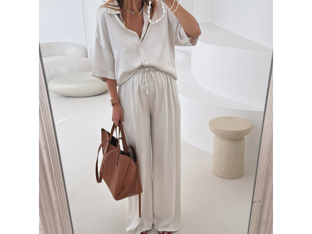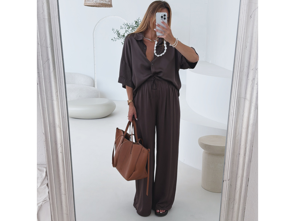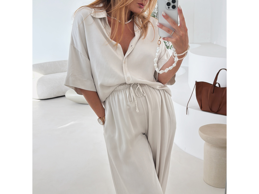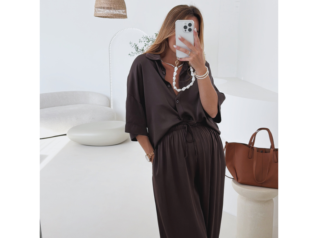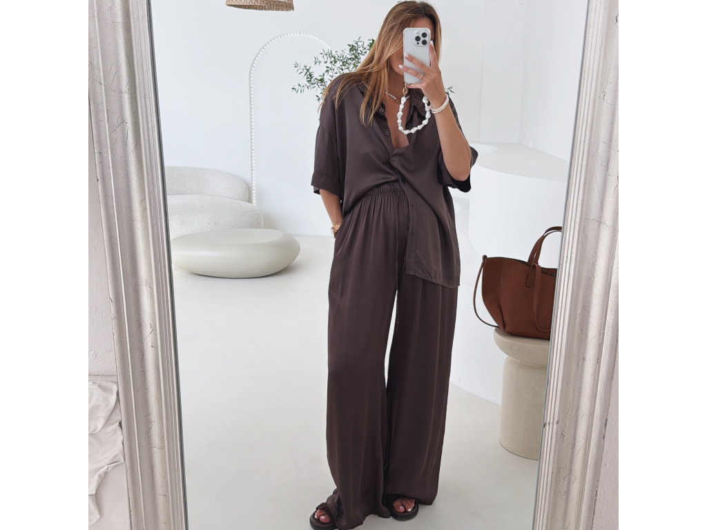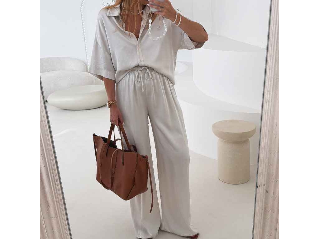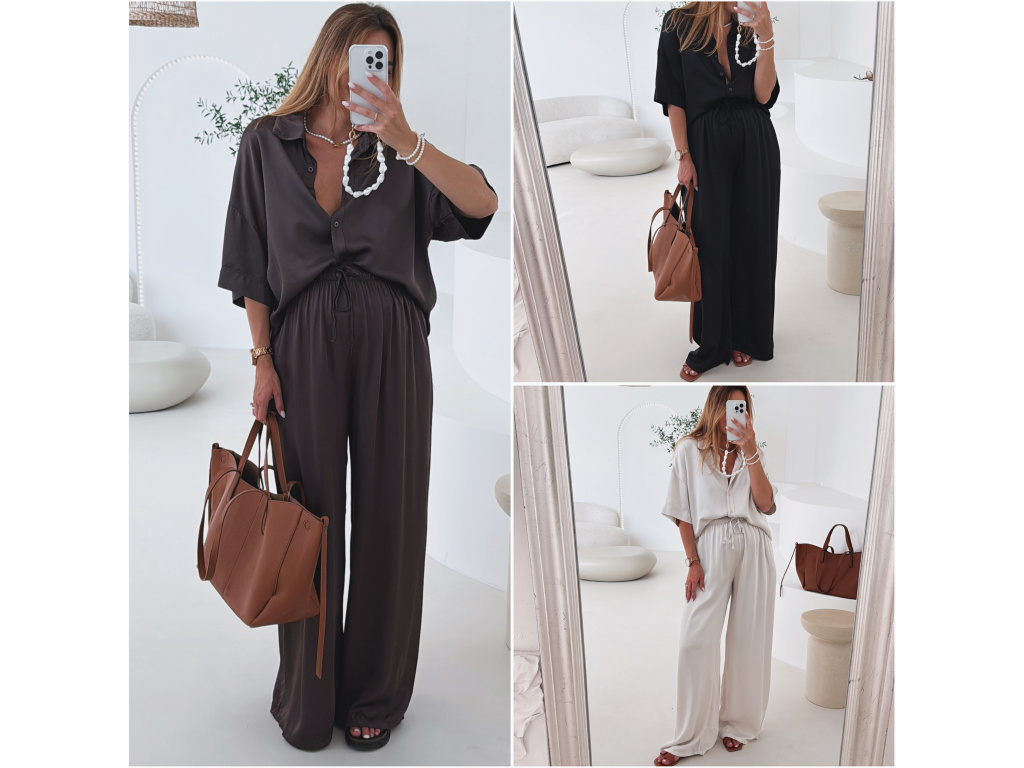 Elegantní a pohodlný set z lesklého materiálu, který dodá outfitu šmrnc i lehkost. Kalhoty s gumou v pase a kapsami zajišťují komfort, zatímco volnější košile na knoflíky v mírně oversize střihu působí ležérně a stylově. Perfektní volba na všední den i speciální příležitosti. Velikost je univerzální, sedí od XS až po menší L.