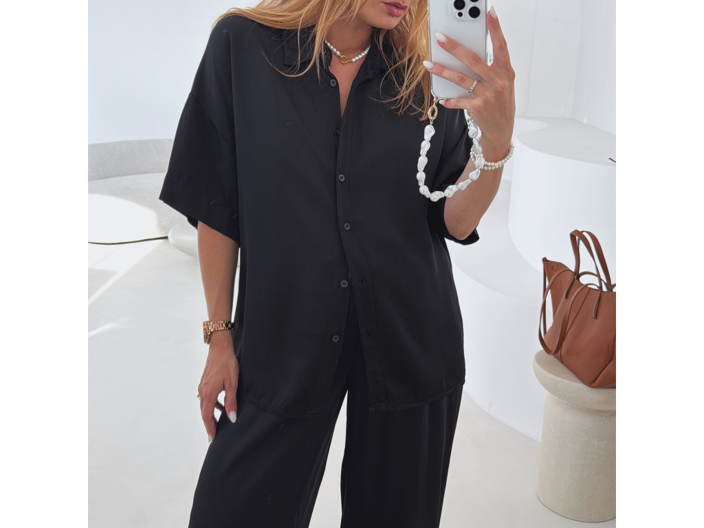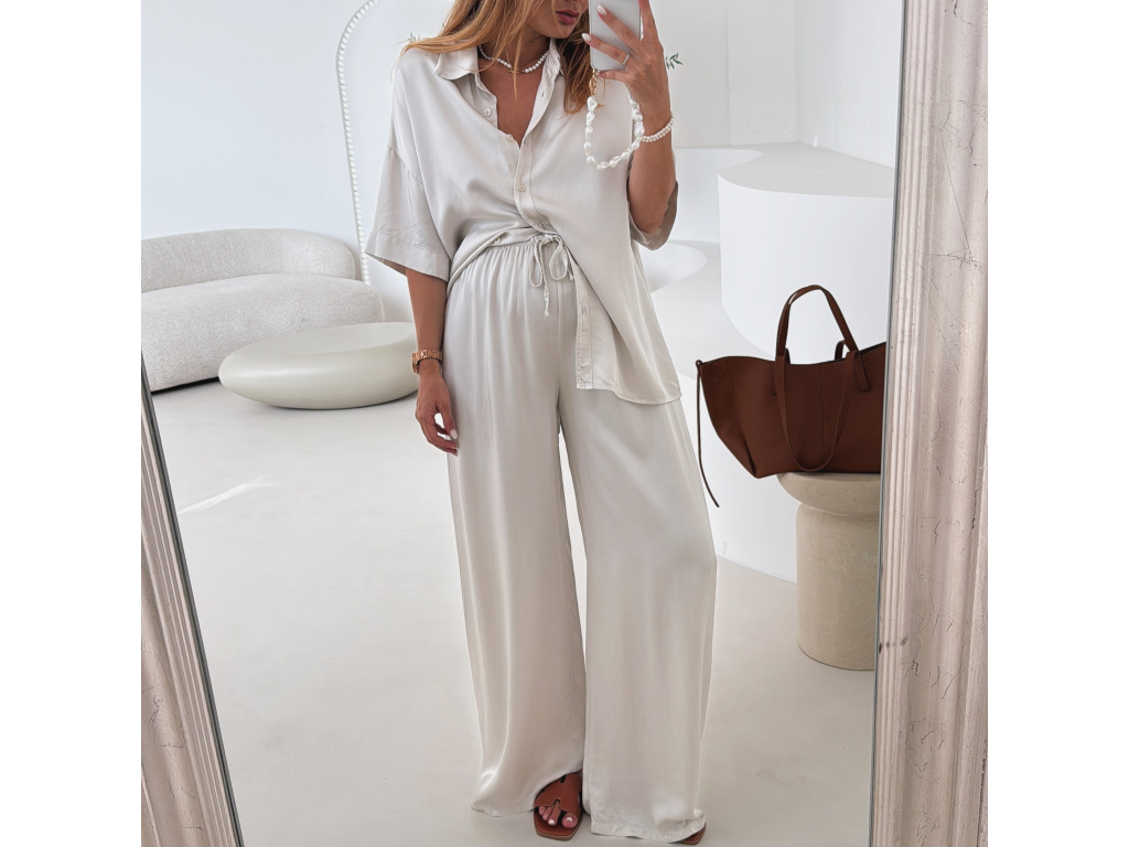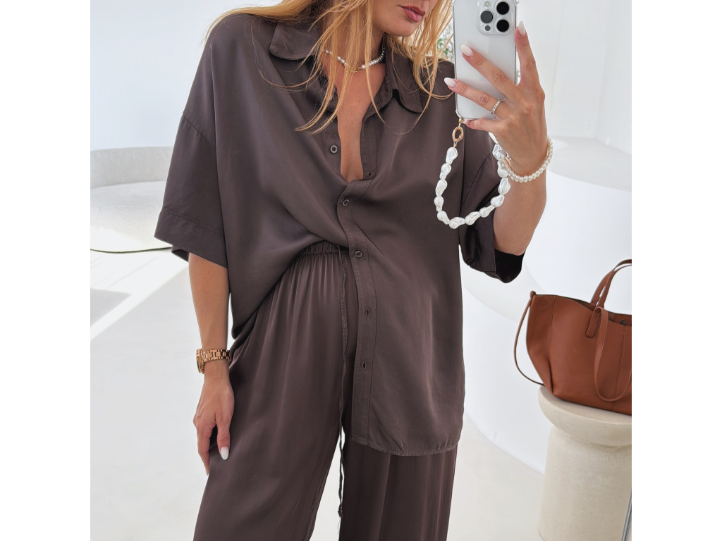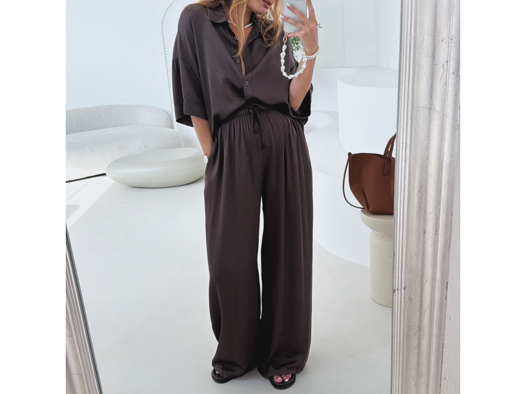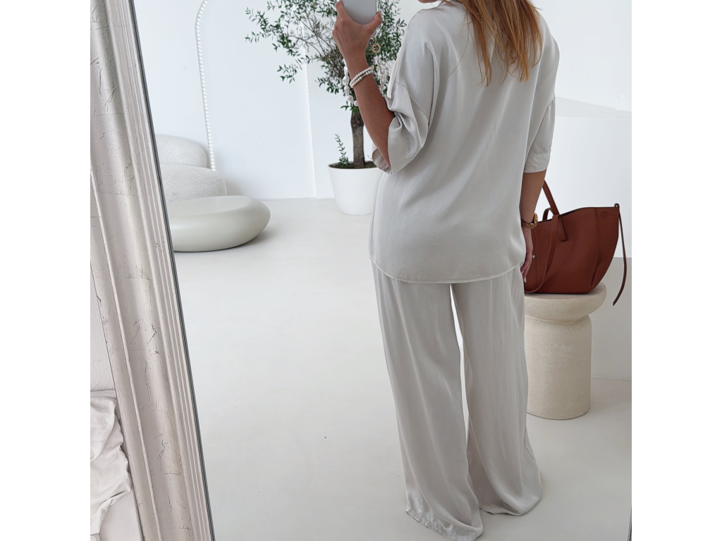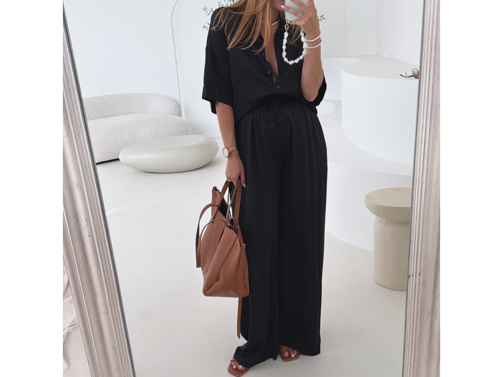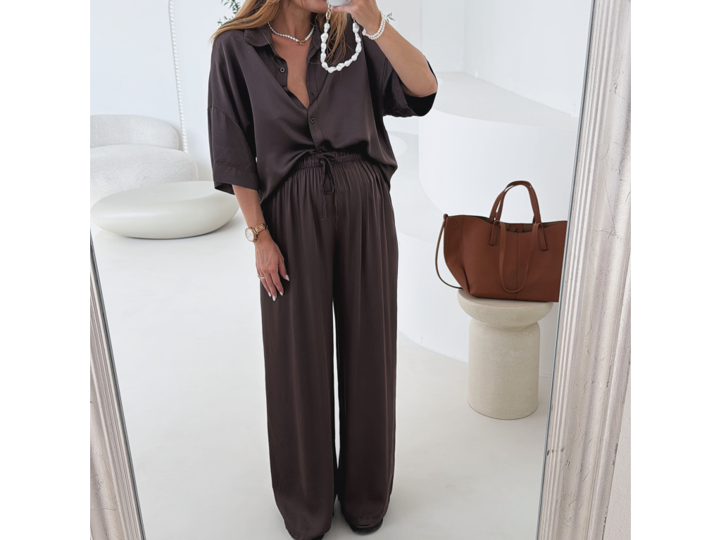 Elegantní a pohodlný set z lesklého materiálu, který dodá outfitu šmrnc i lehkost. Kalhoty s gumou v pase a kapsami zajišťují komfort, zatímco volnější košile na knoflíky v mírně oversize střihu působí ležérně a stylově. Perfektní volba na všední den i speciální příležitosti. Velikost je univerzální, sedí od XS až po menší L.