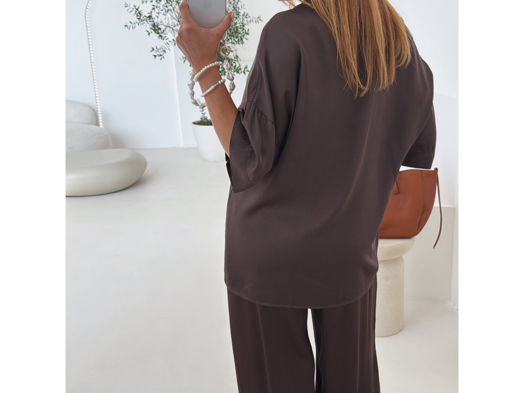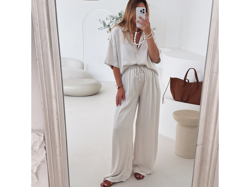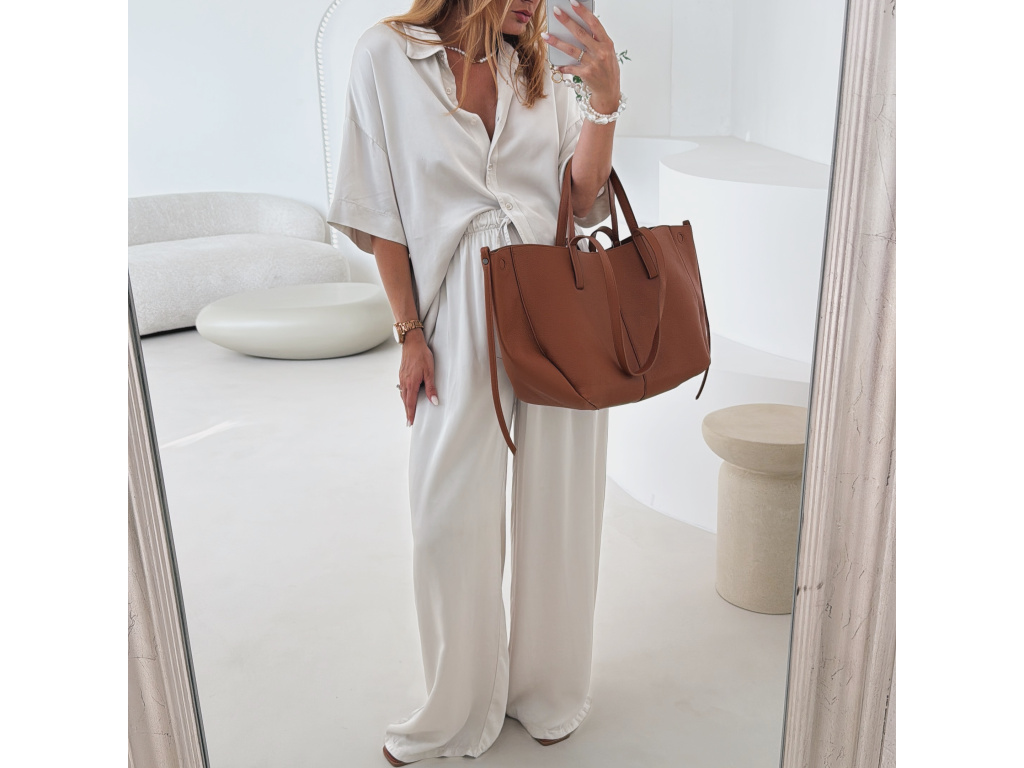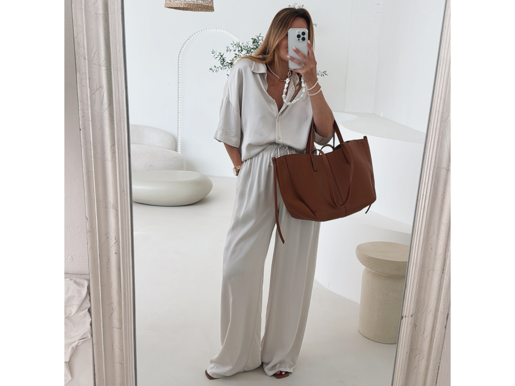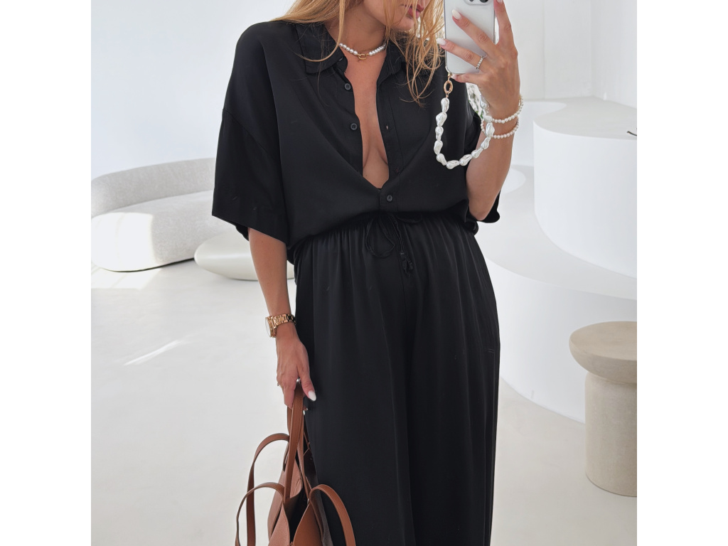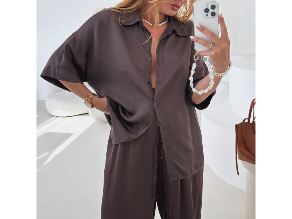 Elegantní a pohodlný set z lesklého materiálu, který dodá outfitu šmrnc i lehkost. Kalhoty s gumou v pase a kapsami zajišťují komfort, zatímco volnější košile na knoflíky v mírně oversize střihu působí ležérně a stylově. Perfektní volba na všední den i speciální příležitosti. Velikost je univerzální, sedí od XS až po menší L.