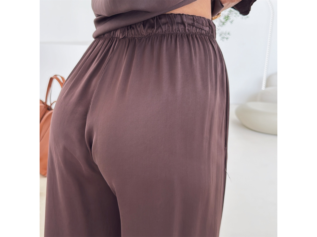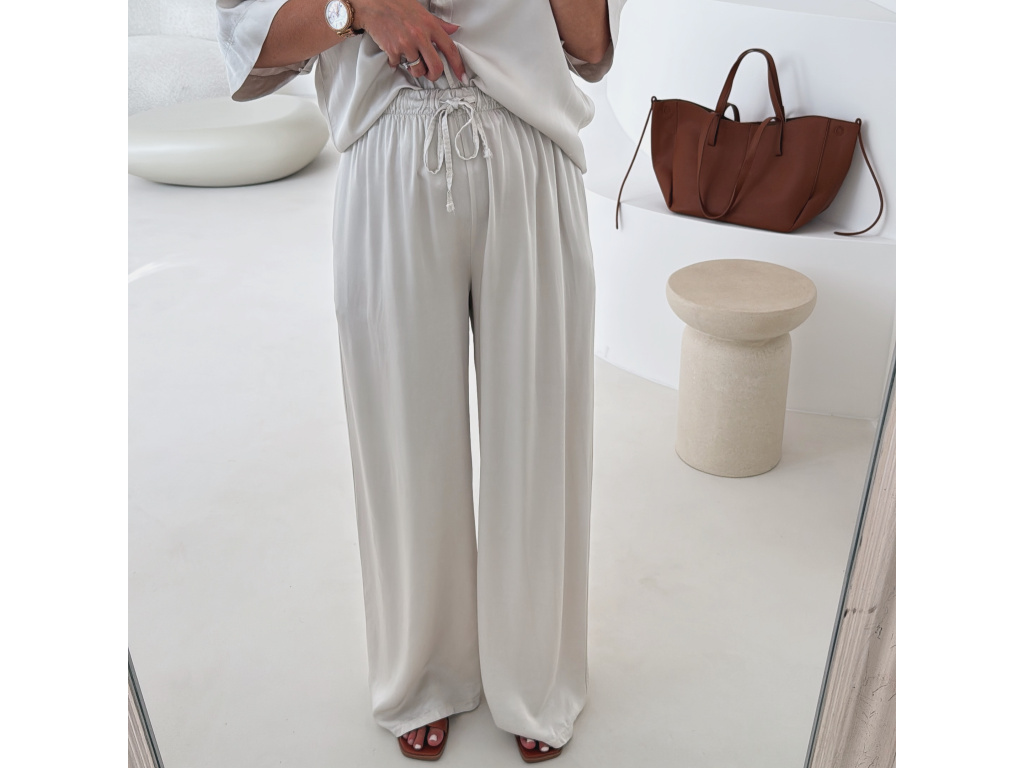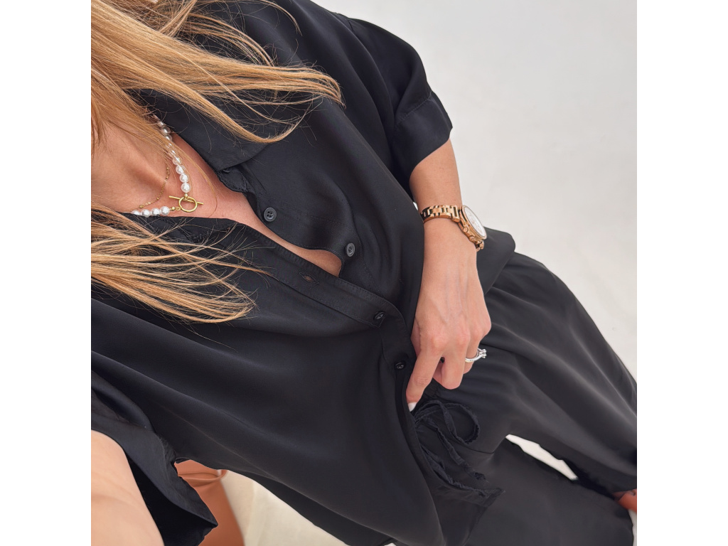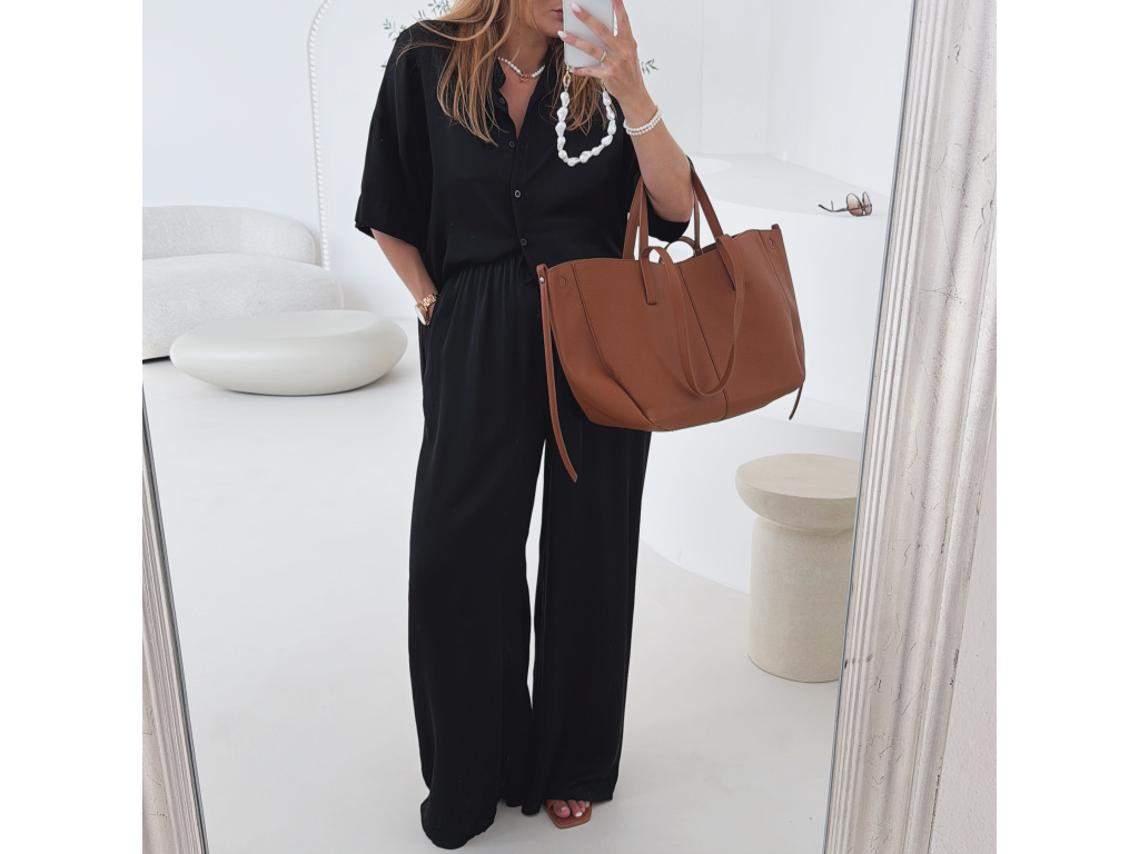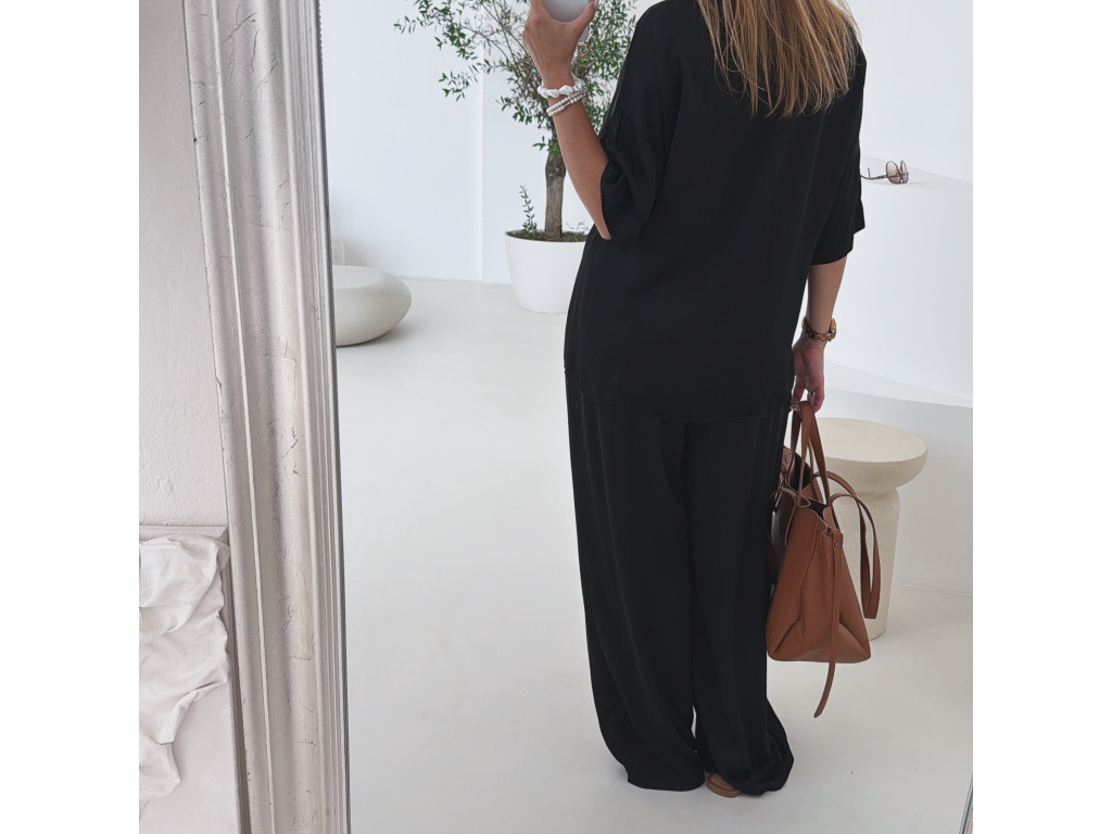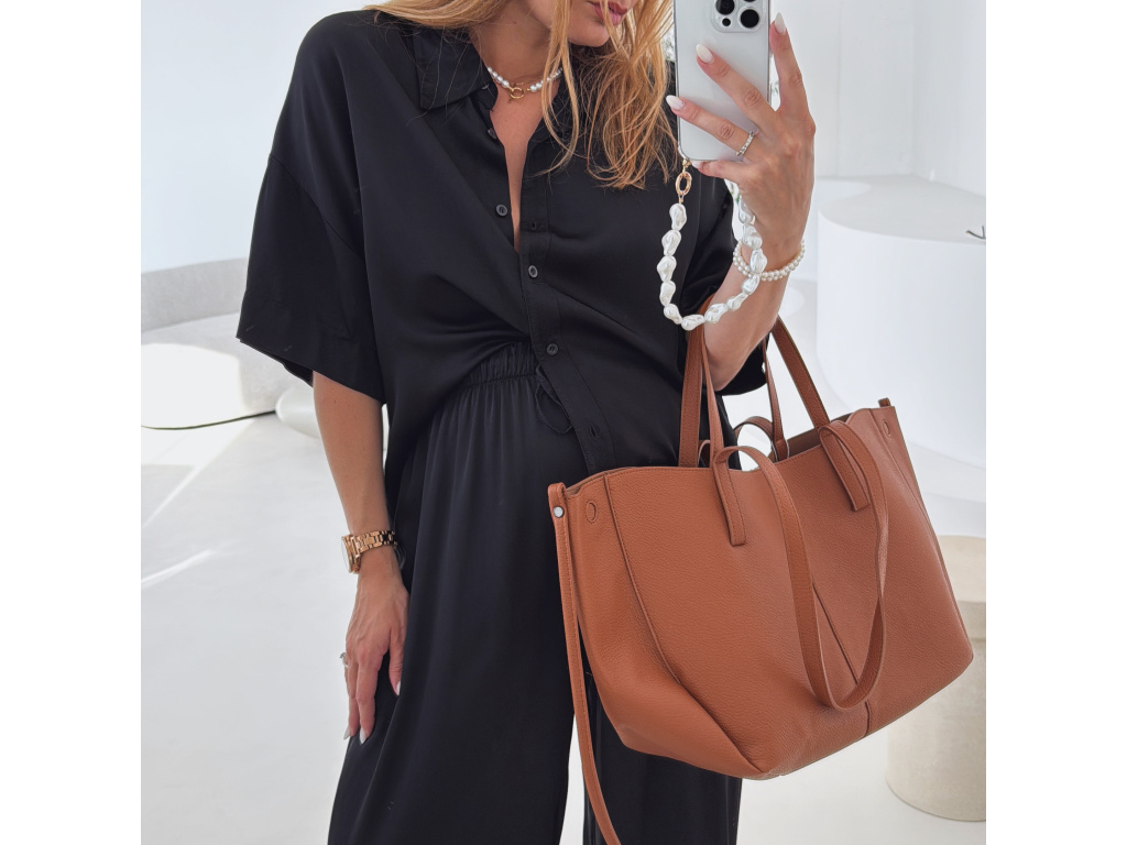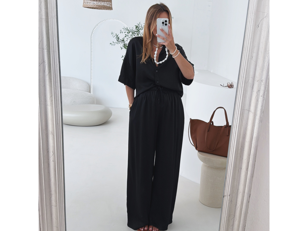 Elegantní a pohodlný set z lesklého materiálu, který dodá outfitu šmrnc i lehkost. Kalhoty s gumou v pase a kapsami zajišťují komfort, zatímco volnější košile na knoflíky v mírně oversize střihu působí ležérně a stylově. Perfektní volba na všední den i speciální příležitosti. Velikost je univerzální, sedí od XS až po menší L.