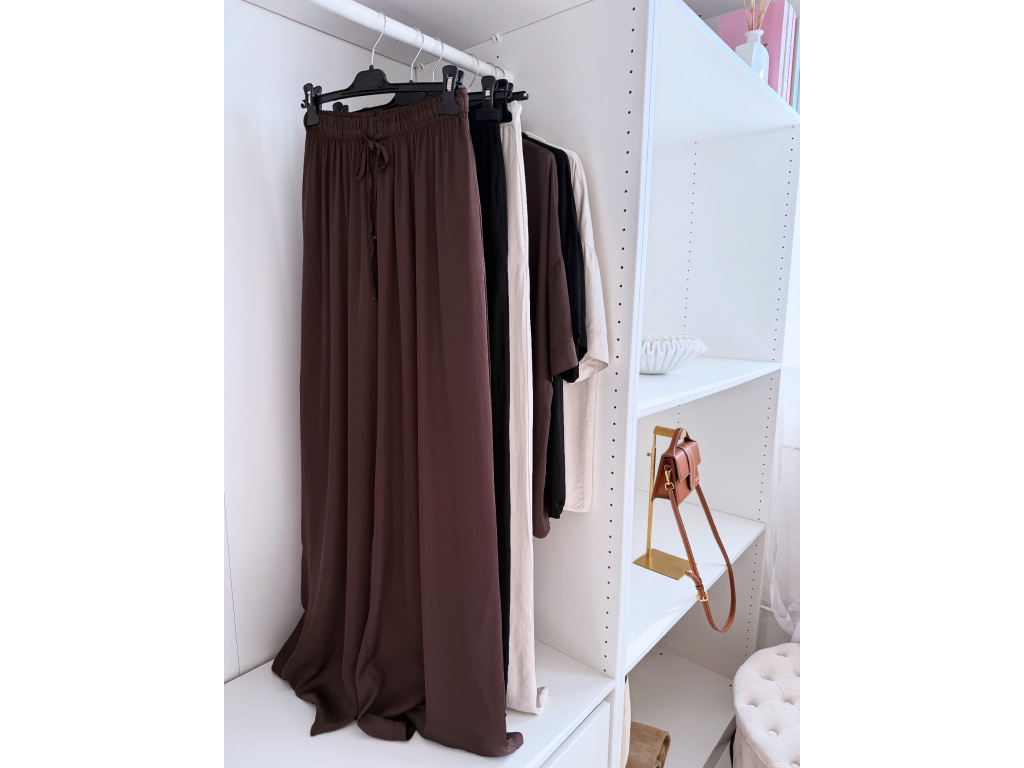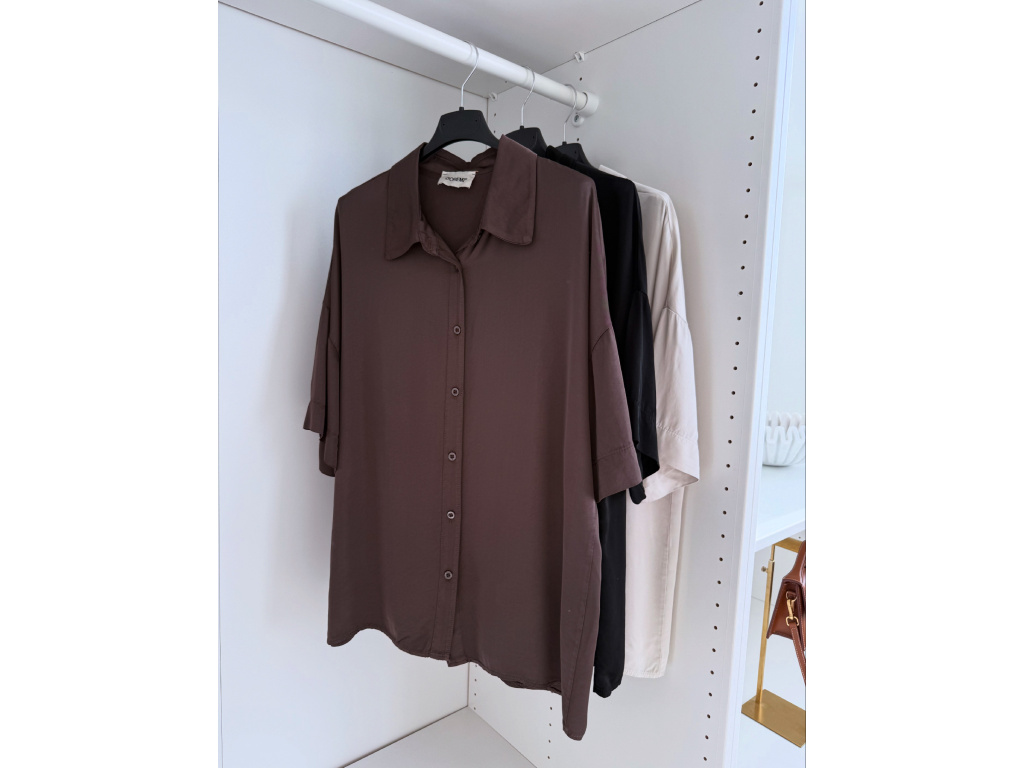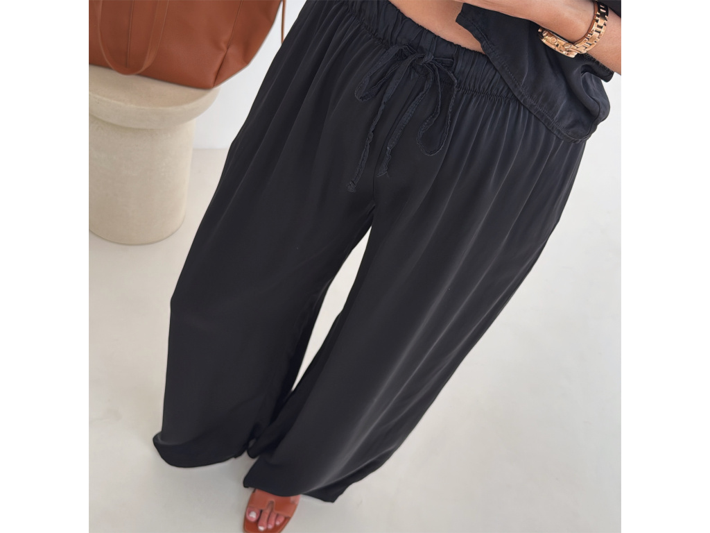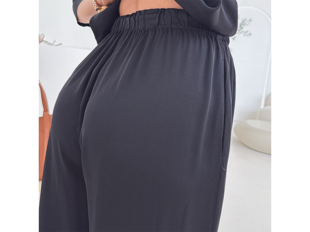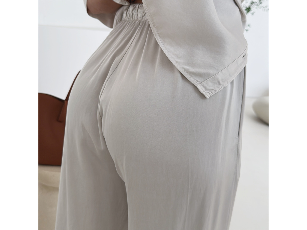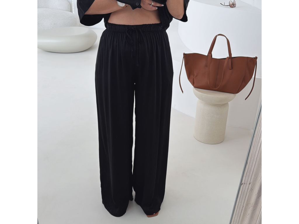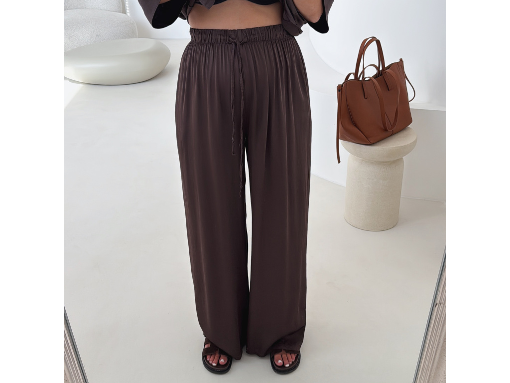 Elegantní a pohodlný set z lesklého materiálu, který dodá outfitu šmrnc i lehkost. Kalhoty s gumou v pase a kapsami zajišťují komfort, zatímco volnější košile na knoflíky v mírně oversize střihu působí ležérně a stylově. Perfektní volba na všední den i speciální příležitosti. Velikost je univerzální, sedí od XS až po menší L.