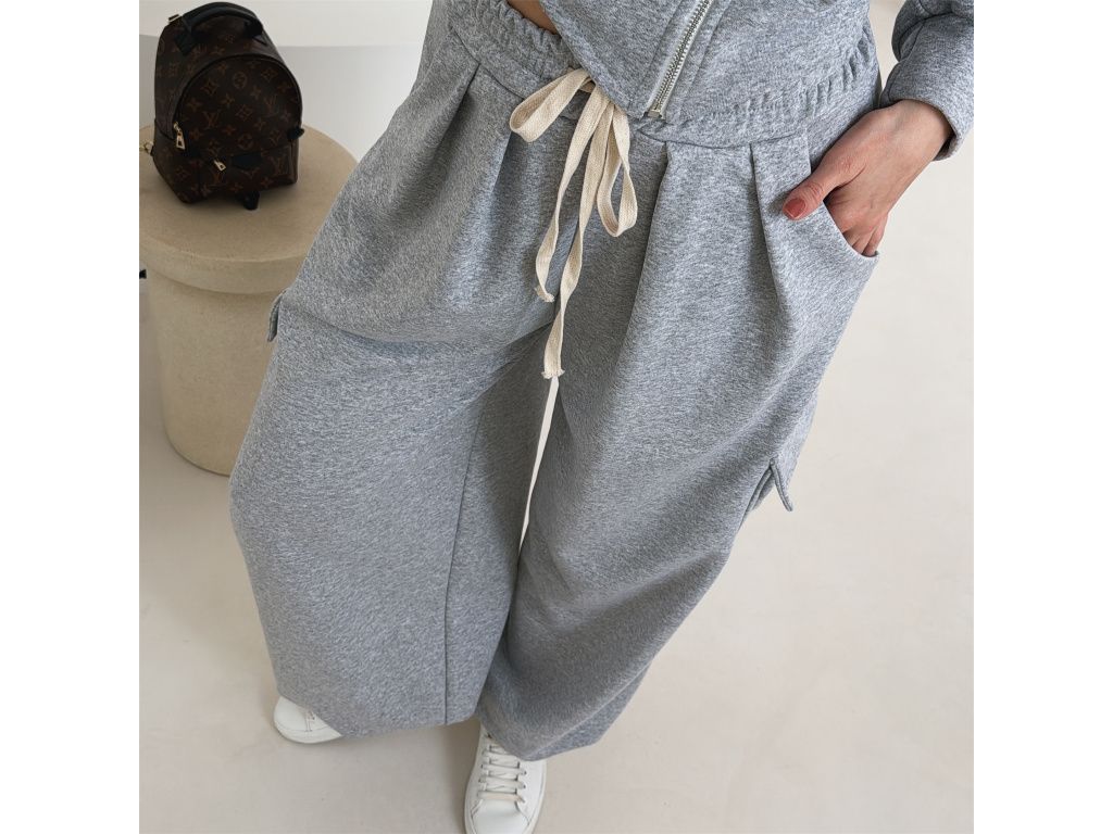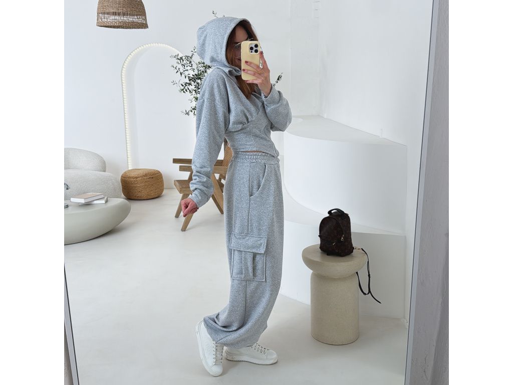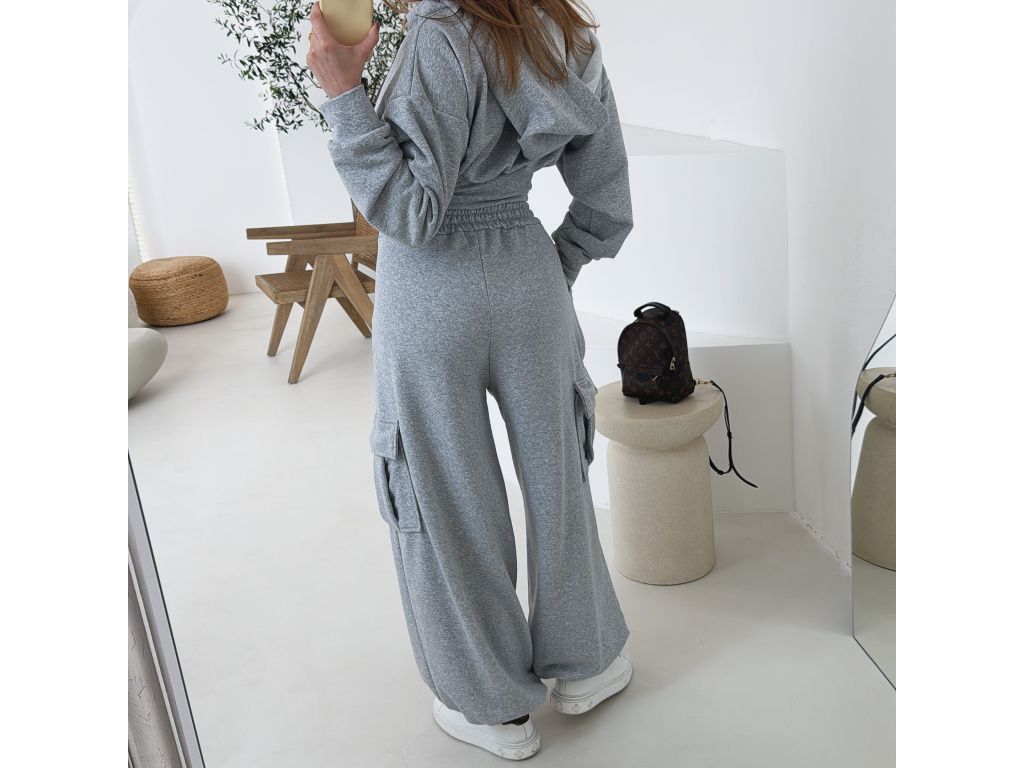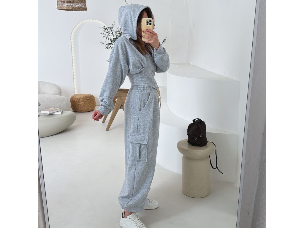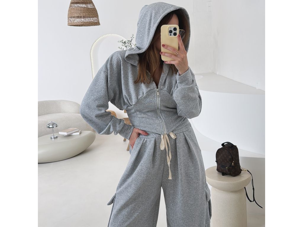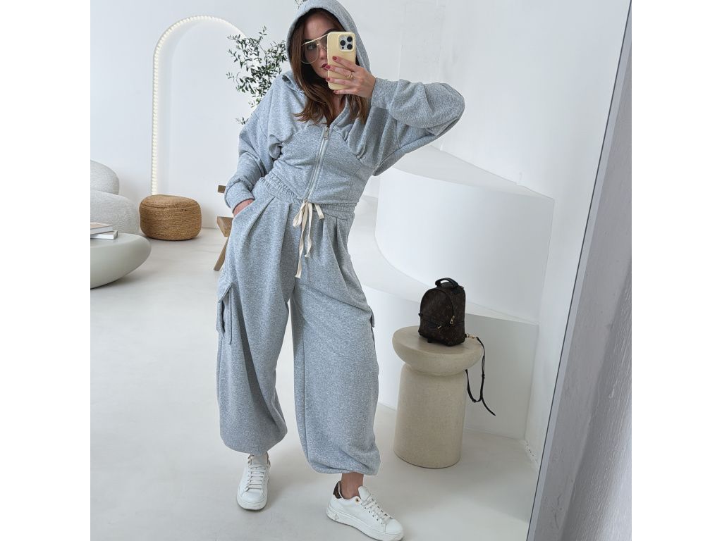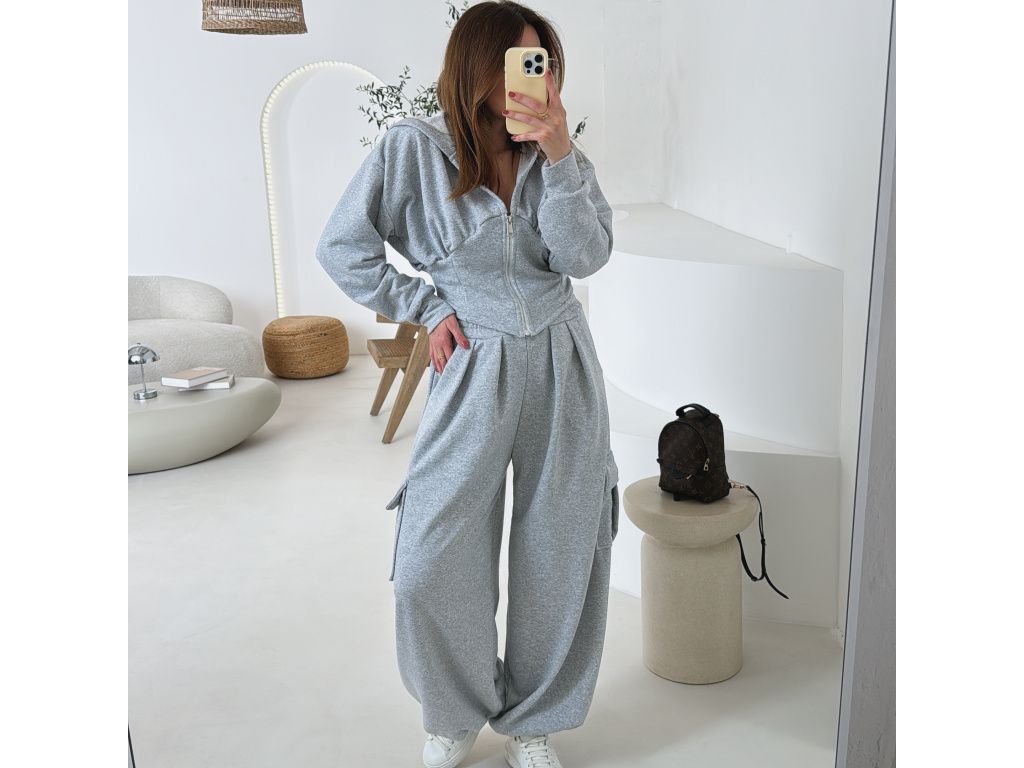 Stylová šedá tepláková souprava, která spojuje maximální pohodlí s moderním designem. Mikina s kapucí má zajímavý, lehce tvarovaný střih a zapínání na zip, díky čemuž krásně sedí na postavě a působí upraveněji než klasická teplákovka. Kalhoty jsou volnějšího střihu s trendy kapsáči, mají praktické kapsy a elastický pas se šňůrkou, takže se snadno přizpůsobí postavě. Ideální set na každodenní nošení – ať už na cestu, pochůzky nebo jen tak pro pohodový den