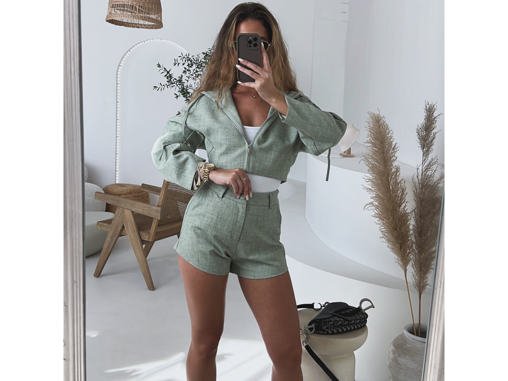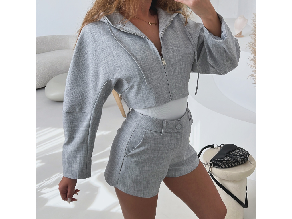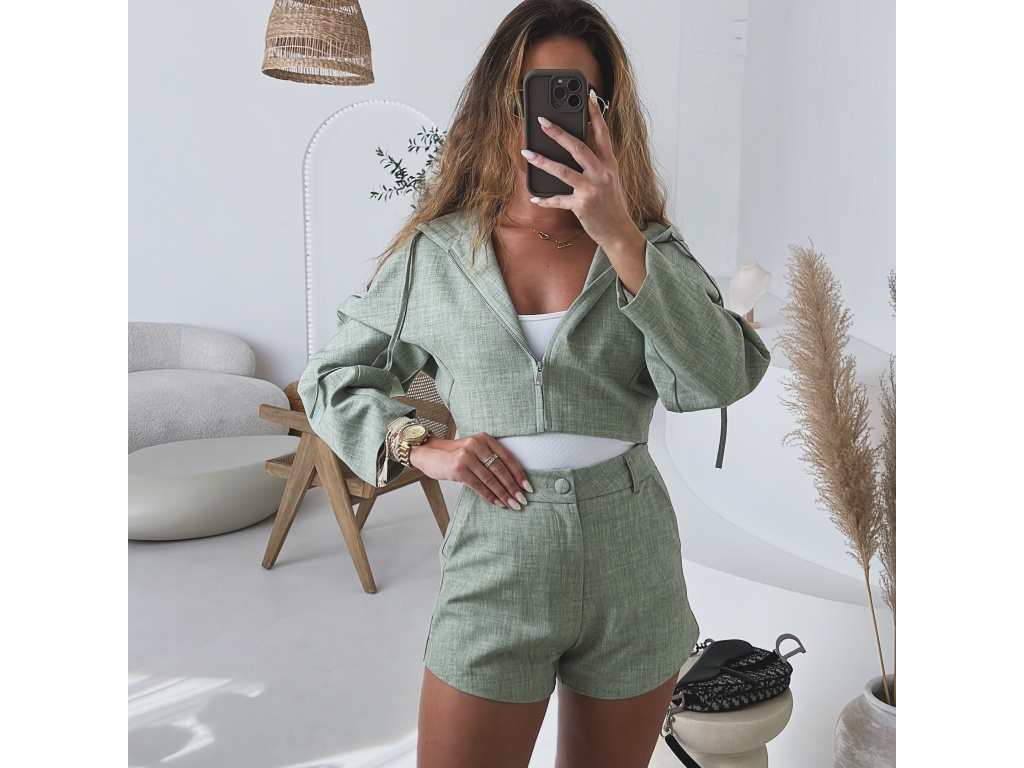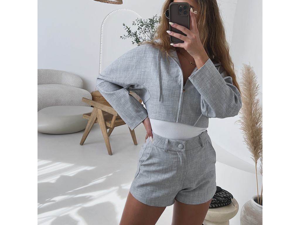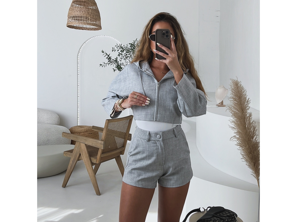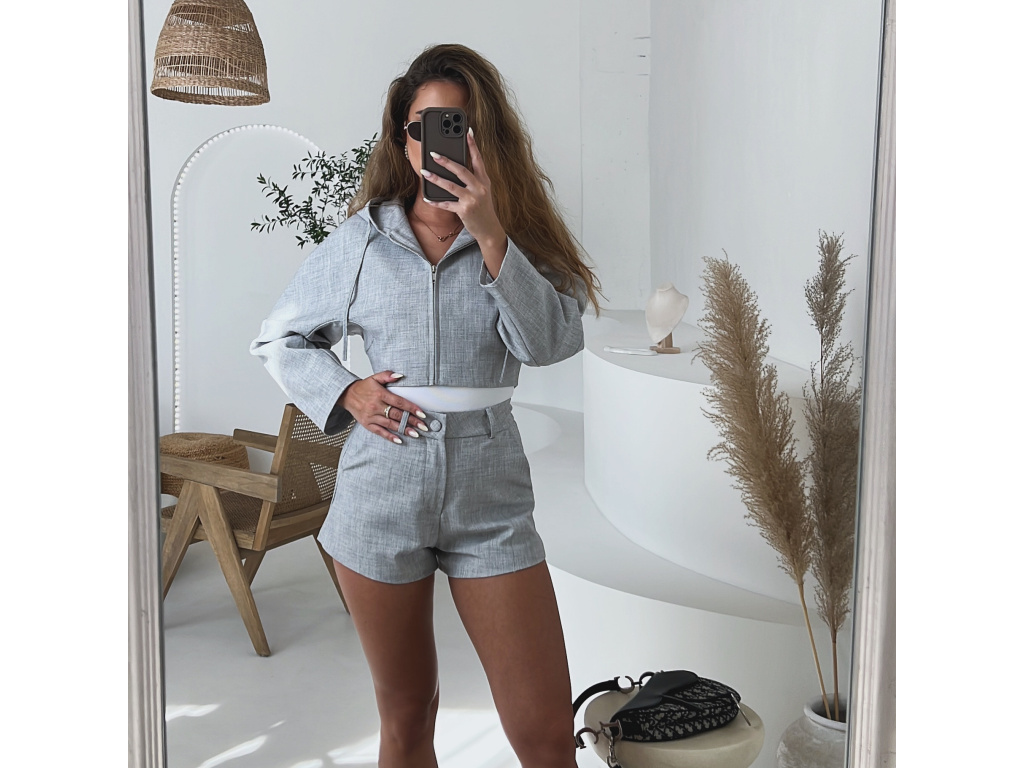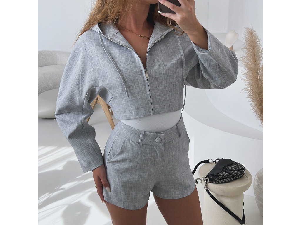 Stylový dámský set tvořený vysokými šortkami a krátkou mikinou s kapucí je perfektní volbou pro moderní a pohodlný look. Krátká mikina se zipem a kapucí spolu se šortkami se zvýšeným pasem, kapsami a poutky na pásek vytváří elegantní a zároveň ležérní kombinaci. Kvalitní příjemný materiál s jemnou strukturou drží tvar a nevytahuje se, takže je ideální pro každodenní nošení i volný čas. Set je dostupný ve dvou elegantních barvách – šedé a zelené – a ve velikostech S, M a L. Tento komplet kombinuje eleganci a pohodlí a je ideální pro ženy, které chtějí vypadat chic a zároveň se cítit komfortně. Set je vč. podšívky.