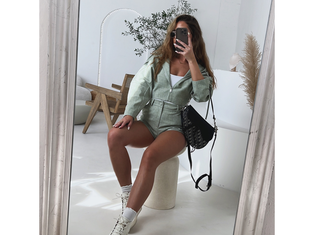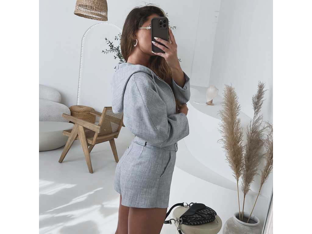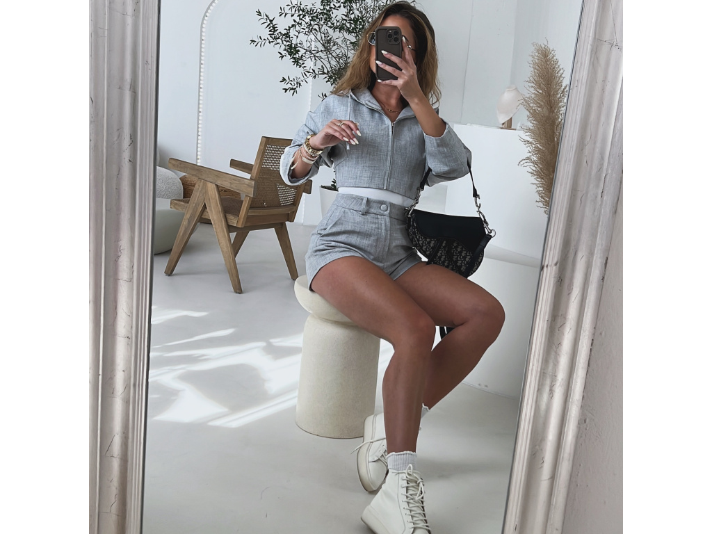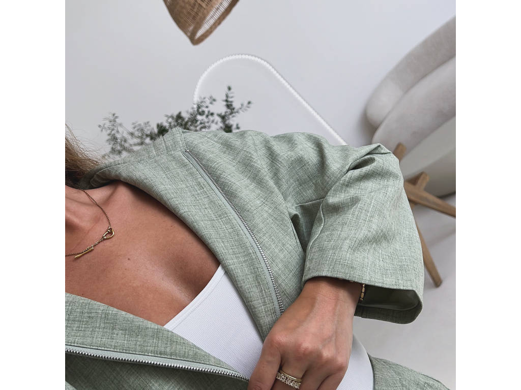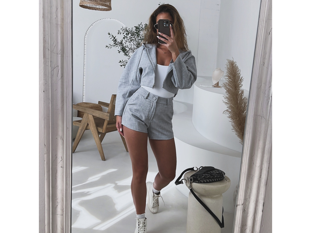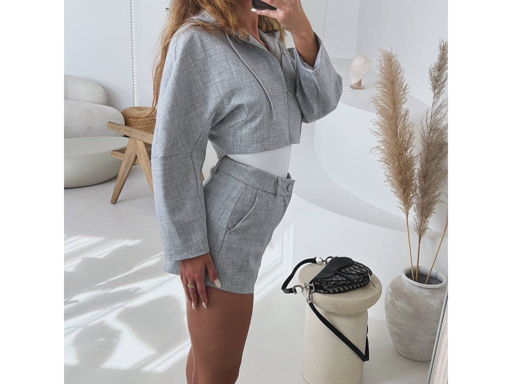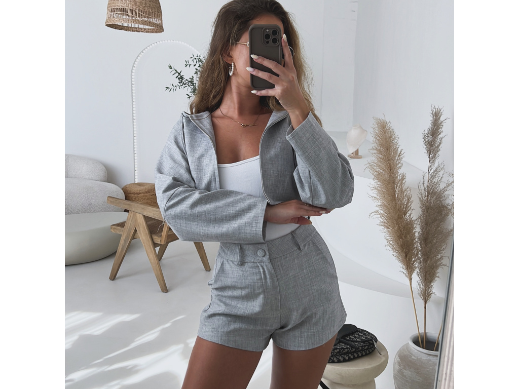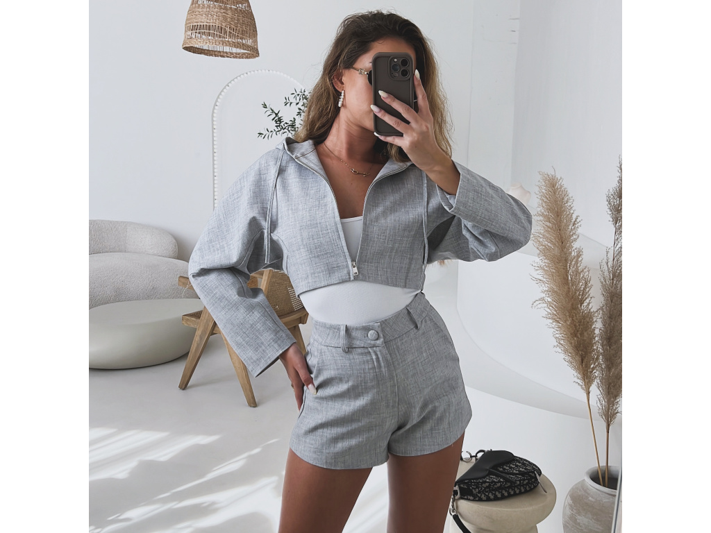Stylový dámský set tvořený vysokými šortkami a krátkou mikinou s kapucí je perfektní volbou pro moderní a pohodlný look. Krátká mikina se zipem a kapucí spolu se šortkami se zvýšeným pasem, kapsami a poutky na pásek vytváří elegantní a zároveň ležérní kombinaci. Kvalitní příjemný materiál s jemnou strukturou drží tvar a nevytahuje se, takže je ideální pro každodenní nošení i volný čas. Set je dostupný ve dvou elegantních barvách – šedé a zelené – a ve velikostech S, M a L. Tento komplet kombinuje eleganci a pohodlí a je ideální pro ženy, které chtějí vypadat chic a zároveň se cítit komfortně. Set je vč. podšívky.