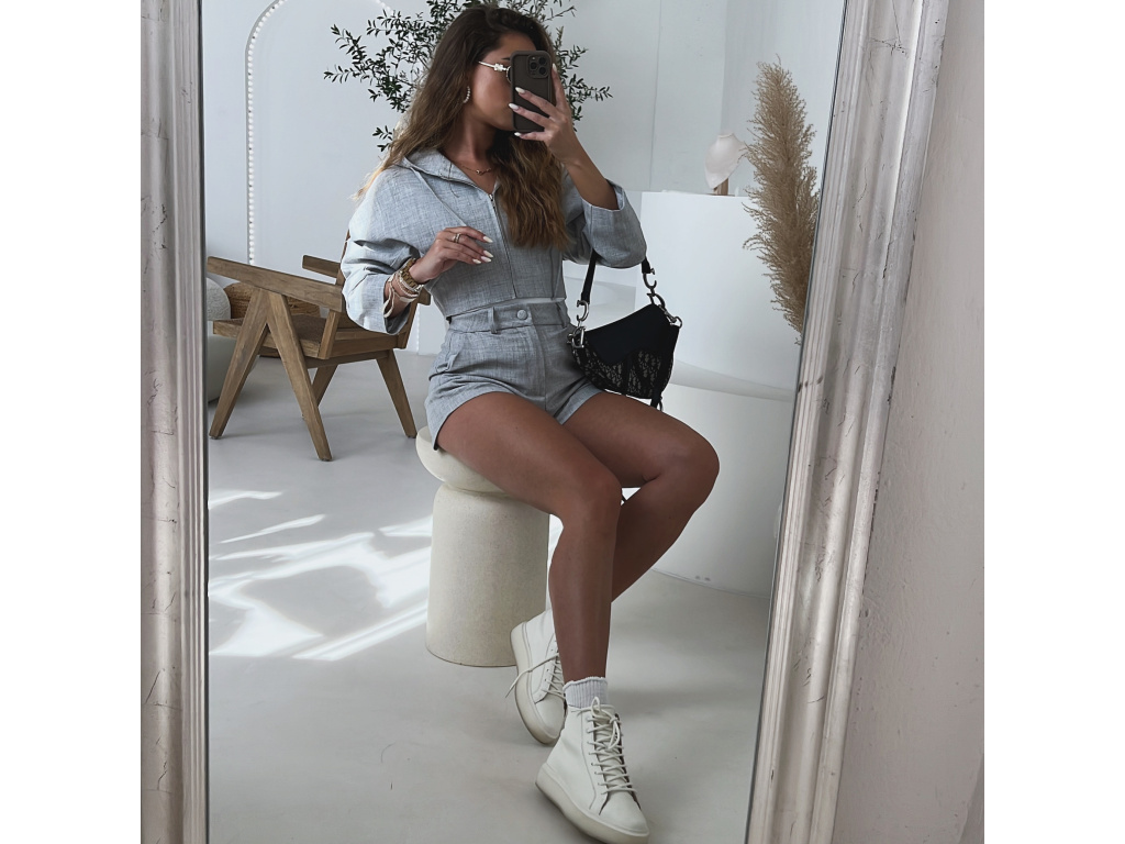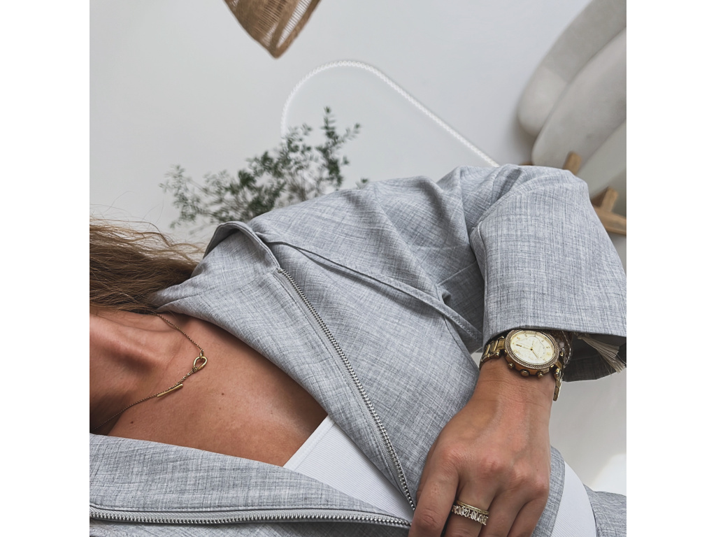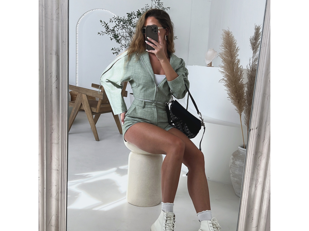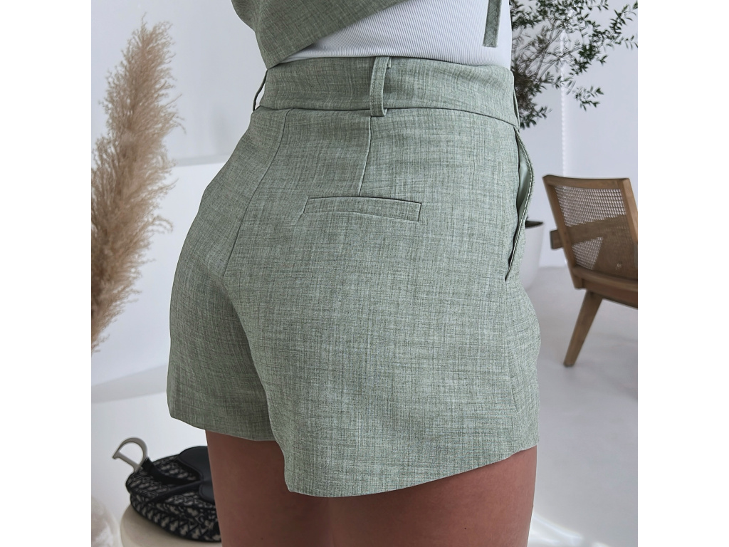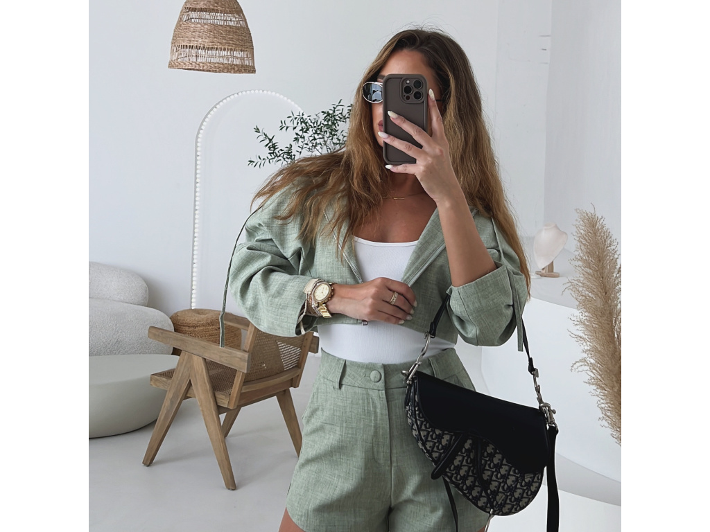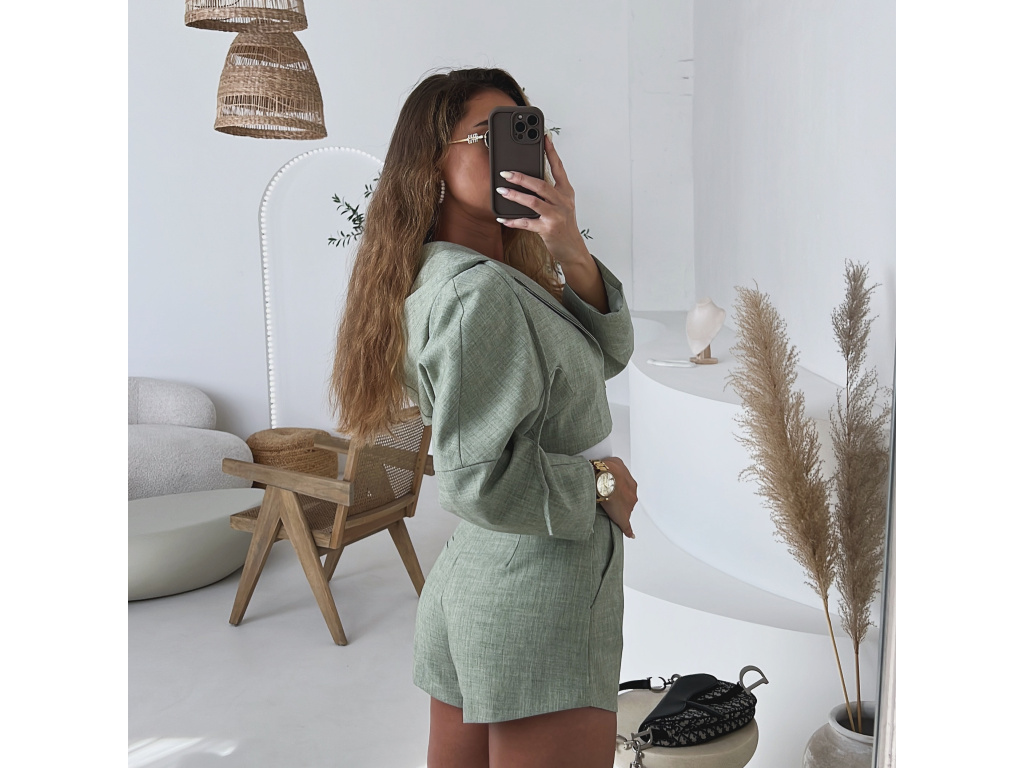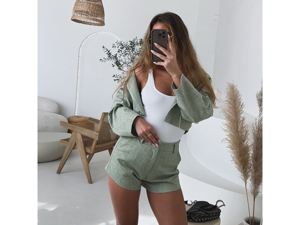 Stylový dámský set tvořený vysokými šortkami a krátkou mikinou s kapucí je perfektní volbou pro moderní a pohodlný look. Krátká mikina se zipem a kapucí spolu se šortkami se zvýšeným pasem, kapsami a poutky na pásek vytváří elegantní a zároveň ležérní kombinaci. Kvalitní příjemný materiál s jemnou strukturou drží tvar a nevytahuje se, takže je ideální pro každodenní nošení i volný čas. Set je dostupný ve dvou elegantních barvách – šedé a zelené – a ve velikostech S, M a L. Tento komplet kombinuje eleganci a pohodlí a je ideální pro ženy, které chtějí vypadat chic a zároveň se cítit komfortně. Set je vč. podšívky.