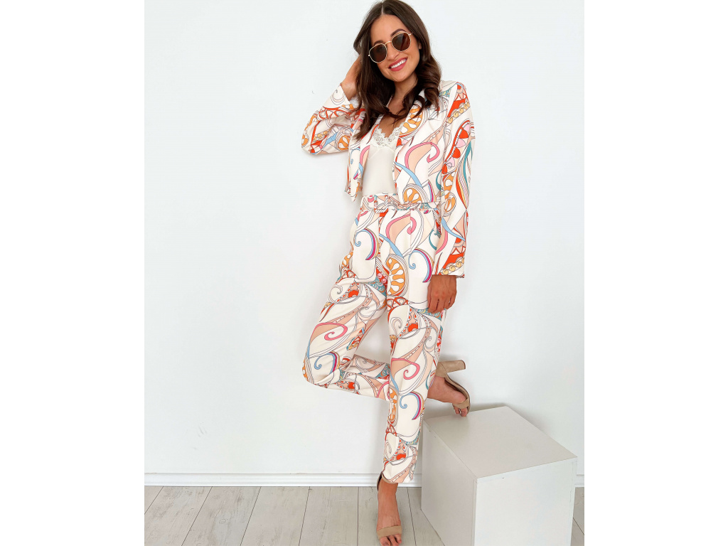 Elegantní set se vzory. Sako má vyztužená ramena. V pase kalhoty hezky pruží. Velikost je univerzální, sedí na XS-M. Set je velice pohodlný na nošení. Foceno je na velikosti S a výšce 170 cm. DOPORUČUJEME! Ohledně rozměrů nás neváhejte kontaktovat.