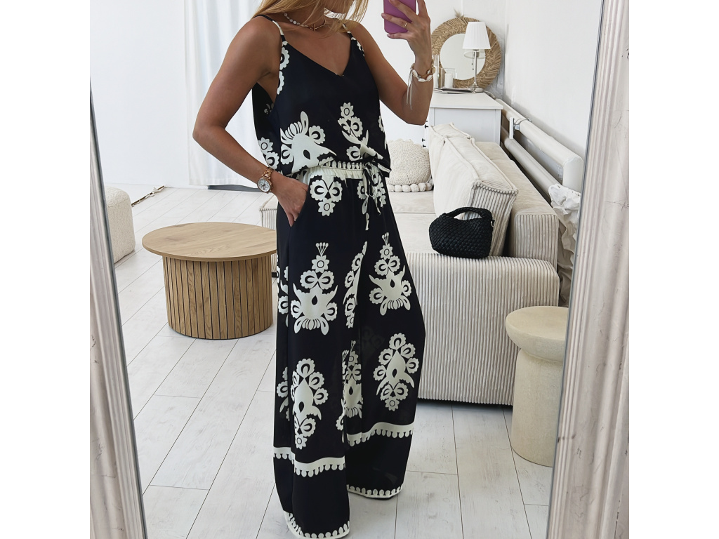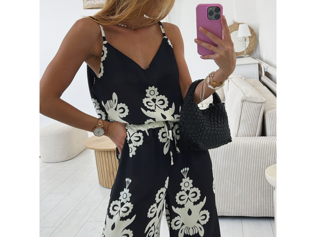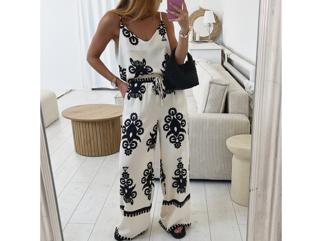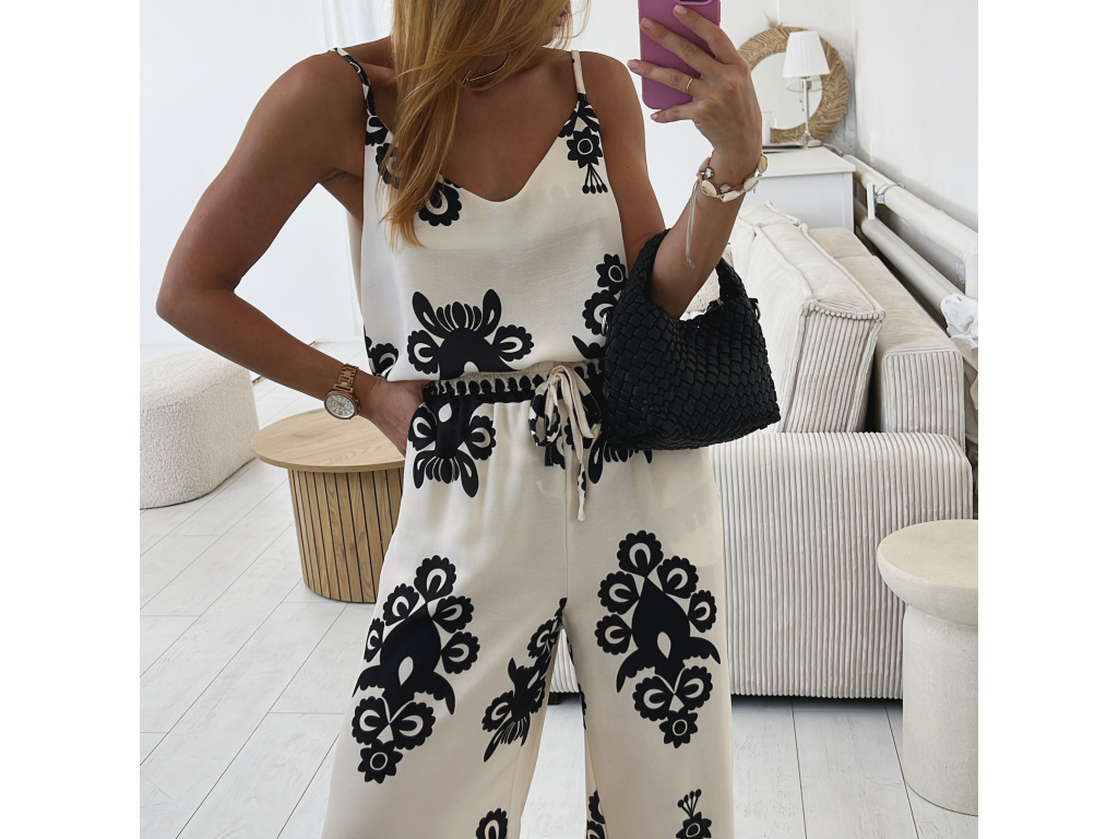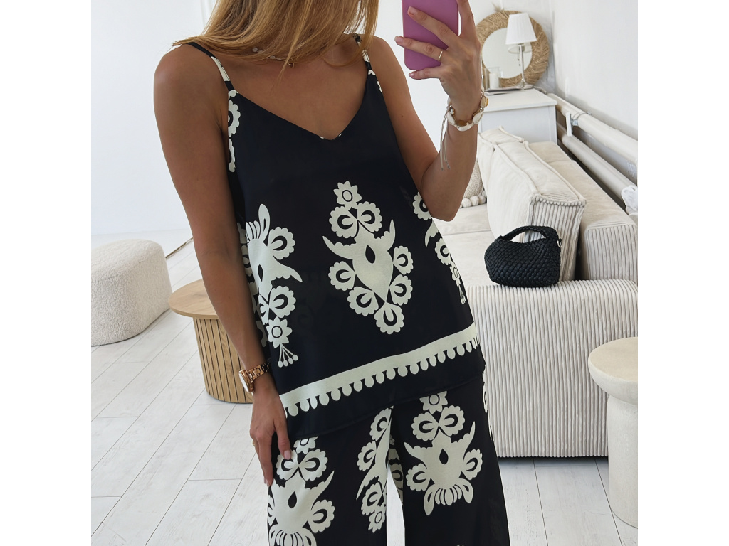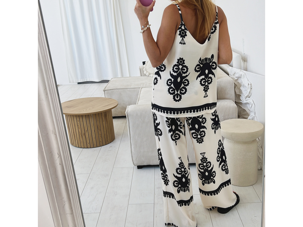 Velice zajímavý set širokých kalhot a nátělníku se vzory v černo-béžové kombinaci. Kalhoty jsou. pase na gumu, která se hezky natáhne. Velikost je univerzální, sedí na XS, S a M. Foceno je na XSku a výšce 165 cm. Set se velice hezky kombinuje a je velice pohodlný na nošení.