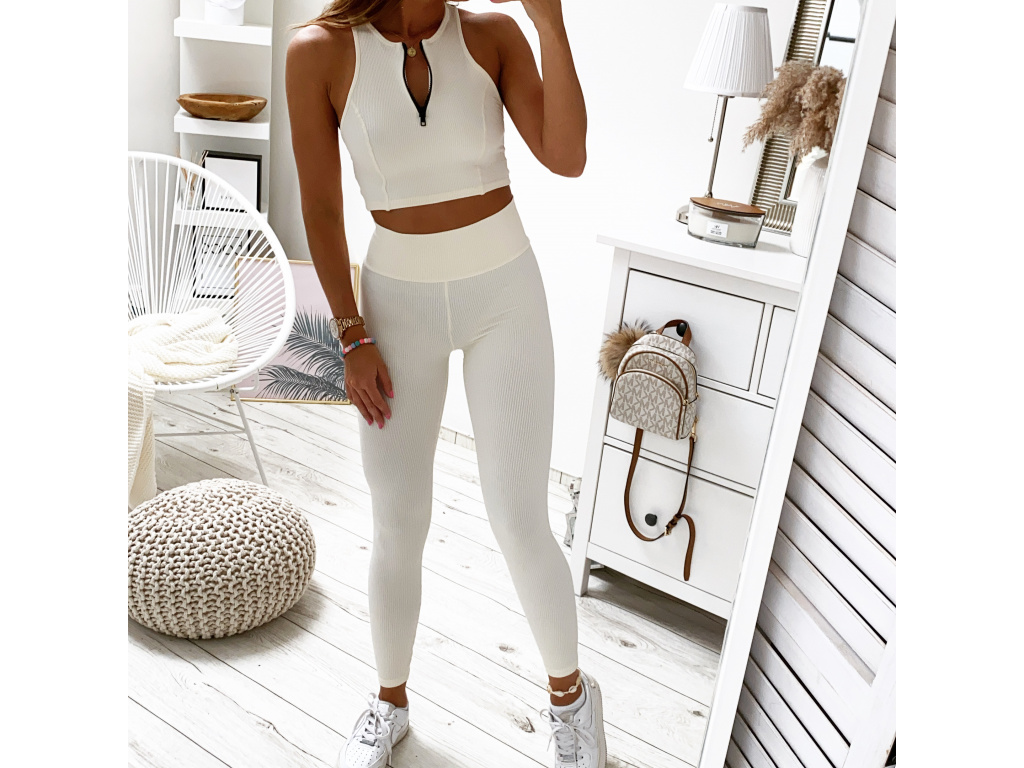Luxusní, sexy set ve smetanové barvě z crop topu a legín do pasu. Materiál je opravdu hodně příjemný a pružný. Má žebrovaný vzor. Dělá super postavu a na nošení je velice pohodlný. Super na denní nošení nebo do fitka. Velikost je S, M a L, sedí o číslo méně (S na XS, M na S a L na M). Od klidného stavu se natáhne až o 10 cm. Velikost S je focena na XSku a výšce 165 cm. DOPORUČUJEME! Ohledně rozměrů nás neváhejte kontaktovat!