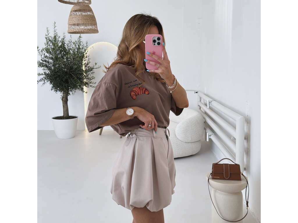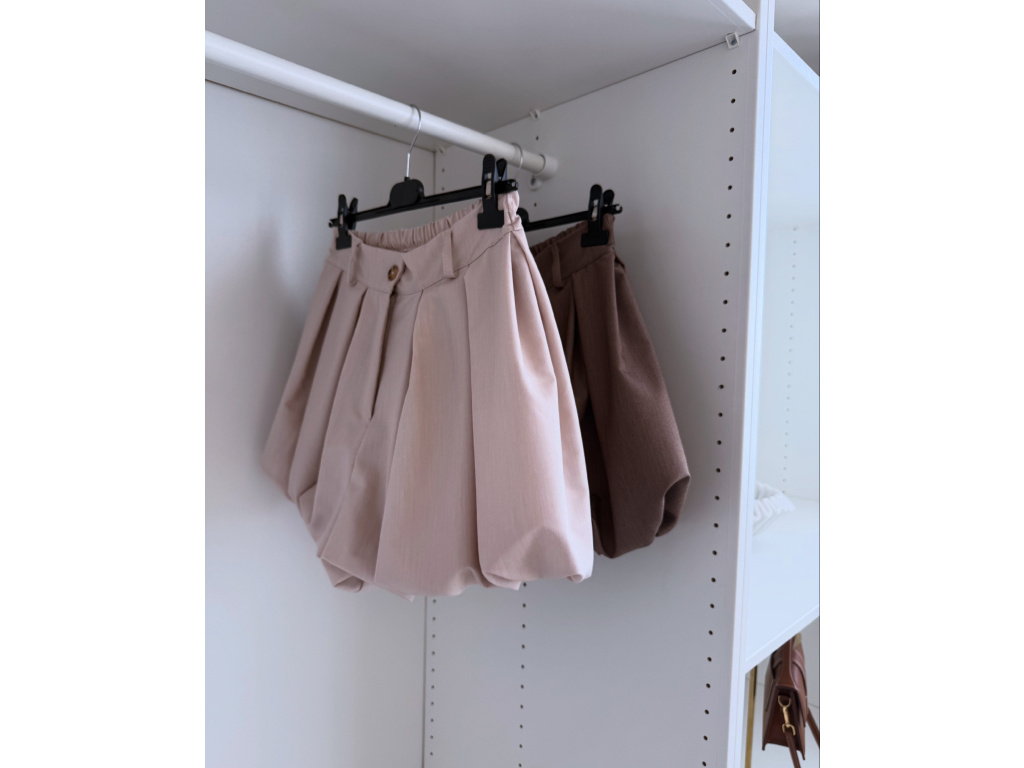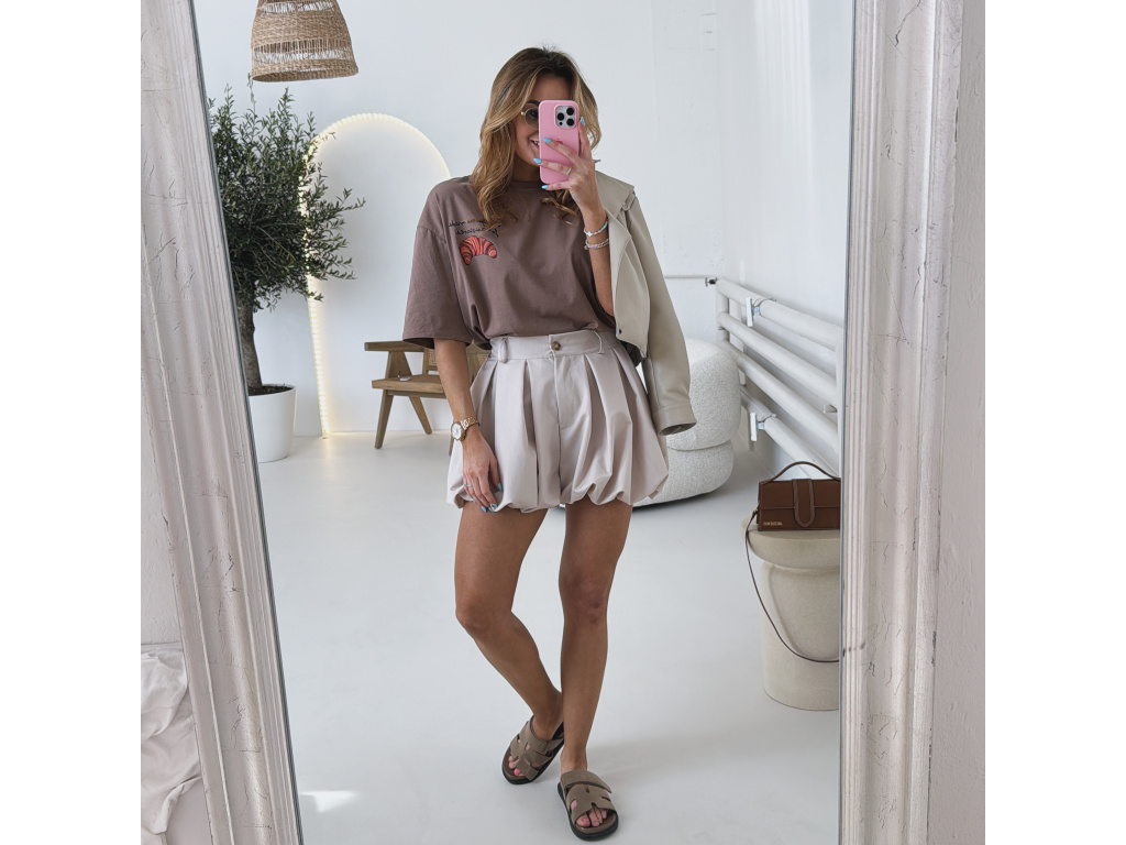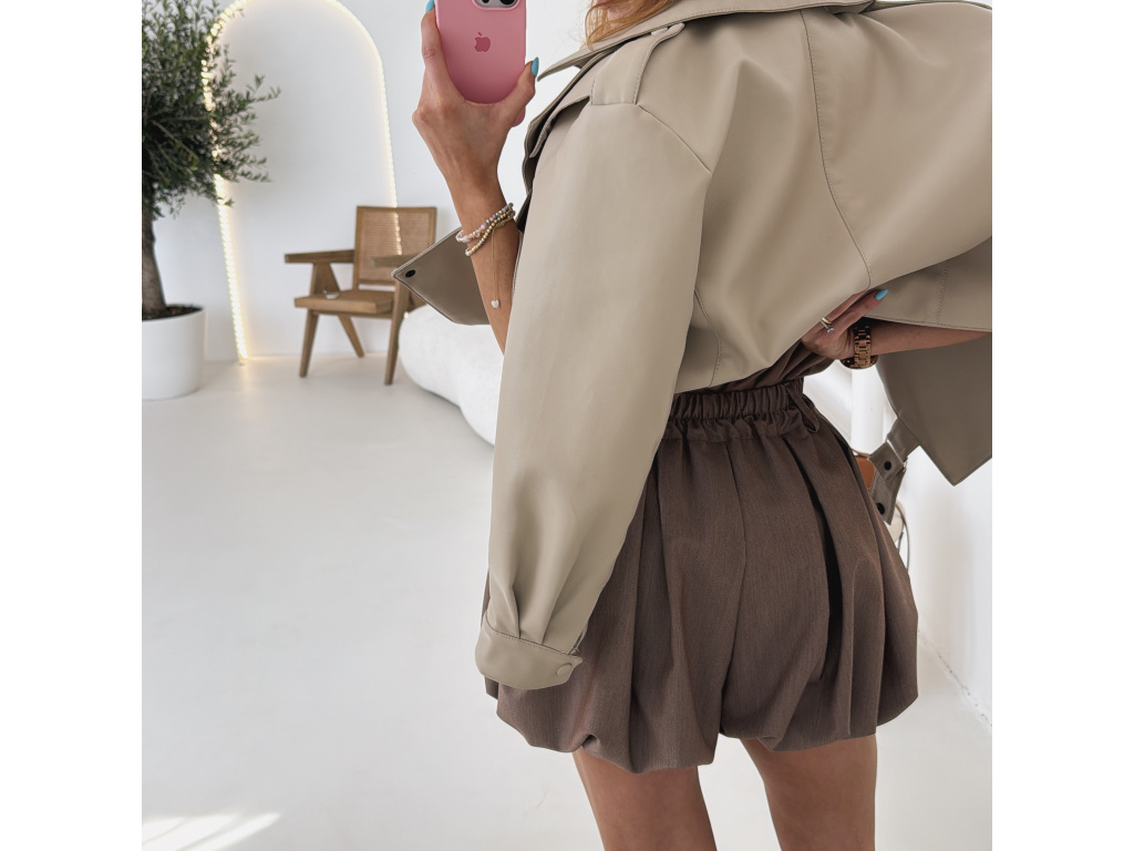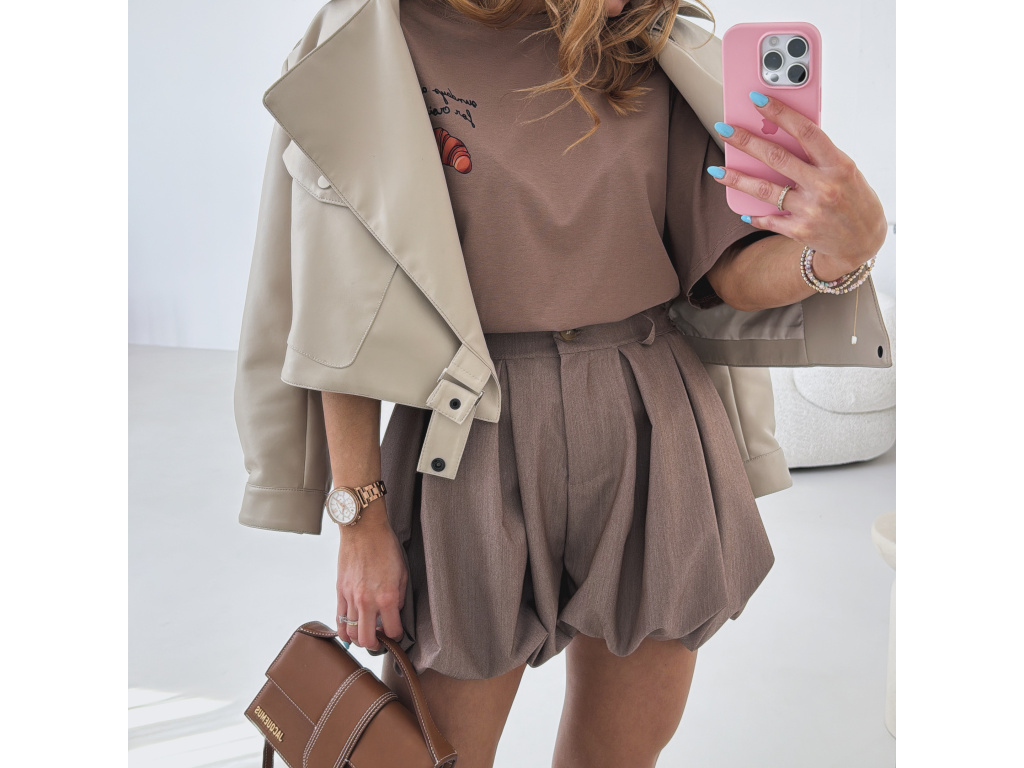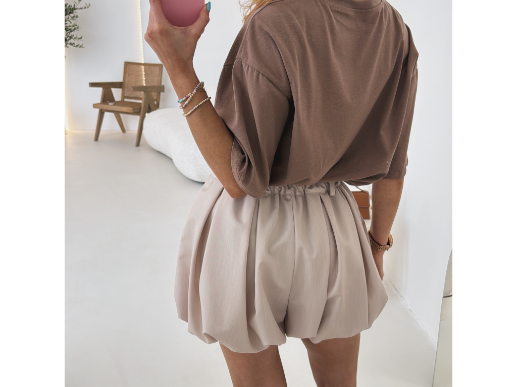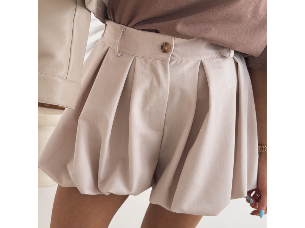 Originální balonové šortky s výraznými sklady a volnějším střihem, které dodají outfitu neotřelý šik vzhled. Vysoký pas a zapínání na knoflík krásně zvýrazní siluetu. Dostupné v béžové a hnědé barvě – ideální pro kombinaci s basic topy i elegantními halenkami. V pase šortky ze zadní strany hezky pruží. Šortky mají uvnitř podšívku. Velikost je univerzální, sedí nejlépe na XS-M. Foceno je na velikosti XS a výšce 165 cm.