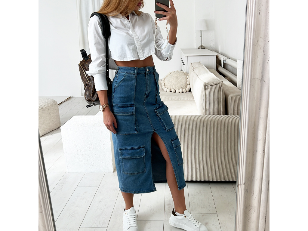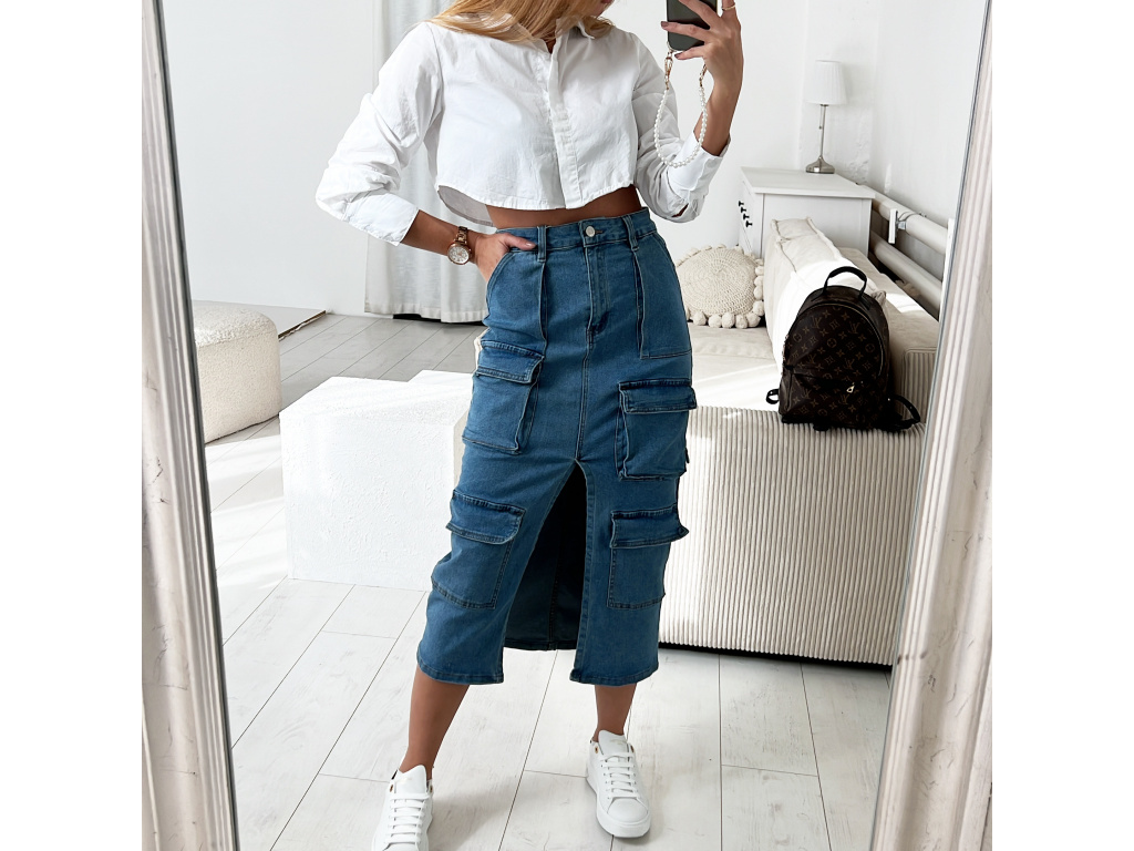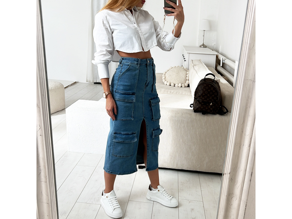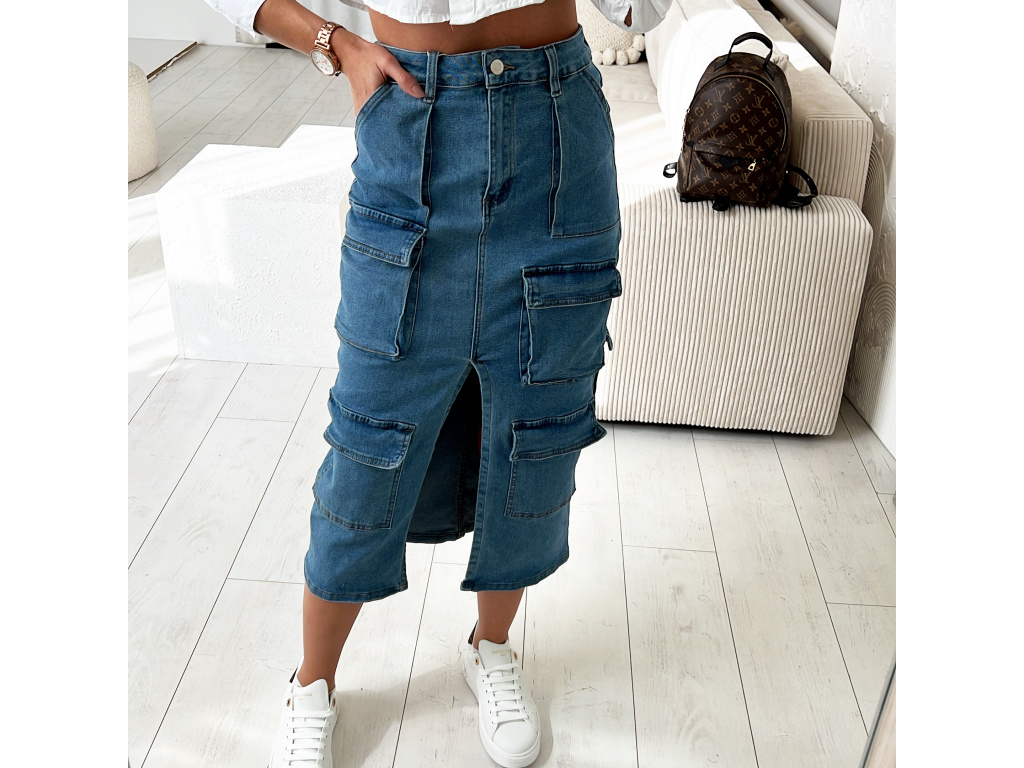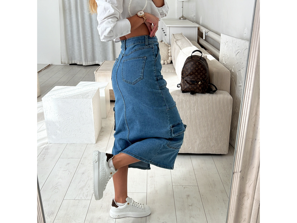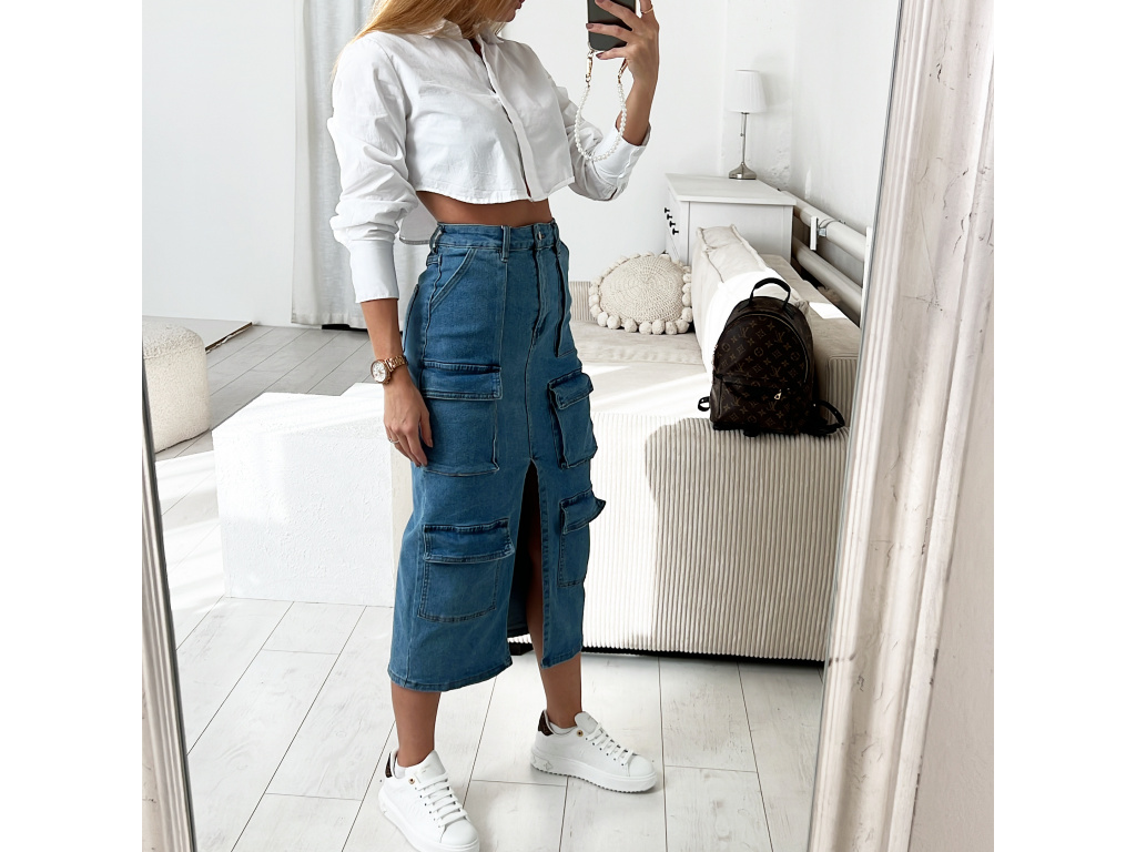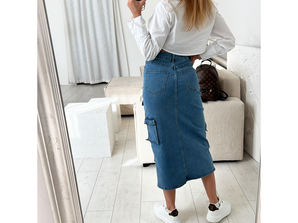 Luxusní, denim kapsáčová sukně v modré barvě v prodloužené midi délce s rozparkem. Materiál je příjemný a pružný. Velikost je XS, S, M, L a XL. Velikosti odpovídají běžným velikostem. Velikost XS je focena na XSku na výšce 165 cm. DOPORUČUJI! Ohledně rozměrů nás neváhejte kontaktovat.