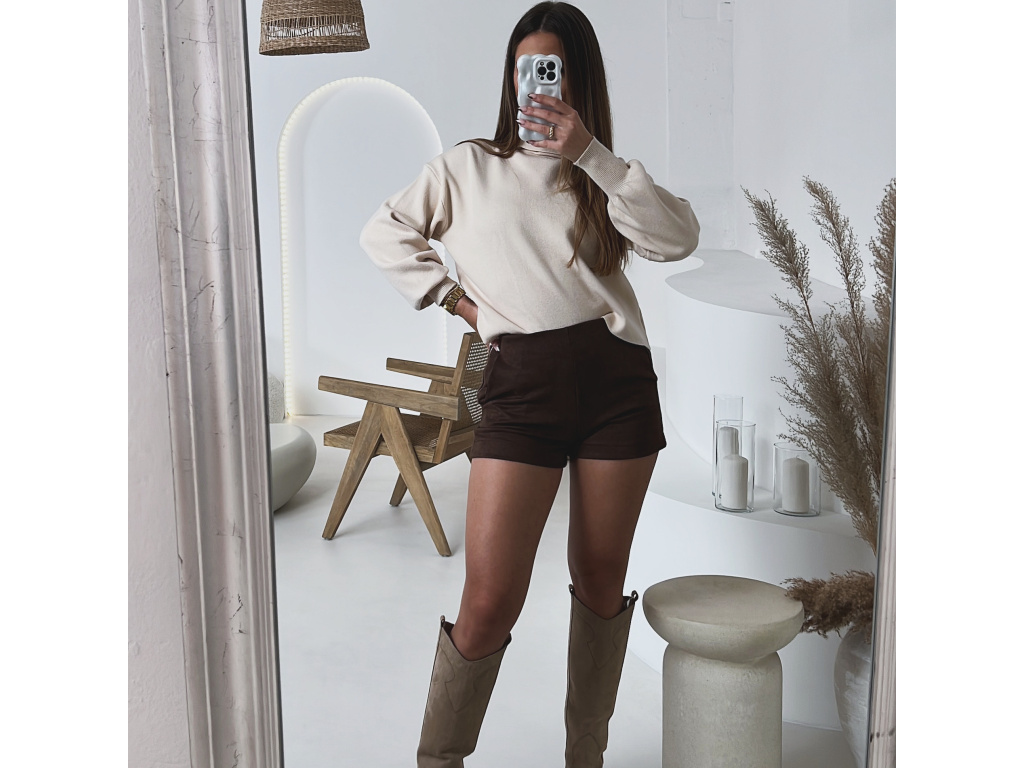 Elegantní semišové šortky Semory v hnědém odstínu jsou ideální volbou pro podzimní i jarní outfity. Měkký semišový materiál působí luxusně a příjemně na dotek. Praktické boční zapínání na zip zajišťuje pohodlné oblékání a perfektní padnutí. Šortky mají kapsy.