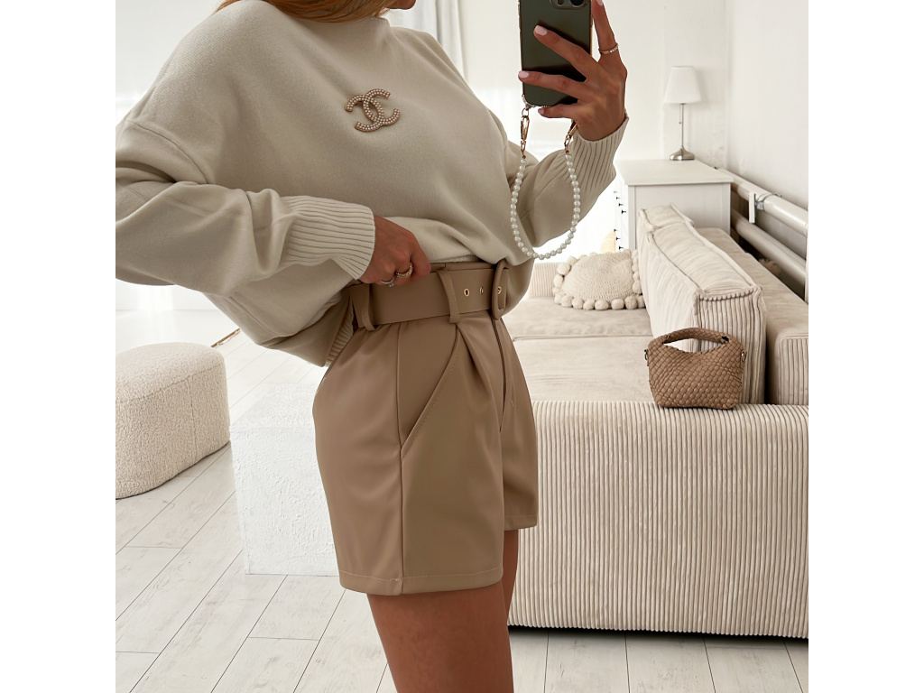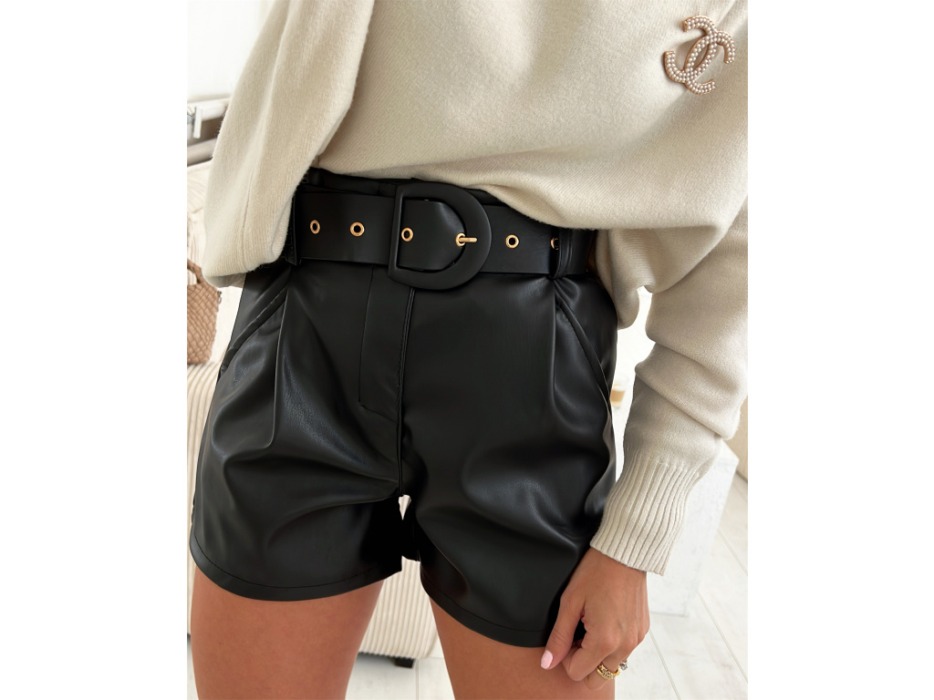 Elegantní šortky z eko kůže s páskem se sponou ve tvaru D. Barva je černá, béžová a khaki. Šortky v pase hezky pruží a natáhnou se až o 10 cm, mají kapsy a zapínání na uzávěr. Pásek u šortek není určen k praní v pračce. Velikost je S, M a L, sedí o číslo méně (S na XS, M na S a L na M). Velikost S je focena na XSku a výšce 165 cm.