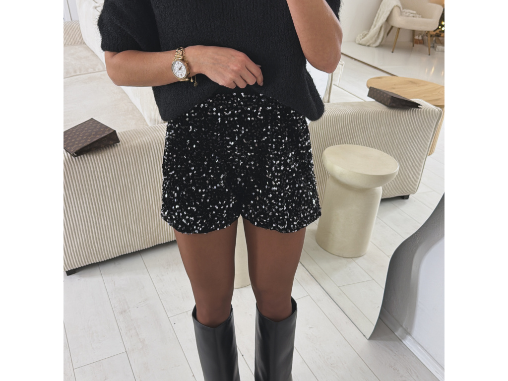 Sexy a zároveň elegantní, výrazné šortky ze sametového materiálu posety flitry v černé a šedé barvě s podšívkou a gumou v pase. Jsou elastické. Velikost je univerzální, sedí na XS, S a M. Foceno je na XSku a výšce 165 cm.