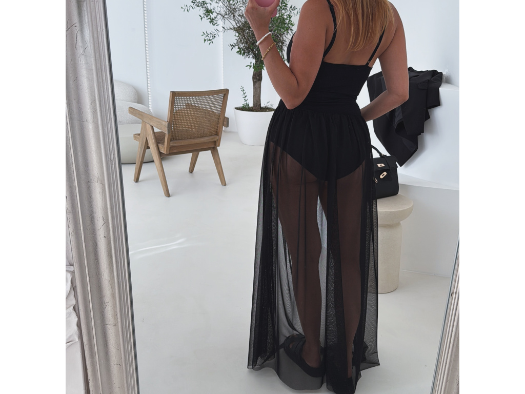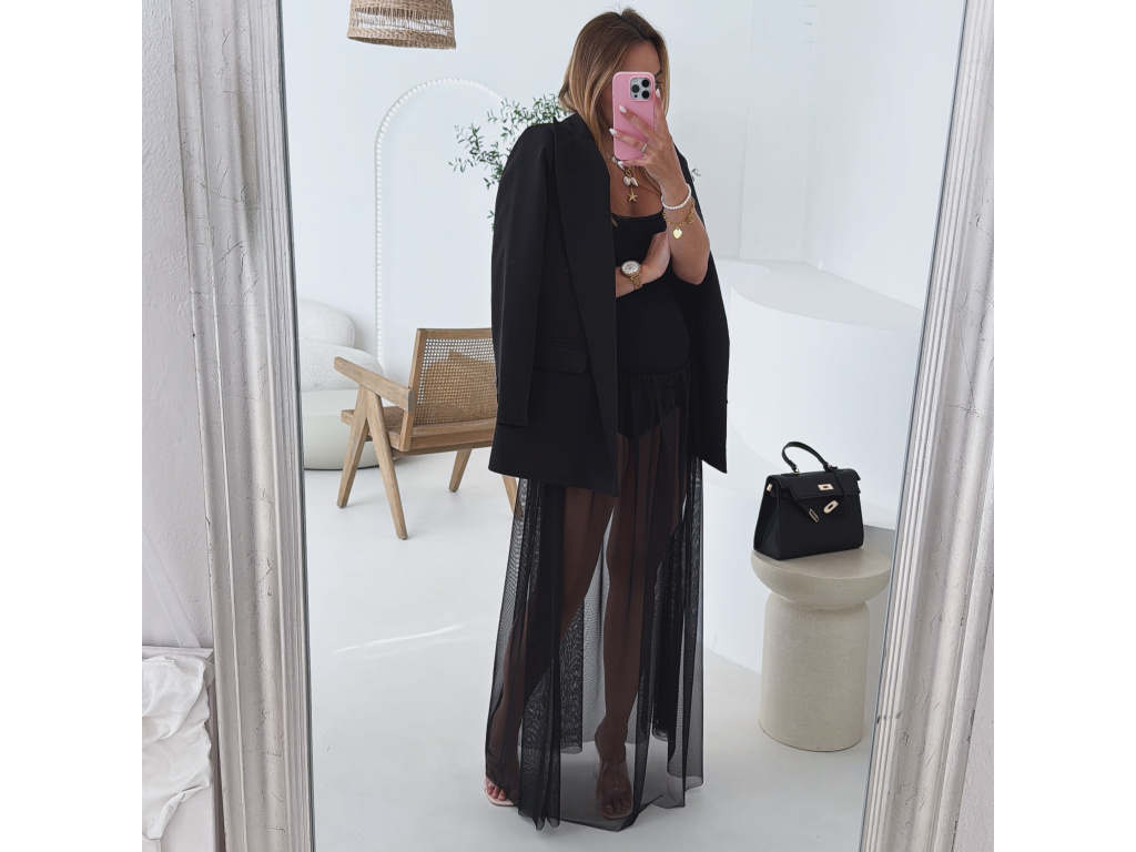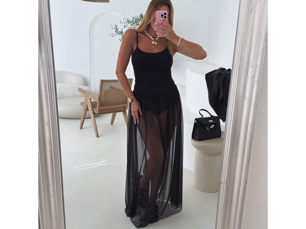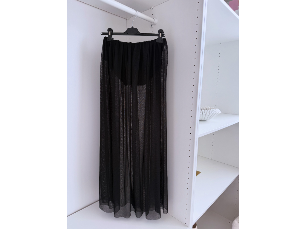 Elegantní dlouhá sukně z jemného průsvitného tylu s pružným pasem do gumy. Uvnitř je pohodlná kalhotková podšívka, která dodává sukni moderní a sexy vzhled. Ideální na letní večírky, dovolené i festivaly – snadno ji zkombinujete s body nebo crop topem. Velikost je univerzální, sedí na XS, S a M.